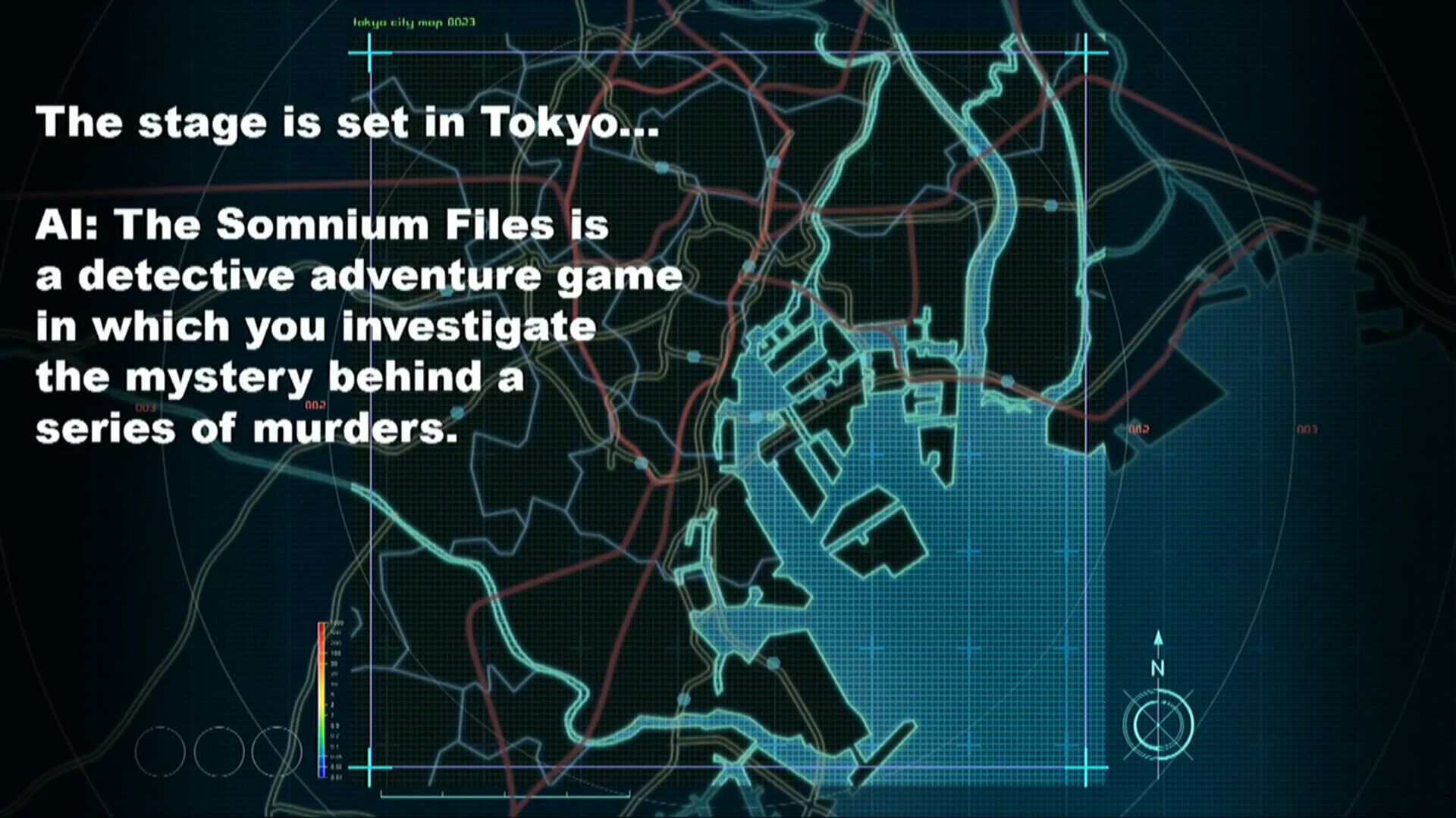 AI : The Somnium Files est un jeu d'aventure imaginé par Kotaro Uchikoshi avec un character design de Yusuke Kozaki. L’histoire se déroule au sein d'un Tokyo technologiquement très avancé mais dans un futur proche de notre époque et avec des éléments du monde réel, au Japon. AI : The Somnium Files est décrit comme un jeu d’aventure policier dans lequel il faudra enquêter sur le mystère derrière une série de meurtres dans un Tokyo moderne et technologiquement avancé. Le premier meurtre présenté est décrit comme un cas étrange, où l’œil gauche de la victime, une femme poignardée à plusieurs reprises, a été arraché du crâne. Le corps a été retrouvé dans un parc d’attractions abandonné, laissé sur le cheval d’un manège. Les joueurs incarnent le détective Kaname Date du Metropolitan Police Department, qui est sur la piste de l’auteur de ces meurtres, nommé Cyclops Serial Killer. Lorsqu’il découvre le corps au sein du parc d’attractions abandonné, il parvient à reconnaître la victime, mais sans savoir pourquoi. Soudainement, il entend un bruit étrange provenant du manège. Il décide alors d’y entrer, et trouve une jeune fille avec un pic de glace ensanglanté dans ses mains… L’œil gauche de Date contient une intelligence artificielle qu’il utilise pour résoudre des crimes. Cette IA a une grande particularité : elle a la capacité de s’introduire dans les souvenirs des personnes pour y extraire des informations. Ces souvenirs apparaissent comme des paysages que l’on voit dans des rêves. Dans le jeu, il est possible d’entrer dans ces paysages, qui sont appelés Somnium.