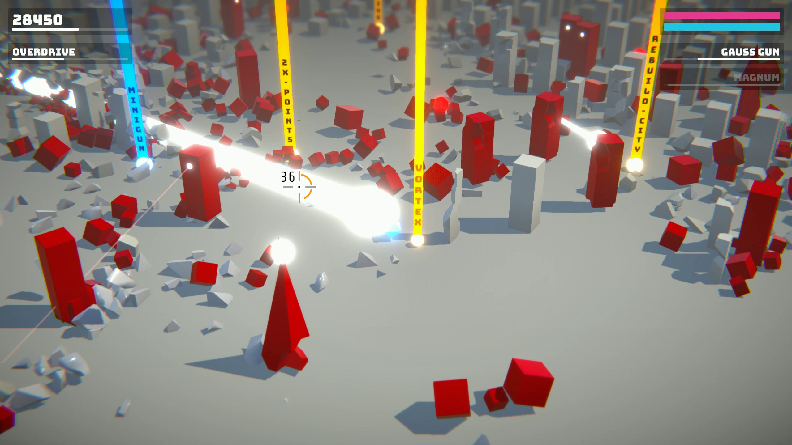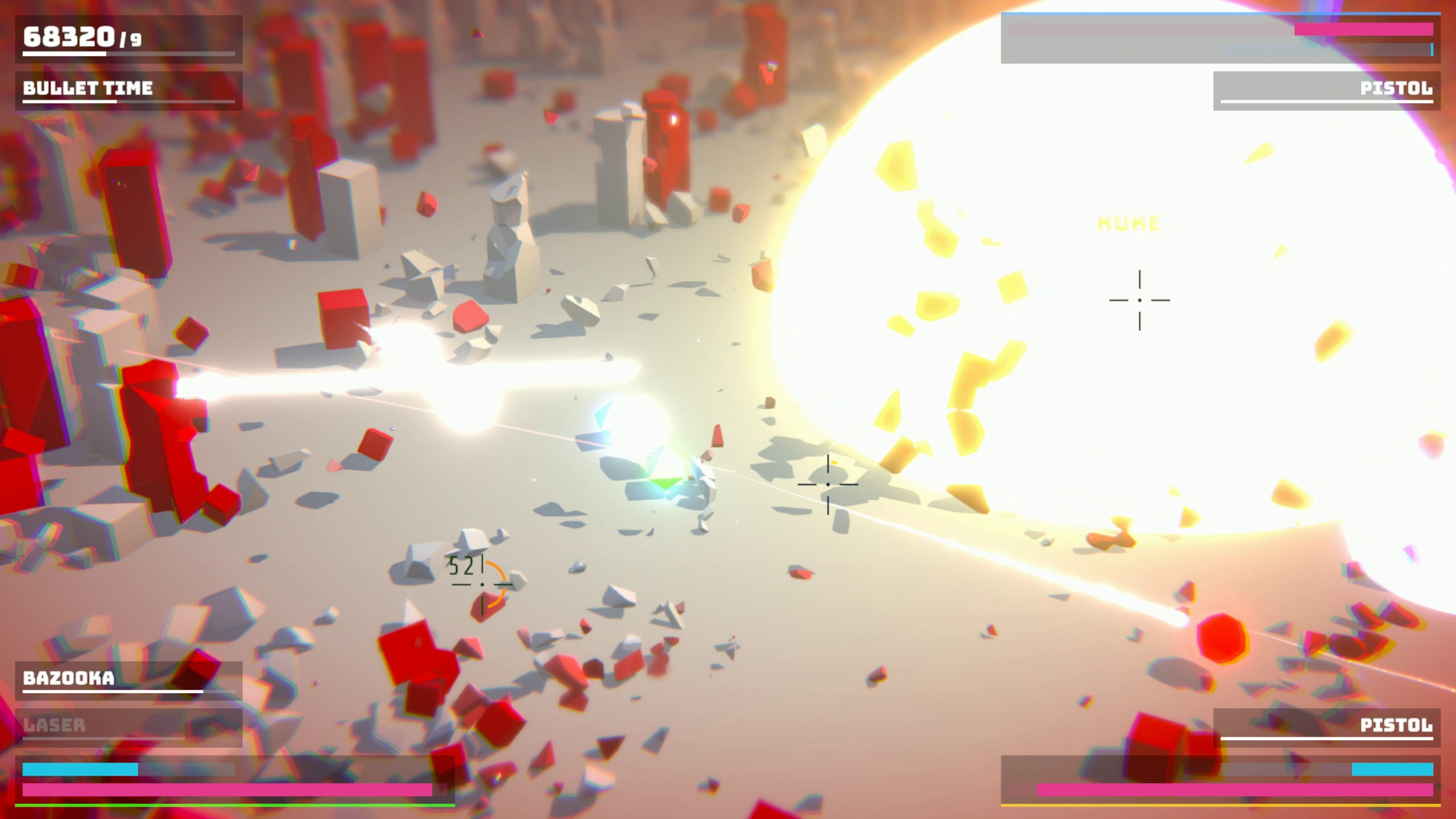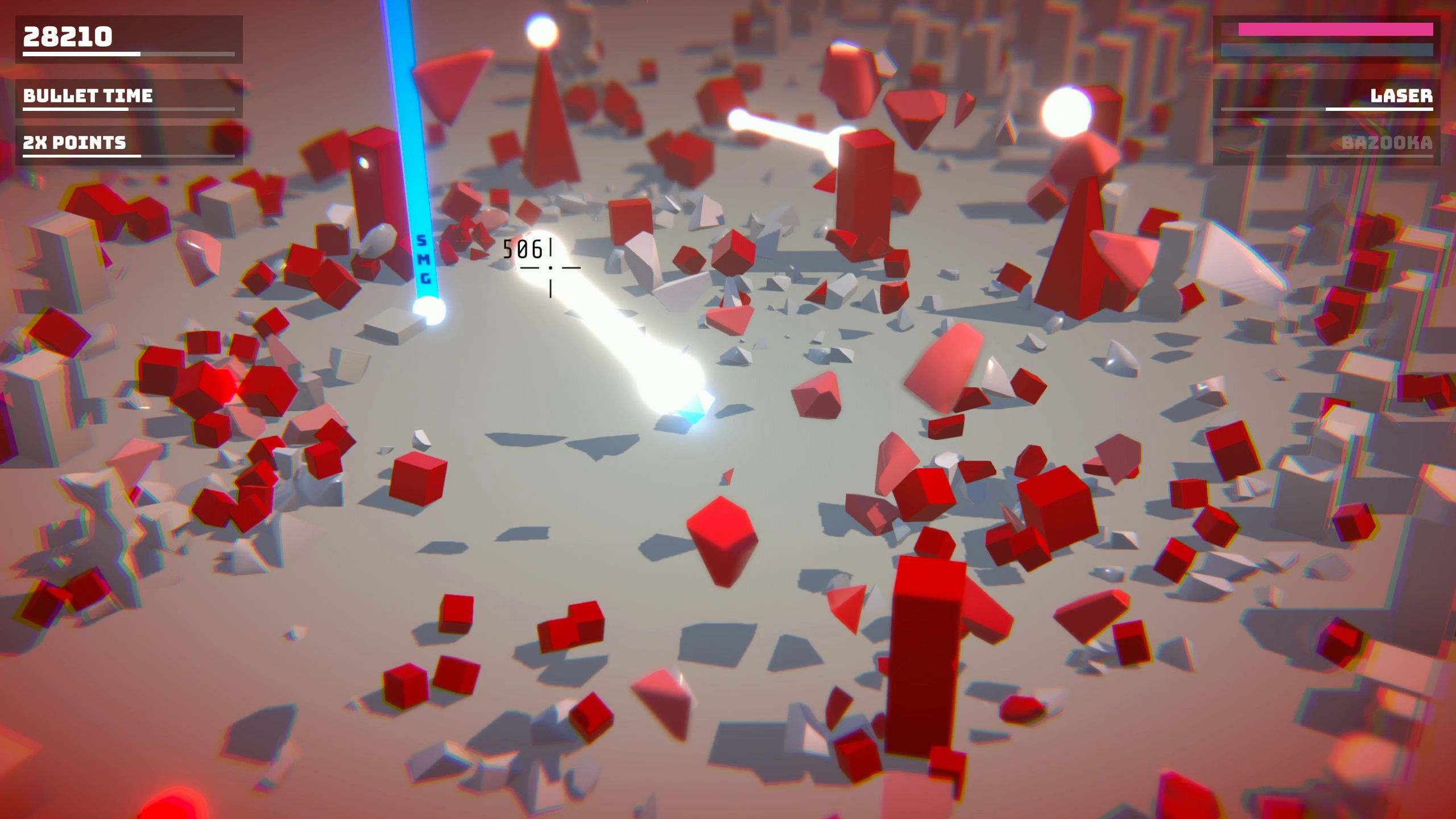 Dans une ville futuriste, mettez en pièces des adversaires rouges et semblables à des cubes grâce à des balles, des lasers et des explosions nucléaires. Jouez en solo ou avec vos amis grâce au mode co-op local. Détruisez autant d'adversaires que possible avant de vous faire submerger.