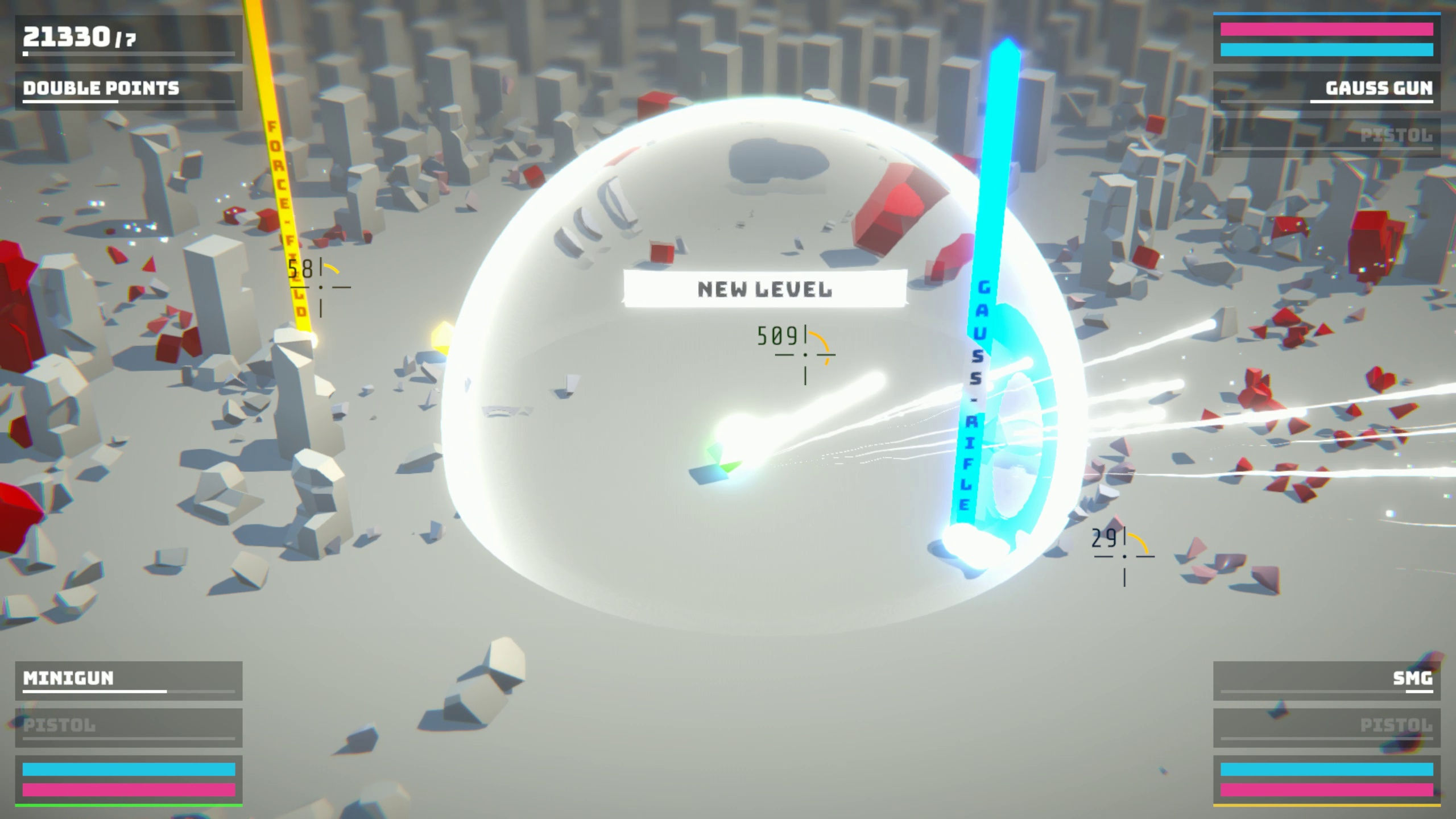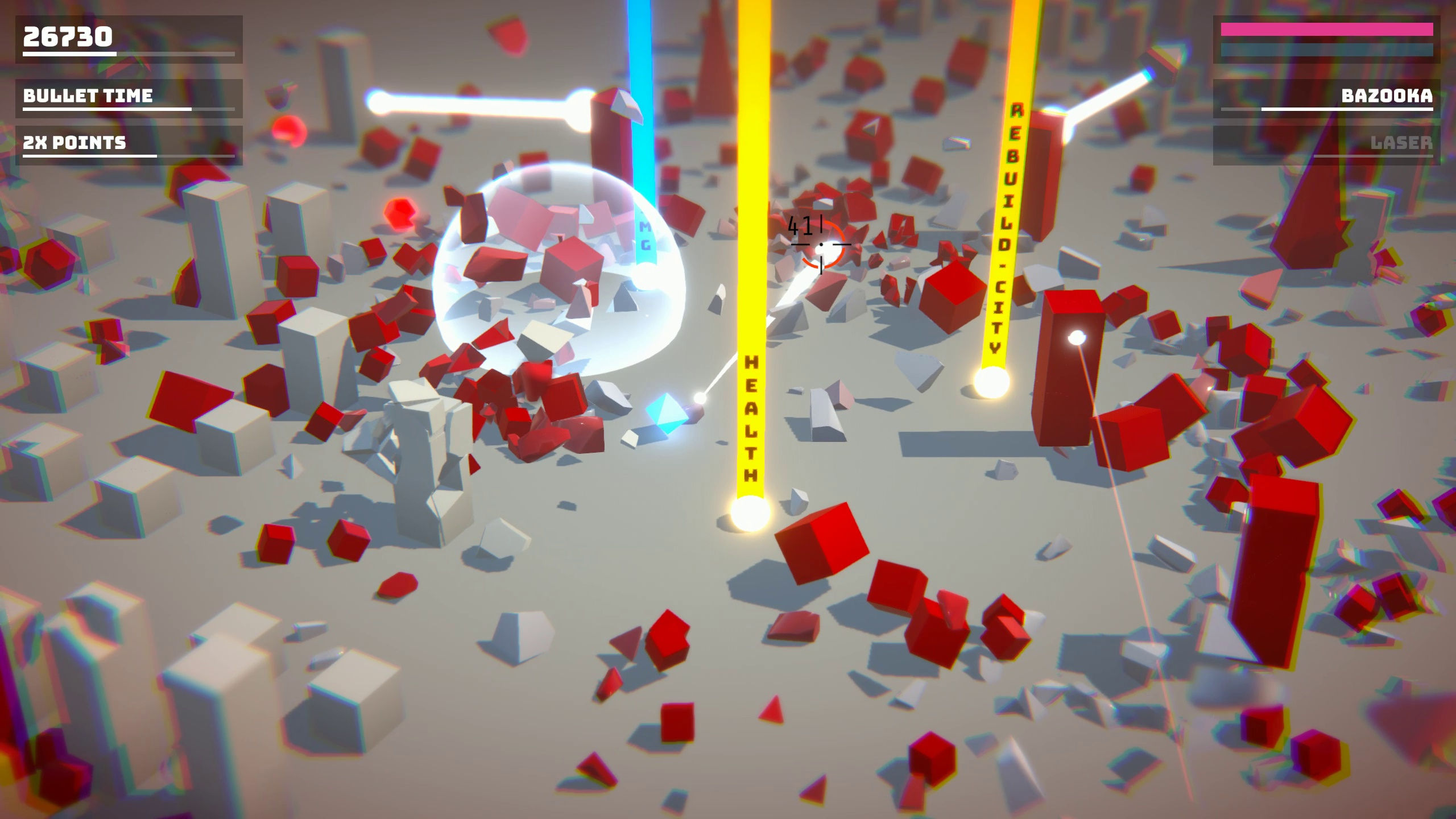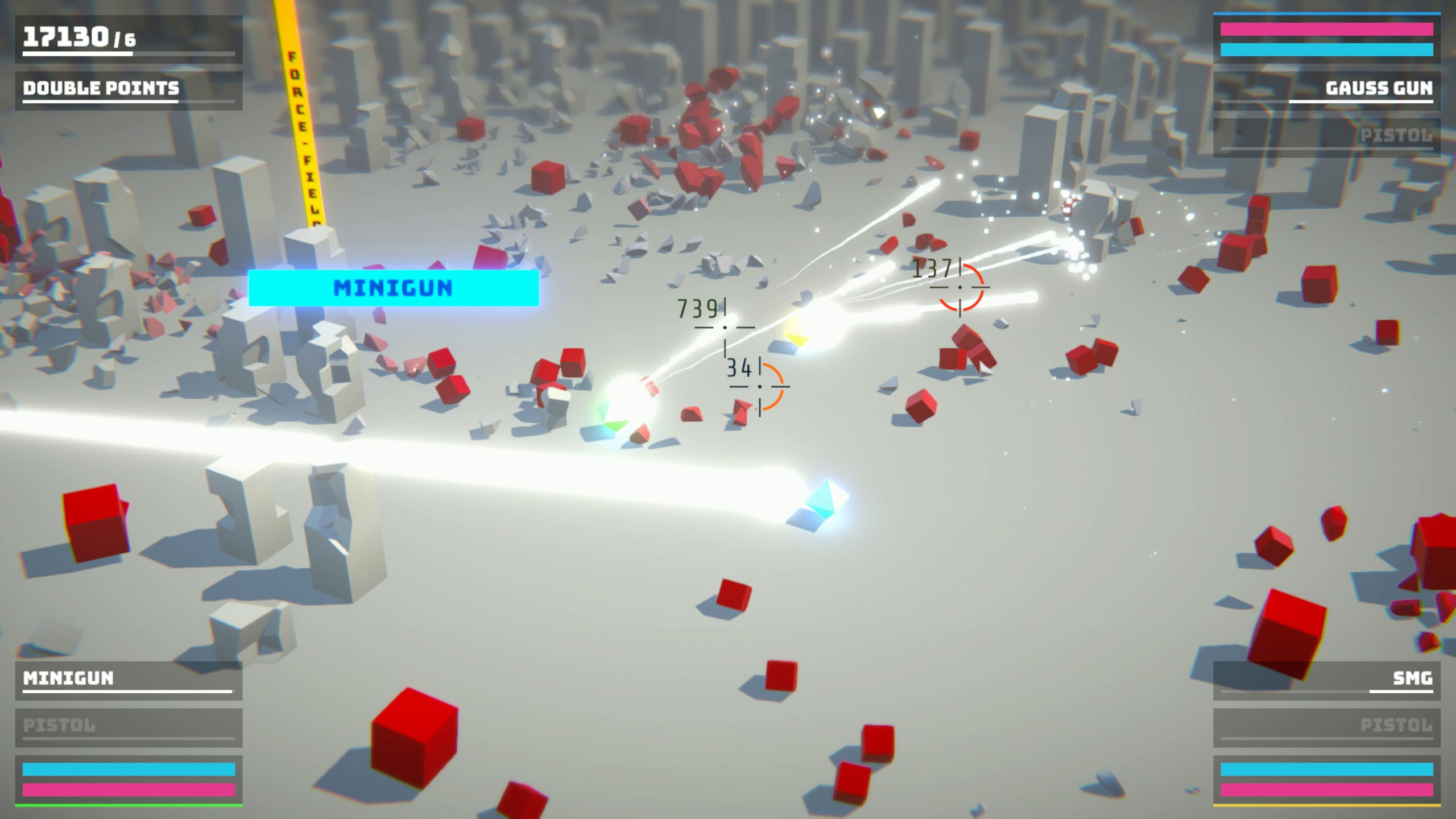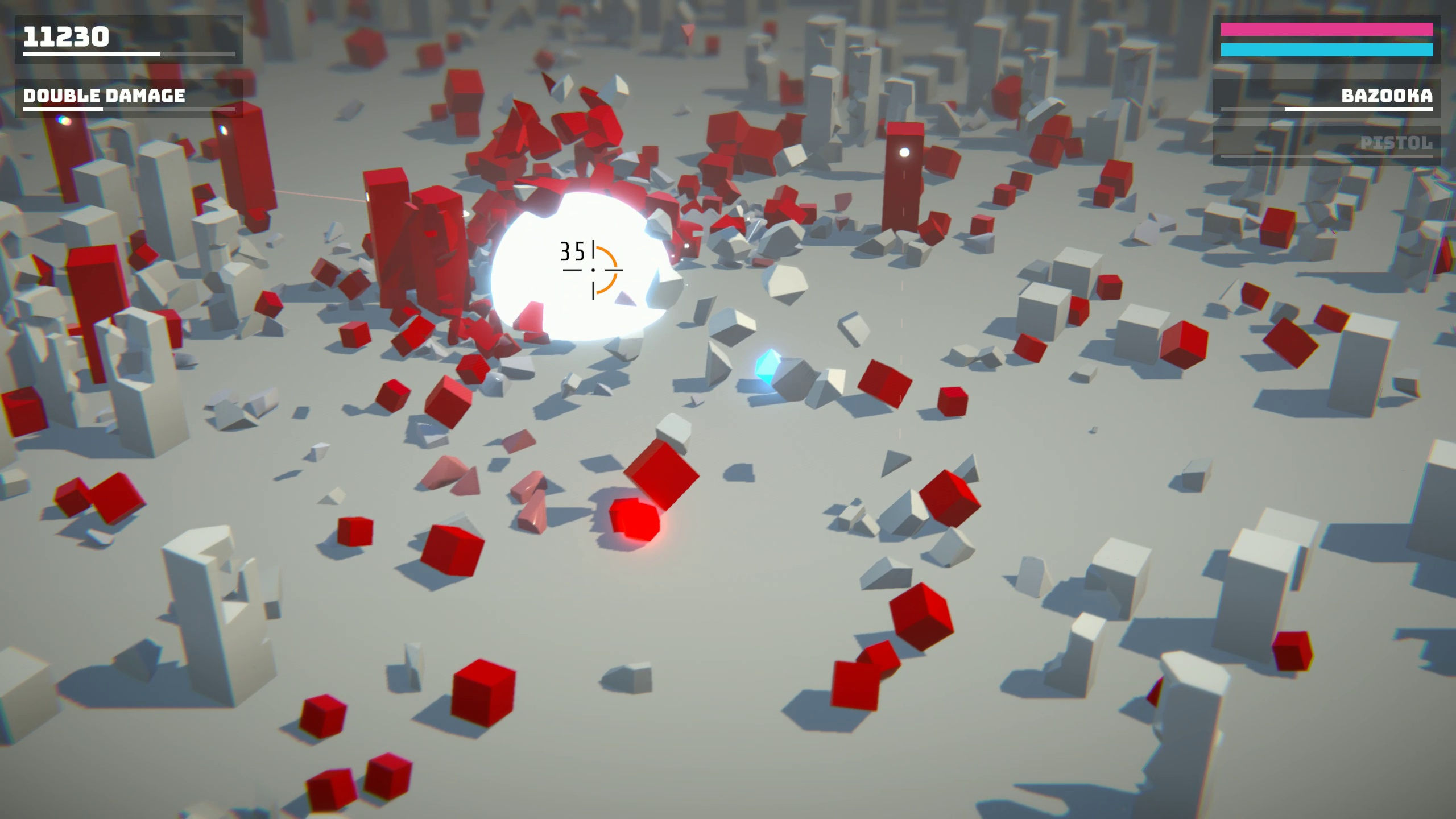 Dans une ville futuriste, mettez en pièces des adversaires rouges et semblables à des cubes grâce à des balles, des lasers et des explosions nucléaires. Jouez en solo ou avec vos amis grâce au mode co-op local. Détruisez autant d'adversaires que possible avant de vous faire submerger.