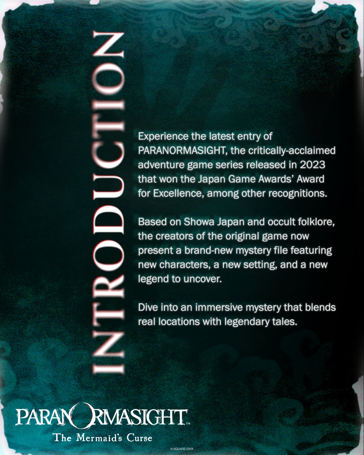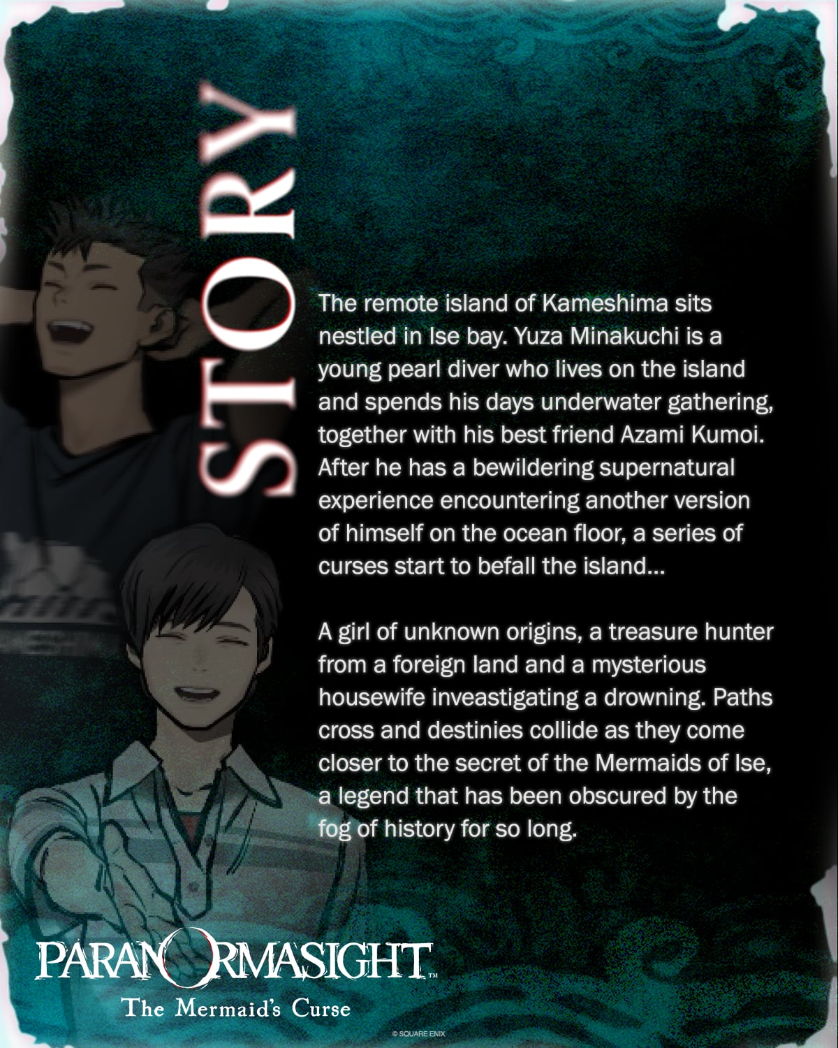 Un nouveau volet de PARANORMASIGHT vous attend à Ise-Shima, au Japon, une région riche en légendes concernant les sirènes. Rejoignez un groupe de personnages fascinants dans leur enquête sur les mystères des sirènes d’Ise. Dévoilez leurs différents points de vue sur l’affaire et menez l’histoire à sa conclusion poignante. L’île isolée de Kameshima se trouve nichée dans la baie d’Ise. Yuza Minakuchi est un jeune pêcheur de perles vivant sur l’île, passant ses journées en récolte sous-marine en compagnie de son meilleur ami, Azami Kumoi. Après un face à face troublant et inexplicable avec une autre version de lui-même dans les fonds marins, une série de malédictions se met à frapper l’île... Une jeune fille d’origine inconnue, un chasseur de trésor venu d’un pays lointain, et une mystérieuse femme au foyer mènent l’enquête sur une noyade. Leurs chemins et leurs destins se rencontrent à mesure qu’ils dévoilent mystère des sirènes d’Ise, une légende depuis longtemps noyée dans les méandres de l’Histoire.