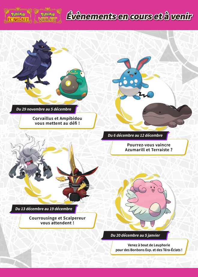 Pokémon Écarlate et Violet sont des RPG en monde ouvert, ce qui est donc une première pour la série. L'aventure se déroule dans la région de Paldea, où les êtres humains et les Pokémon vivent en harmonie. Le personnage que l'on incarne peut rejoindre l'Académie Orange ou l'Académie Raisin. Le nom de l'académie, son emblème, les uniformes et d'autres détails sont différents selon la version du jeu. Dans Écarlate, c'est donc l'Académie Orange, et dans Violet, il s'agit de l'Académie Raisin. Il y a aussi la possibilité d'utiliser les Pokémon légendaires emblématiques d'Écarlate et Violet, Koraidon (Écarlate) et Miraidon (Violet) comme montures. Les jeux disposent de trois intrigues : La voie du Maître (demandant de faire le tour des Arènes de la région pour atteindre le rang Maître), Un parfum de légende (une aventure qui consiste à chercher des ingrédients rares, les Épices Secrètes, en compagnie de Pepper, l’un des personnages importants de Paldea qui est un élève de classe supérieure) et ★ Objectif Stardust ★ (une intrigue où l’on doit défier une équipe de trouble-fêtes de l’école, la Team Star).