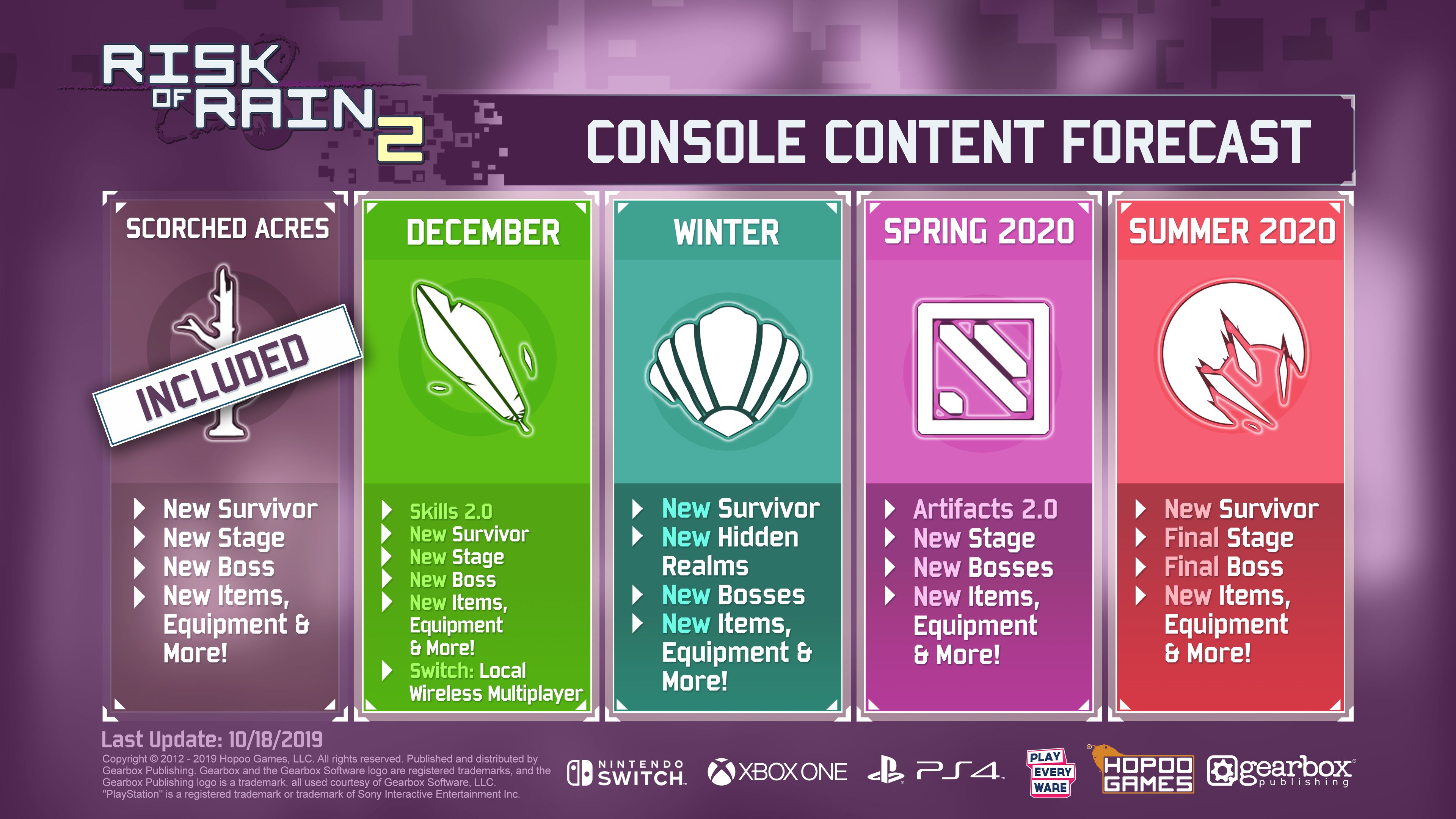29 février 2020 - 13:56 Risk of Rain 2 : la mise à jour Hidden Realms disponible le 24 mars sur Switch, PS4 et Xbox One, l’Artifacts Update arrive le 31 mars sur PC