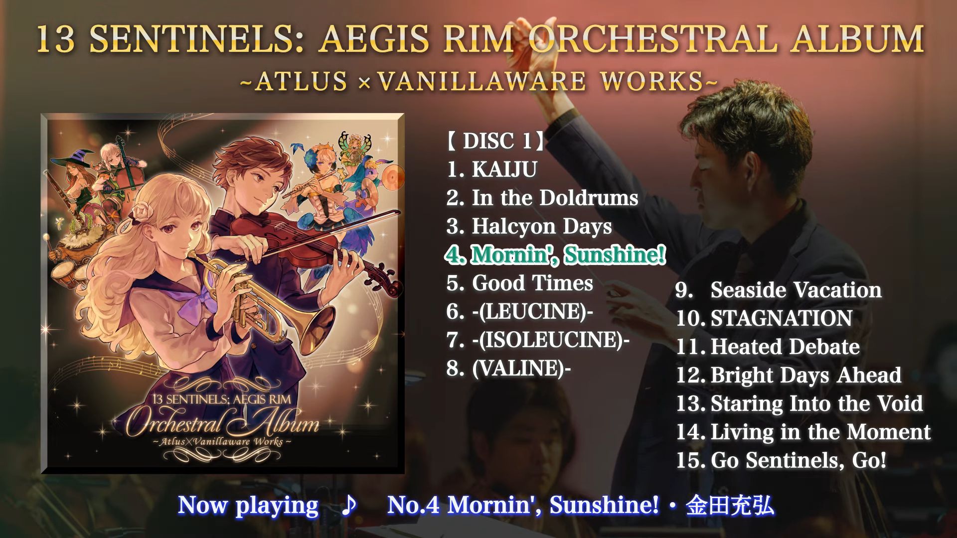 Faisant suite au 13 Sentinels : Aegis Rim Orchestral Concert ReSTART 2024, qui a eu lieu le 17 février 2024 au Sagami Women’s University Green Hall et qui se déroulait un an après le concert symphonique précédent, 13 Sentinels : Aegis Rim Orchestral Album~Atlus×Vanillaware Works~ est un album comprenant des arrangements orchestraux de 13 Sentinels : Aegis Rim et d’autres œuvres issus de collaborations entre le studio de développement Vanillaware et Atlus, pour un total de 25 pistes. Produit par Basiscape, qui était également en charge de la bande-son de chaque titre représenté, il sera disponible le 10 mai 2024 au prix de 3 520 yens et peut être précommandé sur CDJapan / ebten. À l’approche de la sortie de l’album, Basiscape a diffusé une vidéo permettant d’écouter des extraits de six musiques :