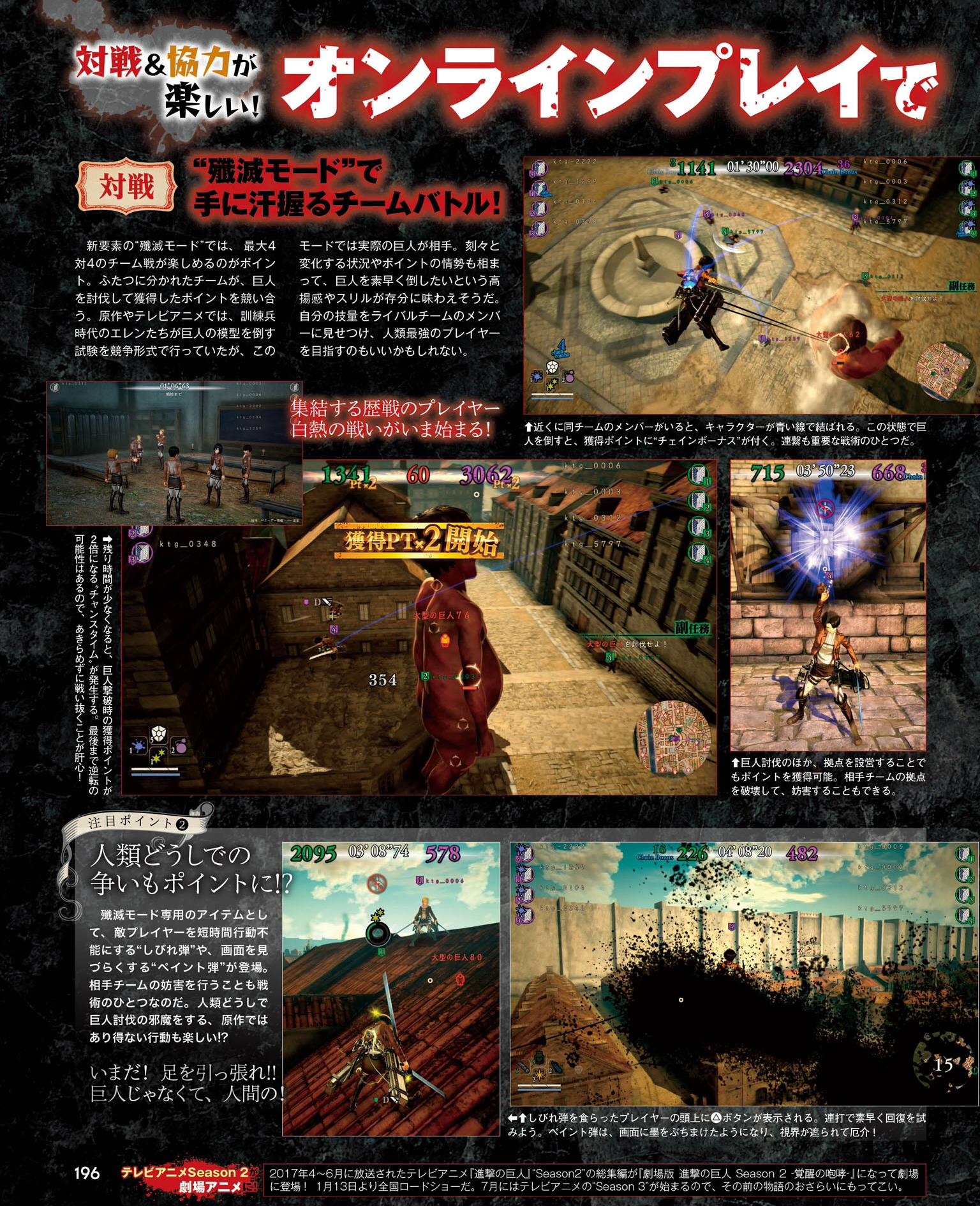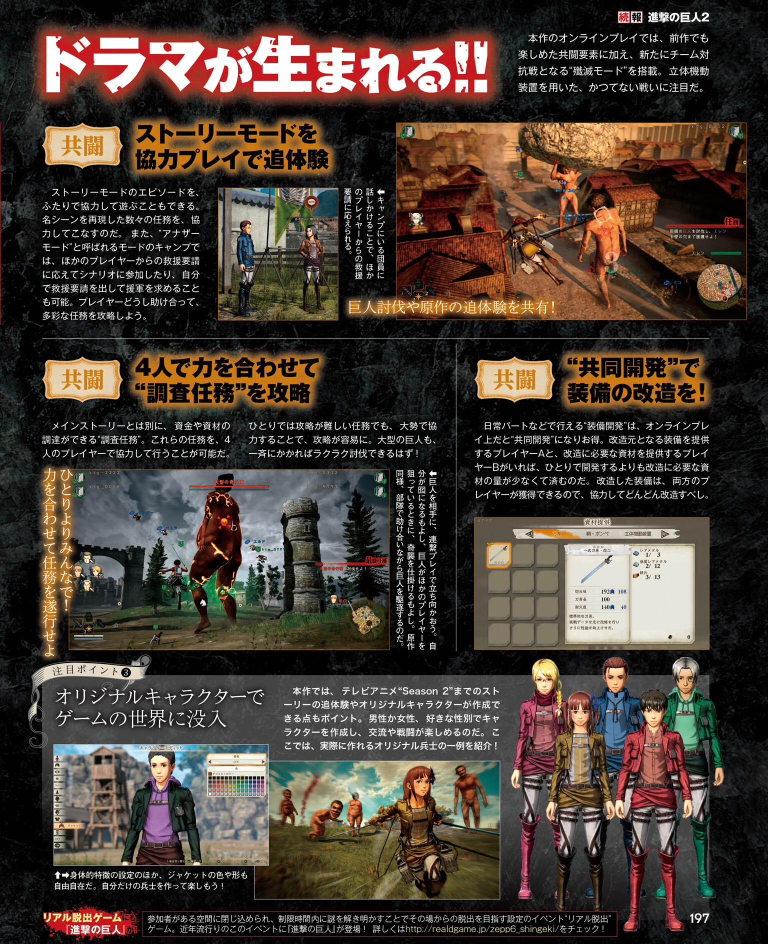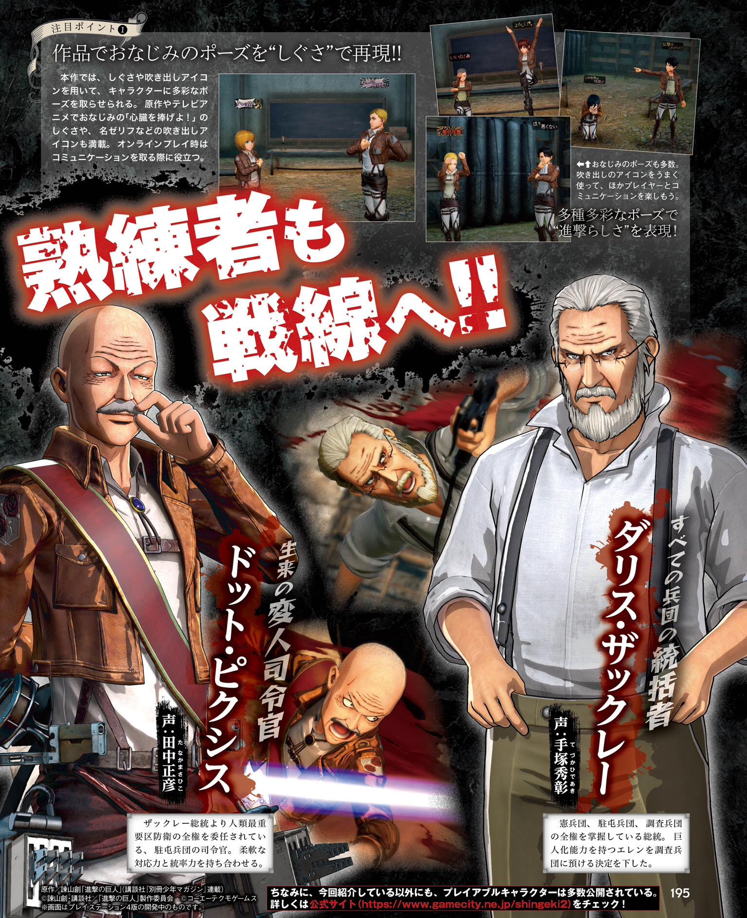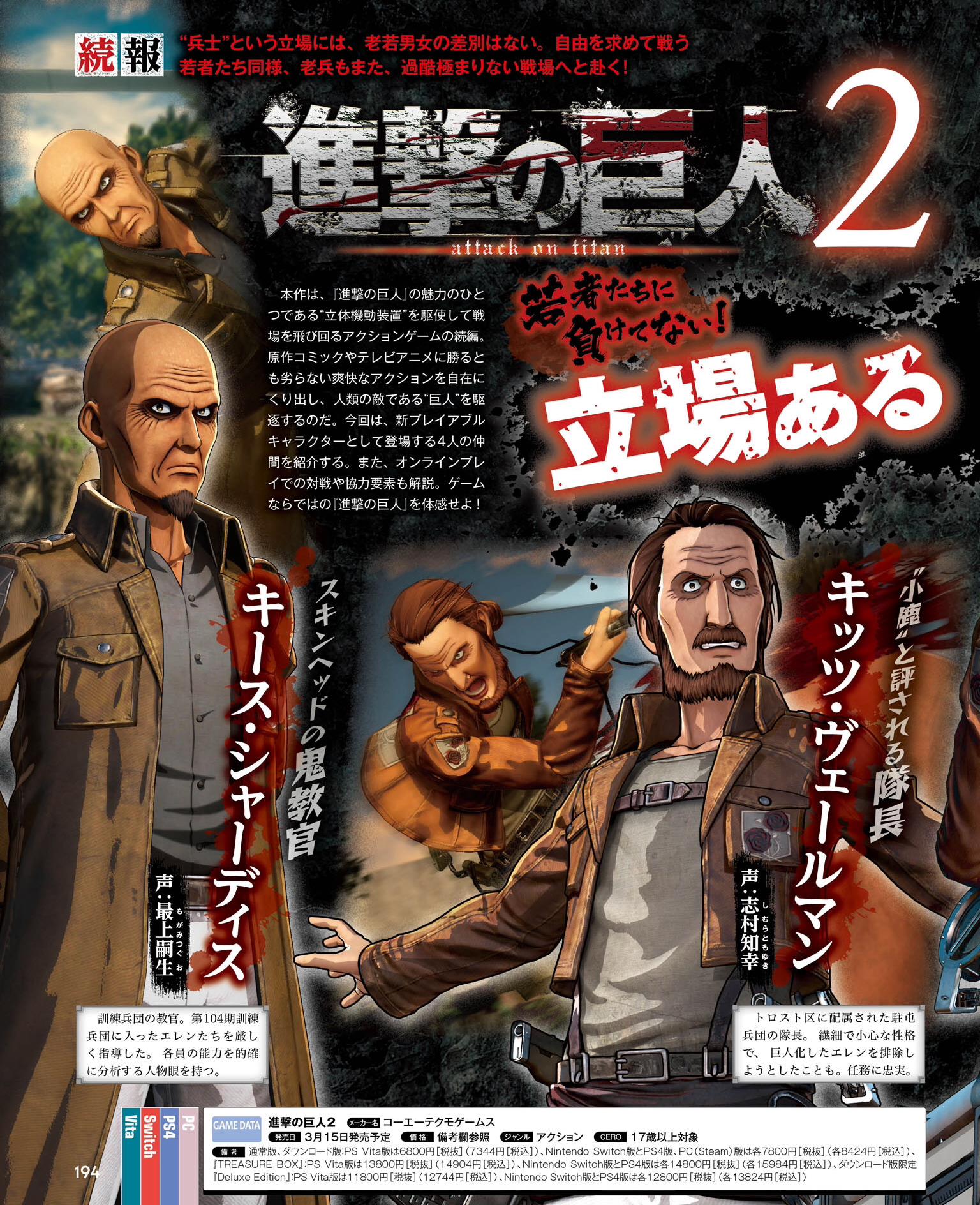 Pour bien commencer l’année, Koei Tecmo a présenté quatre personnages jouables du jeu d’action A.O.T. 2 (Attack on Titan 2) développé par Omega Force. Il s’agit de Keith Shadis, Kitts Verman, Dot Pixis et Daris Zackley. Pour le moment, le site officiel n’a pas encore été mis à jour et nous avons donc seulement la présentation des personnages de la preview du dernier numéro du magazine Famitsu. Koei Tecmo mettra très certainement à jour le site demain ou jeudi avec les pages de chaque personnage ainsi que des informations sur le mode en ligne (qui est détaillé dans Famitsu, mais les informations n’ont pas encore été dévoilées).