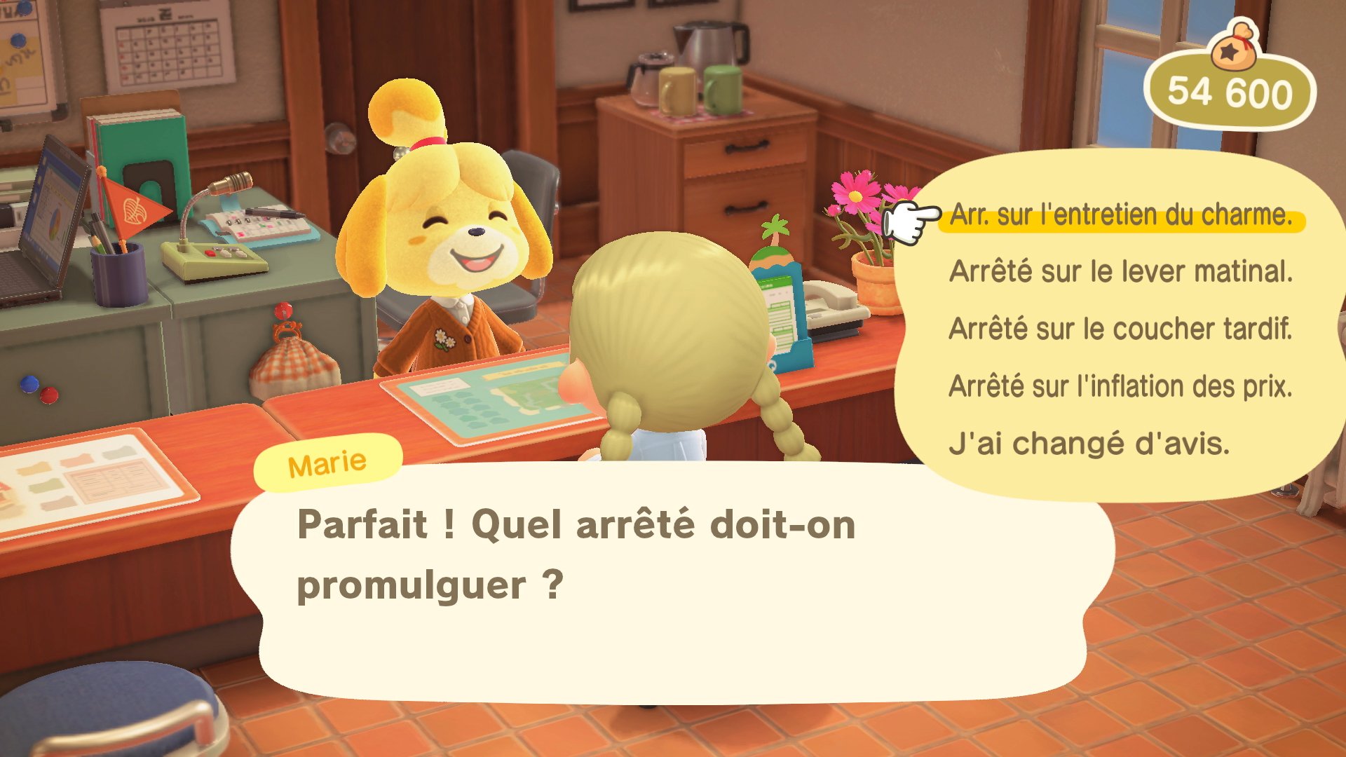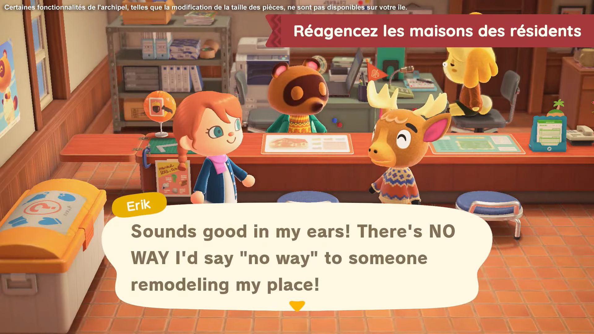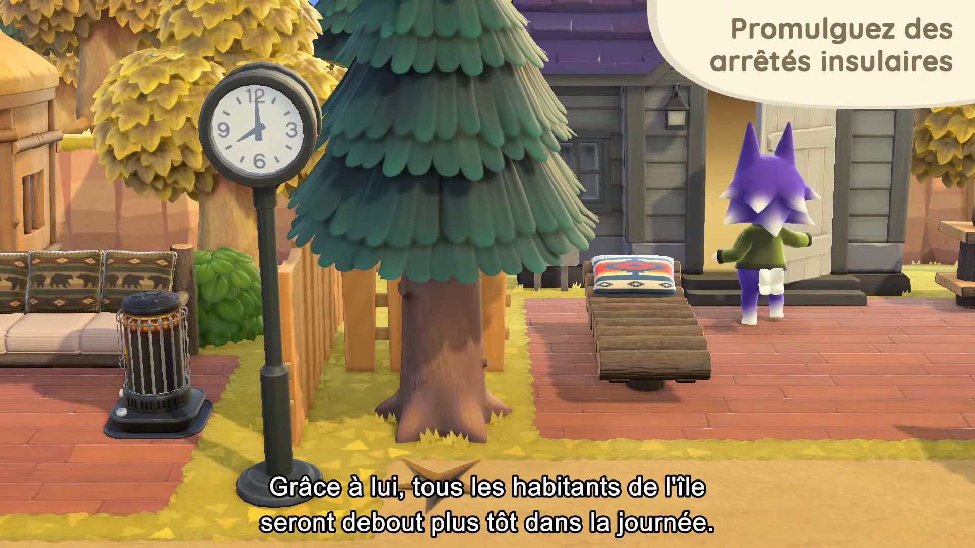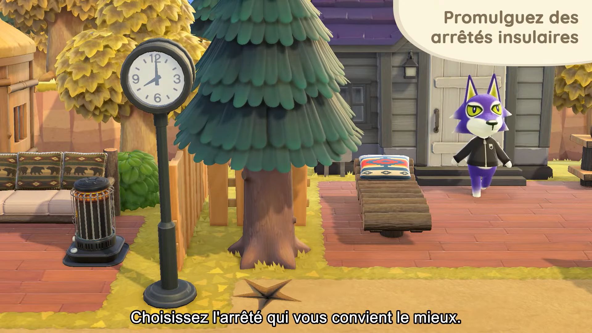 On arrive à la moitié des nouveautés désormais, avec les arrêtés, inspirés de ceux décidés par le maire (notre joueur) dans New Leaf. En allant voir Marie, on pourra donc choisir entre divers arrêtés, dont celui du lever matinal pour que tous les villageois se réveillent plus tôt dans la journée, ou encore celui qui permettra de ralentir la prolifération des mauvaises herbes. Il y aura aussi de nouveaux services liés à la maison chez Tom Nook. Il y aura enfin de nouvelles options de décoration extérieures, ce qui permettra d’assortir encore plus notre maison à l’île.
