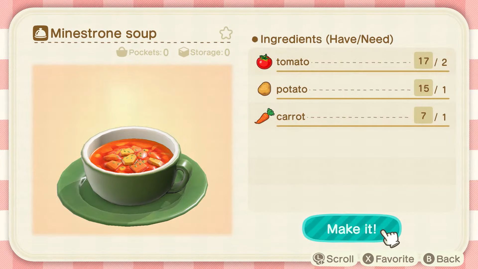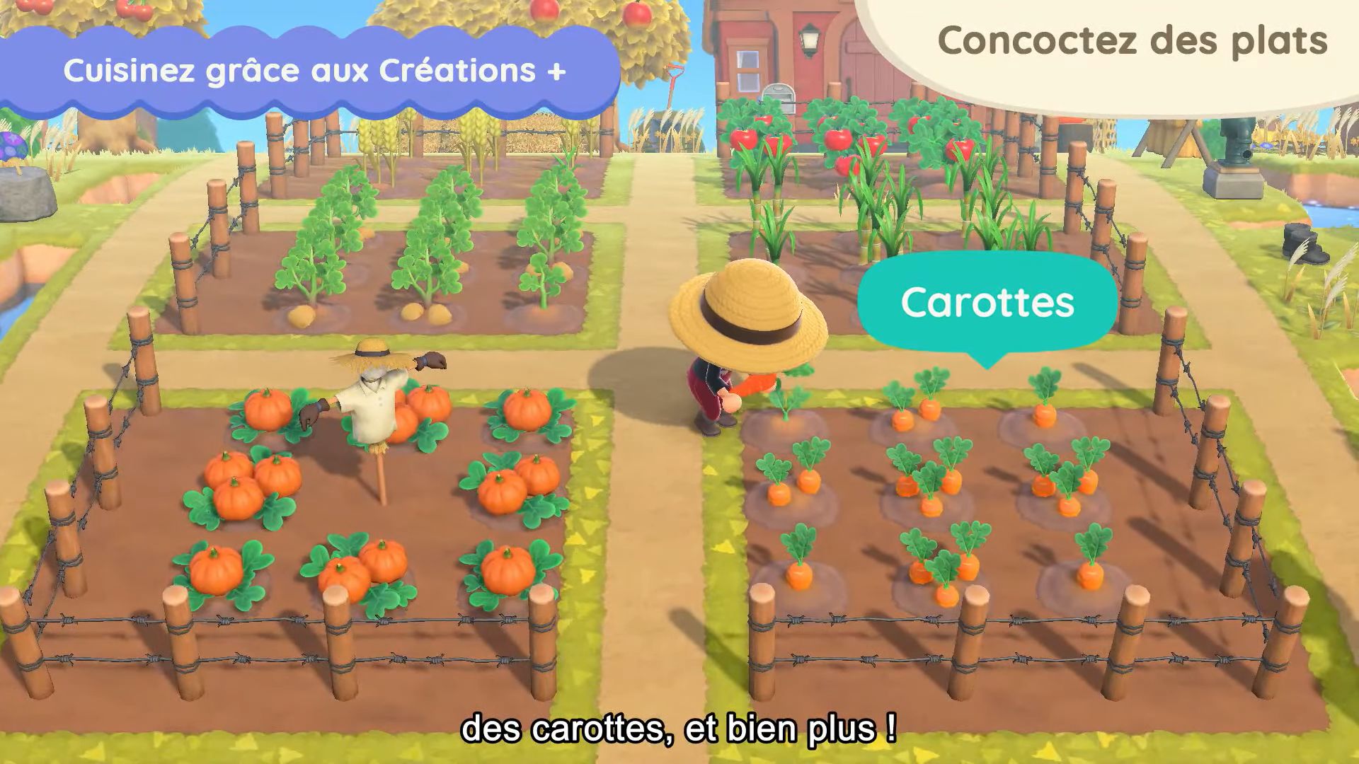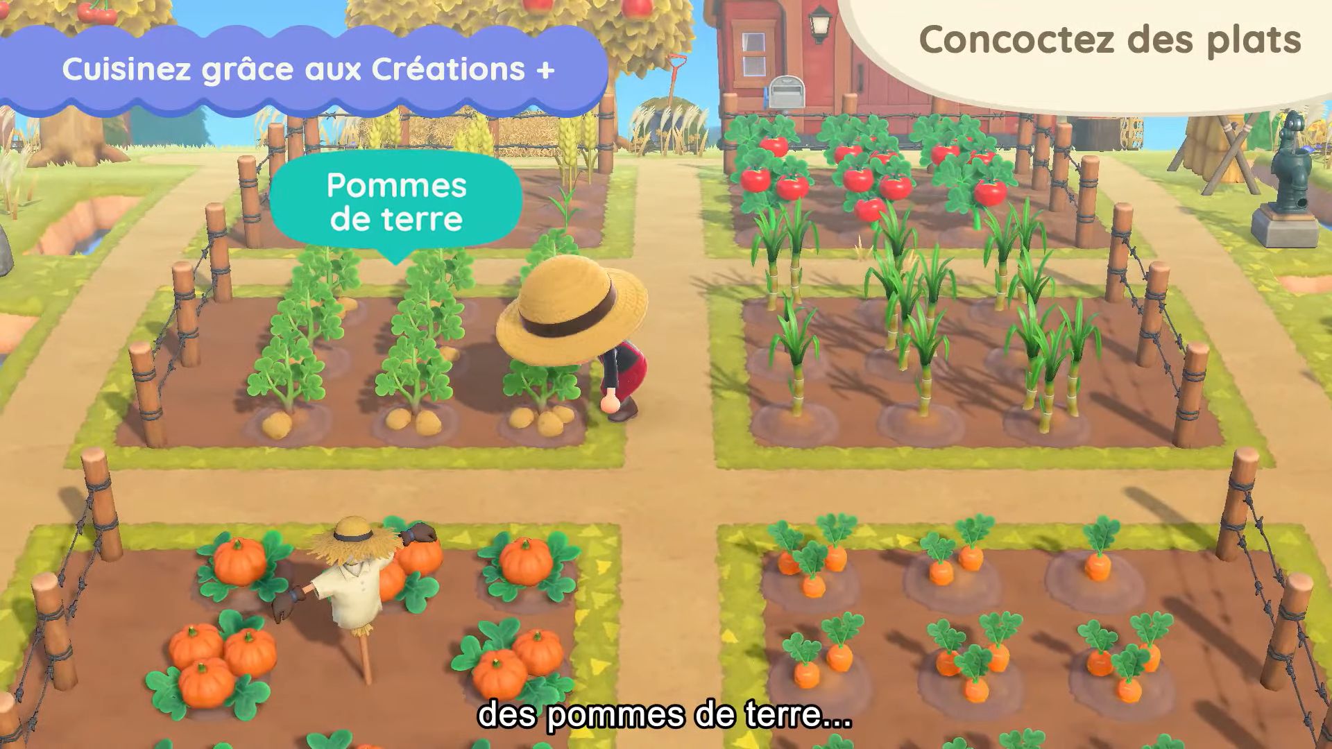 En parlant d’objets, il y en aura de nouveaux à échanger contre des miles Nook. Grâce aux Créations +, on trouvera des recettes de cuisine. La mise à jour apportera en effet divers ingrédients comme des tomates, du blé, de la canne à sucre, des pommes de terre, des carottes et bien plus. Une fois récoltées, il faudra voir les recettes et cuisiner des plats comme on fabrique des objets après l’obtention de Créations + grâce aux miles Nook, mais en utilisant cette fois-ci des objets prévus à cet effet comme une marmite. Les plats pourront ensuite être disposés partout et bien sûr être mangés. Pour cuisiner, il faudra combiner des aliments entre eux ou avec d’autres ingrédients. Il y aura aussi des boissons.