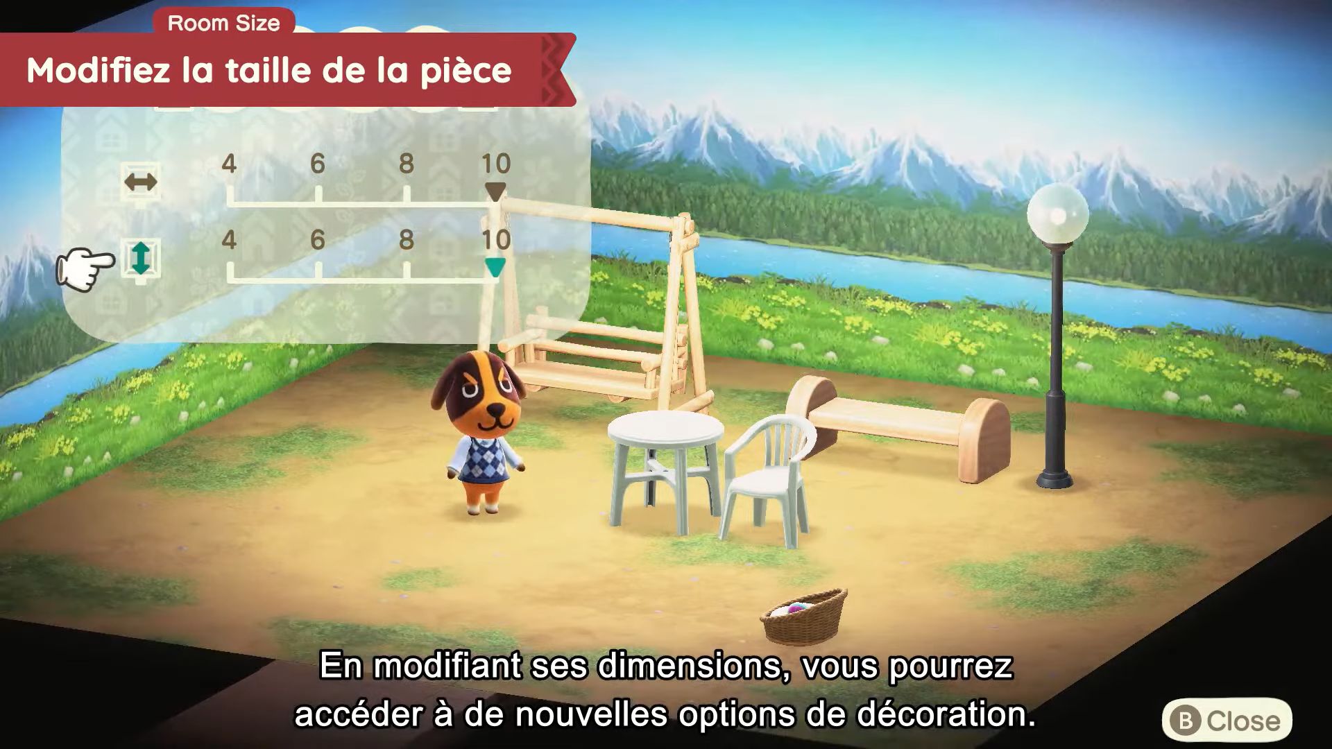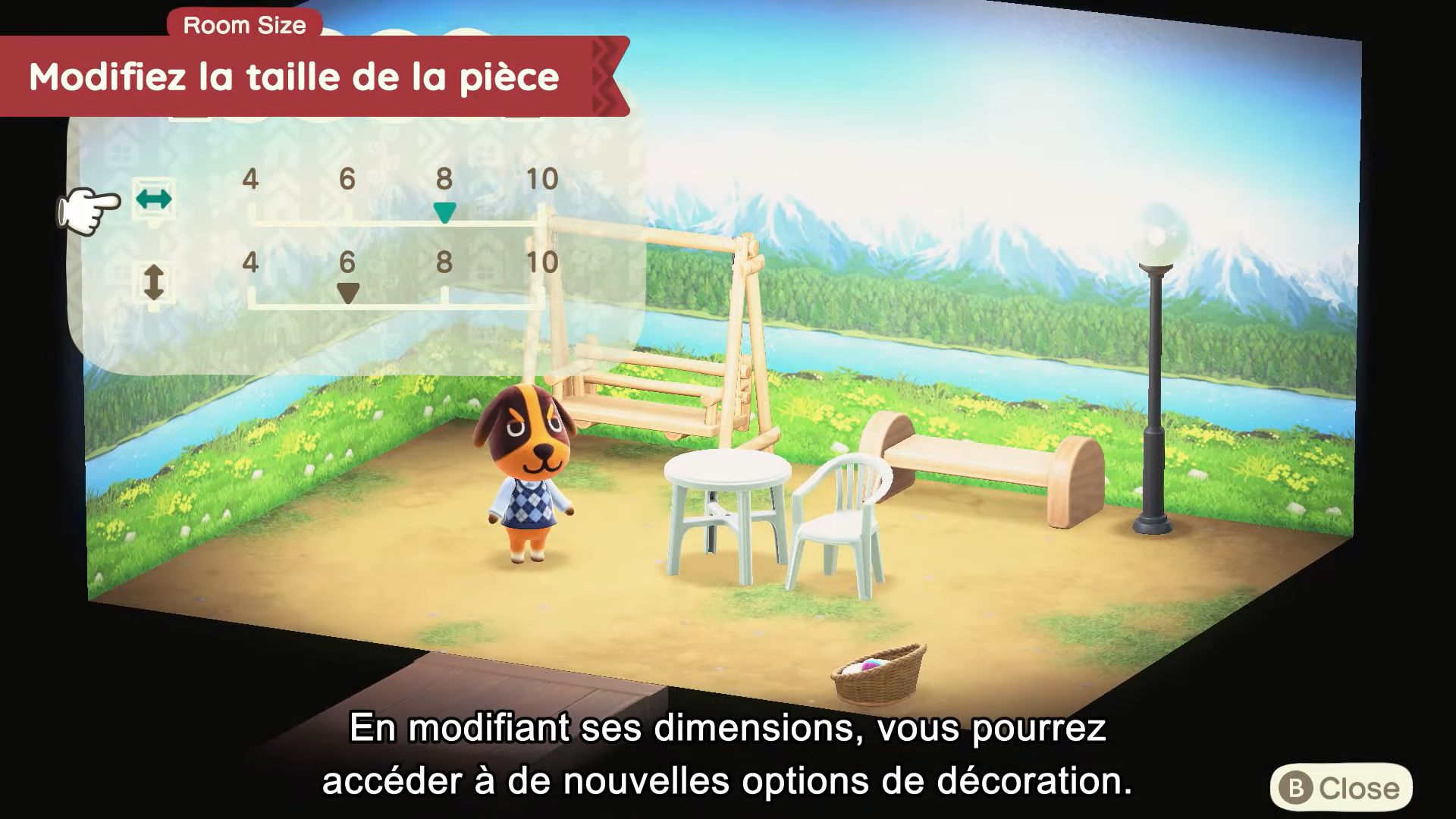 Comme dans Happy Home Designer, l’extérieur pourra aussi être aménagé, de sorte à faire des jardins par exemple. Il sera même possible de changer la météo, l’heure ou encore la saison. Les nouveautés introduites dans New Horizons seront de la partie, comme créer les mêmes chemins et placer des clôtures. De plus, on pourra faire petit à petit de nouvelles suggestions aux vacanciers pour leur offrir de nouvelles décorations grâce aux techniques inédites apprises et aux nouveaux meubles offerts par Lou. Il sera même possible de proposer à deux personnages à la fois de tenter une colocation.