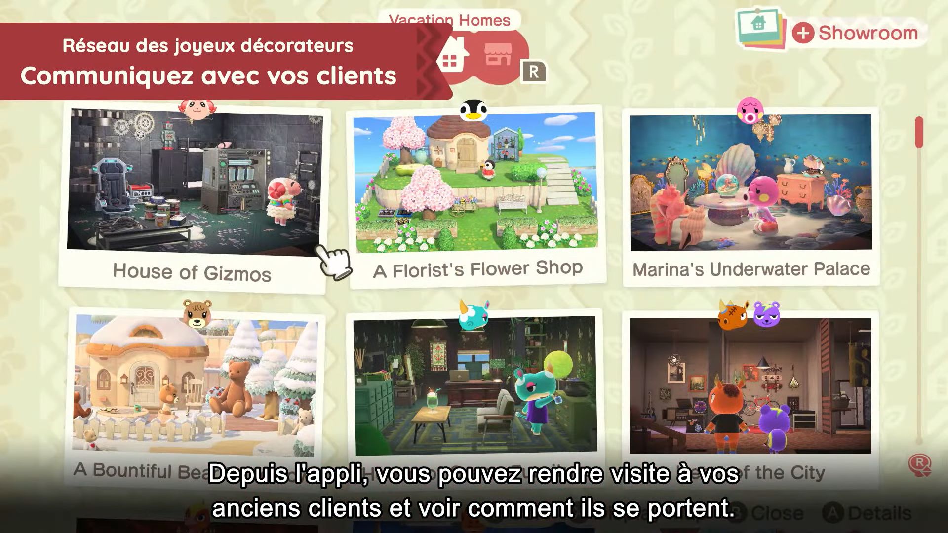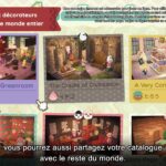 On pourra bien sûr prendre des photos de nos créations et personnalisations pour les sauvegarder et les mettre dans le catalogue de l’agence, qui pourra être consulté à partir de l’appli Réseau des joyeux décorateurs du NookPhone. Grâce à elle, on pourra accéder au hall d’exposition en ligne, où l’on pourra voir les créations d’autres personnes et les suivre pour voir plus facilement leurs futures photos et ainsi avoir accès plus facilement à ce qu’ils ont créé pour s’en inspirer. Chaque joueur aura son propre identifiant RJD (Réseau des joyeux décorateurs).