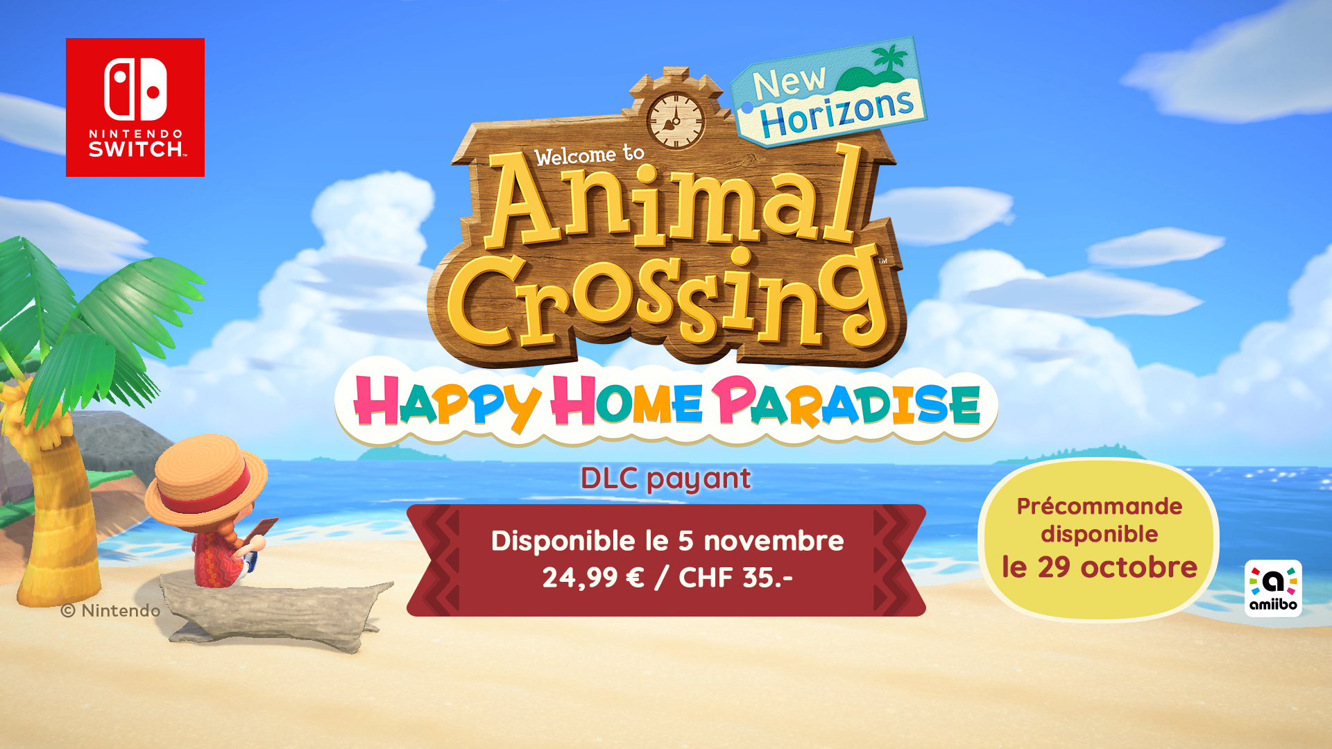 Le DLC Animal Crossing : New Horizons – Happy Home Paradise sortira le 5 novembre prochain au prix de 24,99 €. Il sera possible de le précommander à partir du 29 octobre. Il sera également inclus sans coût supplémentaire via le nouvel abonnement Nintendo Switch Online + Pack additionnel, dont la sortie est prévue pour le 26 octobre prochain. L’abonnement individuel coûtera 39,99 € pour 12 mois pour un abonnement individuel, et 69,99 € pour 12 mois pour un abonnement familial. Si l’abonnement est arrivé à expiration, les Villas de Lou ne seront plus accessibles, mais les nouveautés comme les nouvelles techniques de décoration apprises resteront disponibles. Pour tout savoir sur Nintendo Switch Online + Pack additionnel, vous pouvez consulter notre article à cette adresse.