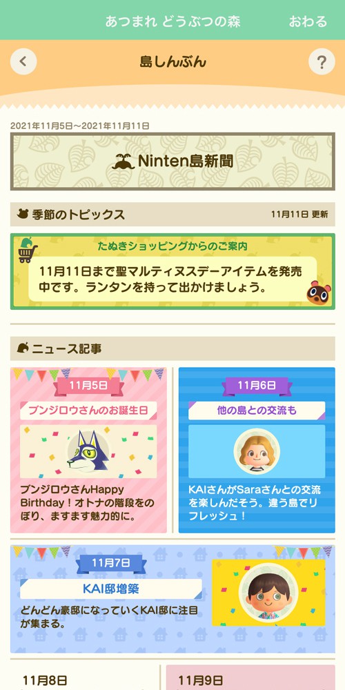 En dehors du Direct, Nintendo a annoncé que le service NookLink de l’application Nintendo Switch Online sera mis à jour le 5 novembre. Il ajoutera de nouveaux articles qui pourront être échangés contre des points Nook ainsi que le « Journal de ton île » donnant accès aux activités quotidiennes de l’île en dehors du jeu. On pourra aussi recevoir des conseils avec l’appli du guide insulaire et consulter le Réseau des joyeux décorateurs depuis un smartphone ou une tablette. Enfin, Nintendo organisera un événement dans Animal Crossing : Pocket Camp pour commémorer la mise à jour à partir du 28 octobre. Avec le bonus de connexion, on obtiendra la même tenue que le personnel du RJD et rencontrer certains des nouveaux personnages un peu plus tôt.