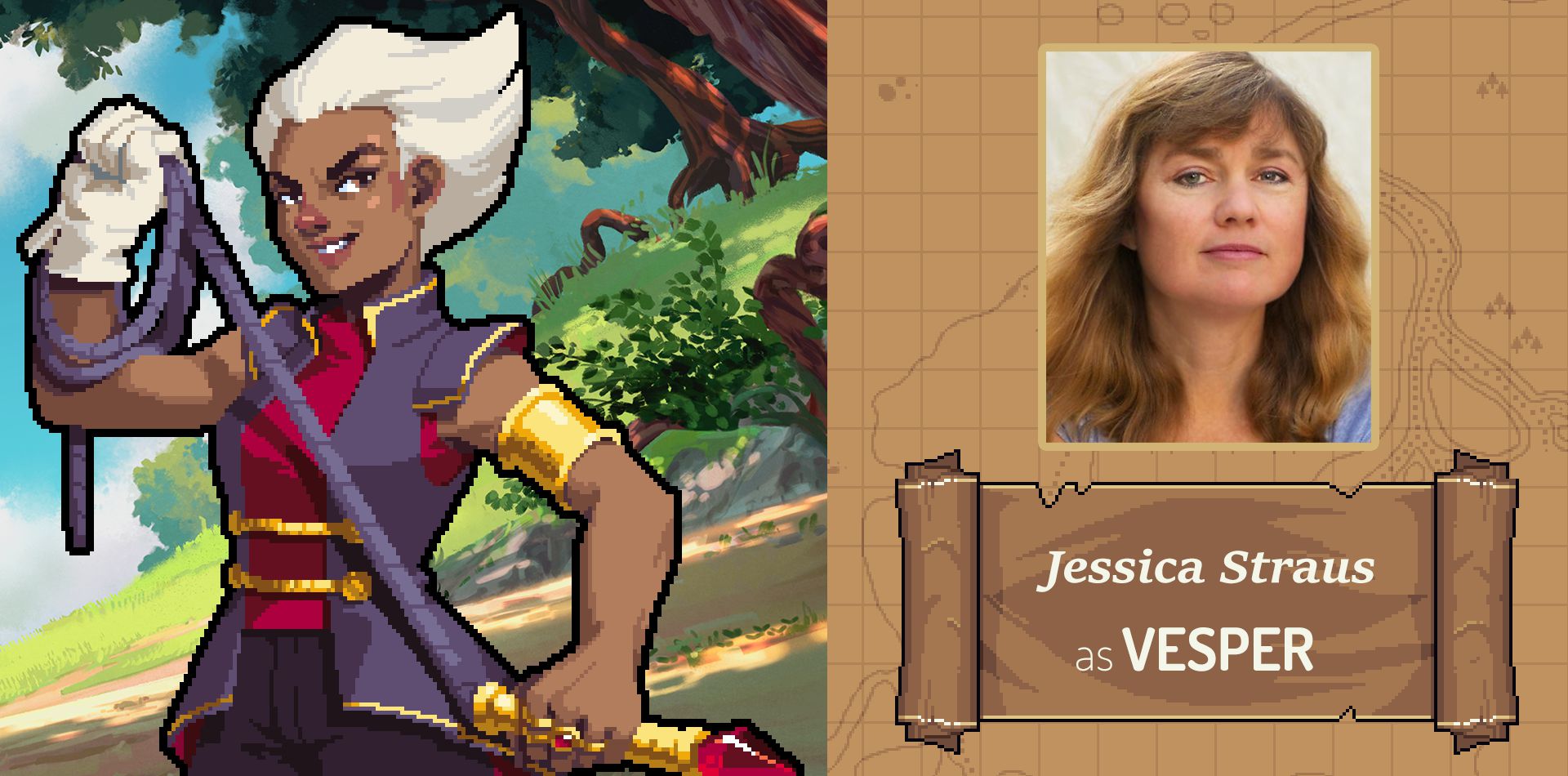 – Jessica Straus jouant Vesper, très populaire dans le milieu et ayant participé à plus d’une centaine de projets. Elle est surtout connue pour ses doublages de Juri Han dans la saga Street Fighter, Amazon/Cassia dans Heroes of the Storm et Diablo II, Dr. Hypatia dans Dishonored 2, ou encore Pi dans .hack//GU.