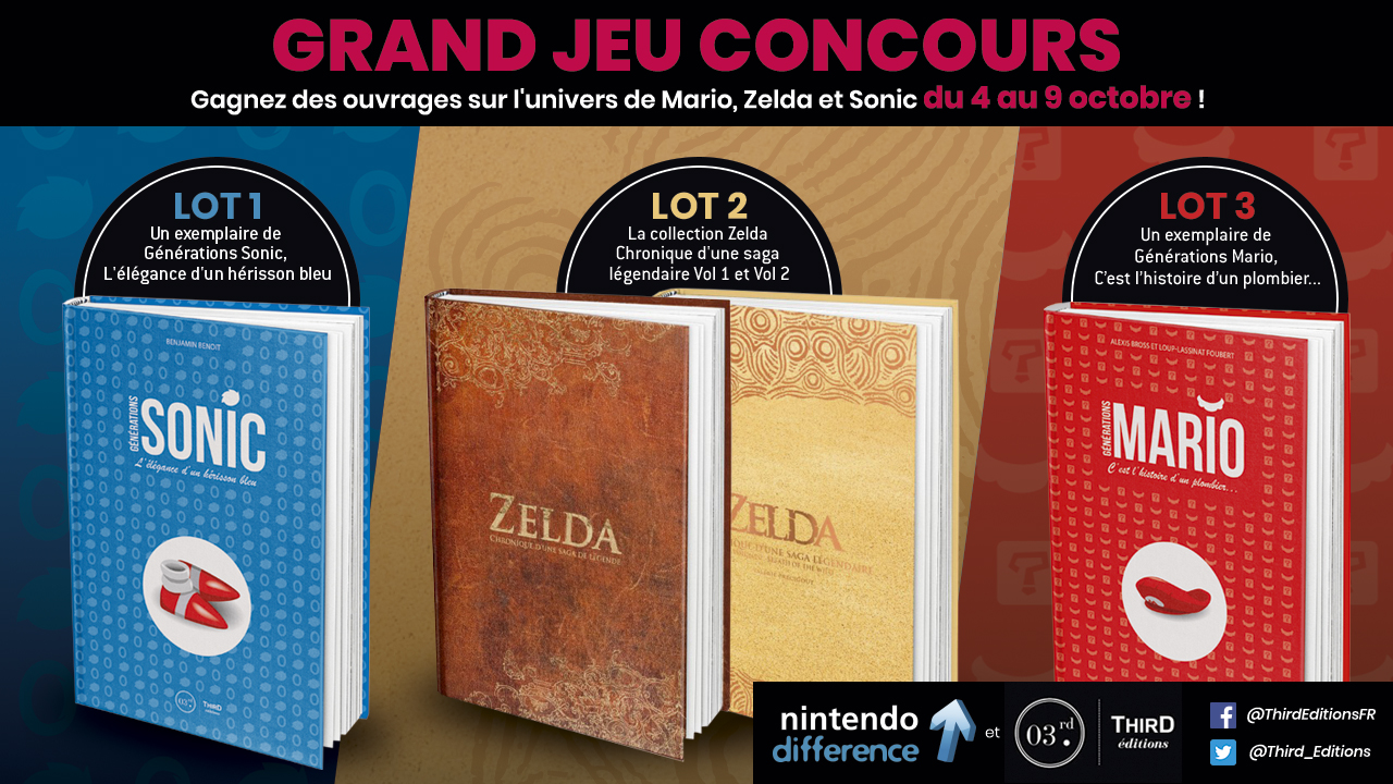 Nintendo-Difference et Third Editions sont heureux de vous proposer un grand concours vous permettant de tenter de gagner l’un des magnifiques ouvrages suivant : Générations Sonic – L’élégance d’un hérisson bleu, Zelda – Chronique d’une saga légendaire Volume 1 & 2 ainsi que Générations Mario – c’est l’histoire d’un plombier… tous disponibles à l’achat sur le site officiel. À partir d’aujourd’hui et jusqu’au 9 octobre, vous pourrez tenter de remporter l’un de ces ouvrages.