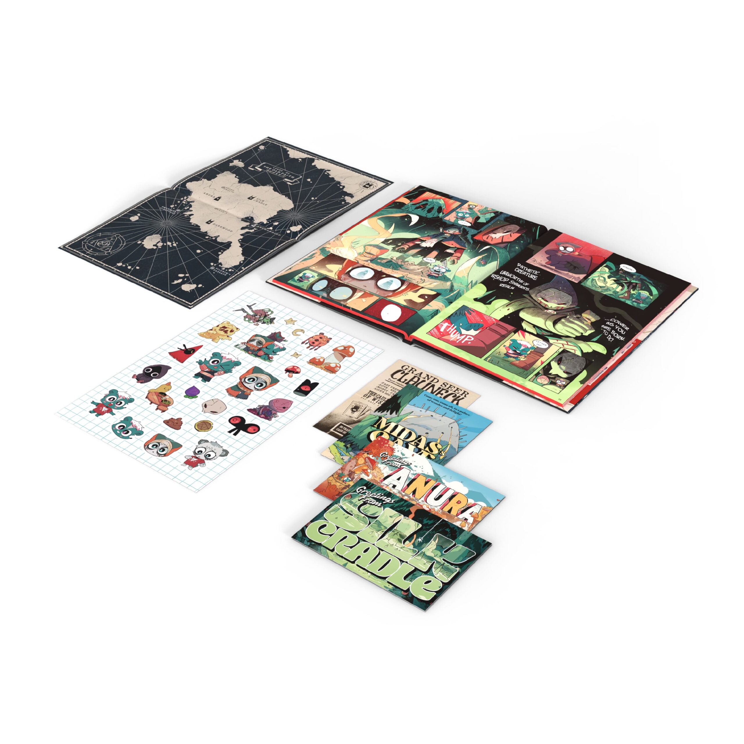 Avant cette grande extension, Massive Monster et Devolver Digital avaient proposé une toute nouvelle mise à jour, Unholy Alliance, et un pack de DLC, le Pack Pilgrim, le 12 août 2024. On détaillait tout cela dans cet article. Par la suite, le mois suivant, Devolver Digital a annoncé Cult of the Lamb : Pilgrim, une véritable bande dessinée au format physique dessinée par Jojo Zhou, assisté aux dessins en couleur par l’artiste Carles Dalmau, déjà à l’Å“uvre sur Cult of the Lamb mais aussi sur Soma et Lucid Lucy. Elle est sortie en février dernier via la boutique de Devolver Digital, mais n’est plus en stock aujourd’hui. La bande dessinée était proposée en deux formats : livre de poche (paperback) et livre relié deluxe (hardcover). L’édition deluxe contenait des bonus comme des cartes postales, une planche de stickers et une carte pliable des Lands of the Old Faith. L’histoire suit les aventures de Jalala et Rinor, deux pionniers qui explorent ces territoires désolés à la recherche d’un refuge pérenne. Sur leur route, ils croiseront des cultistes en quête de nouveaux sacrifices, des créatures terrifiantes en chasse de leur prochain repas ou encore des colporteurs de champignons. Tout cela s’ajoute aux rumeurs à propos d’une bête furieuse et assoiffée de sang qui erre dans les environs. Dans l’histoire de la bande dessinée, on retrouve également des têtes connues du jeu et de nouveaux personnages.