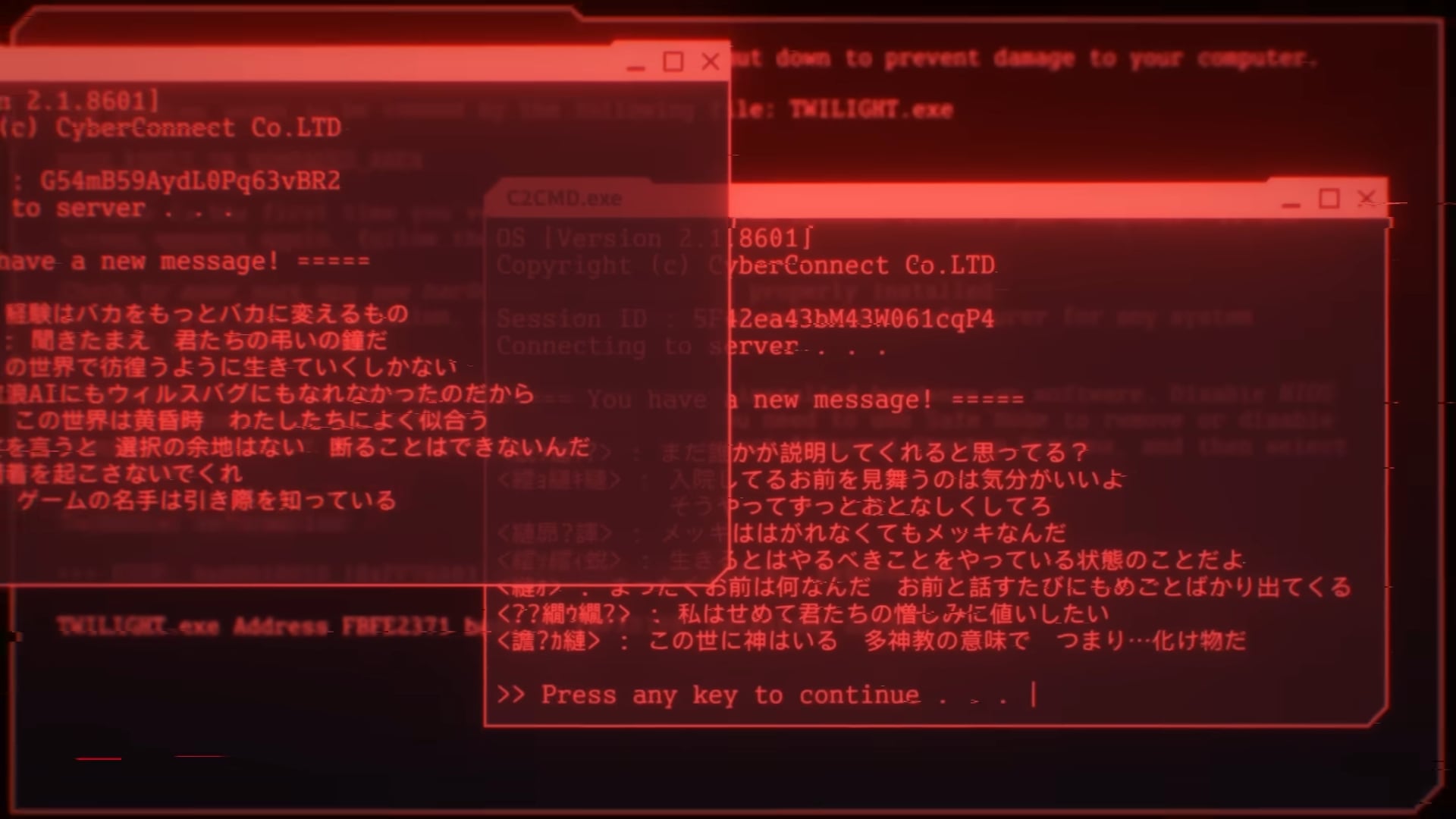 .hack//Z.E.R.O. a comme nom de projet « Project Dusk ». Le mot « Dusk » aura visiblement son importance, puisqu’il se trouve aussi dans une phrase à la fin du teaser : « This world is at “Dusk”, it matches with us so well. » La phrase qui se trouve en-dessous (Imirt Cróga Iontach Tús Pianmhar Ciúnas Eochair Lionn Dubh Uilíoch Olc Beithíoch) serait écrite en gaélique, mais ne semble pas être reliée directement à celle en anglais, n’est pas une traduction de la première phrase et correspond visiblement à plusieurs mots clés comme « un acte courageux ». À noter que la phrase en anglais apparaît aussi traduite en japonais dans un message situé dans une fenêtre rouge d’une séquence du teaser. Bien que CyberConnect2 ne semble pas encore être prêt à révéler d’informations précises sur l’histoire, il est clair que le teaser pose quelques bases de l’histoire de ce nouveau jeu et donne des indices que les fans peuvent s’amuser à analyser.