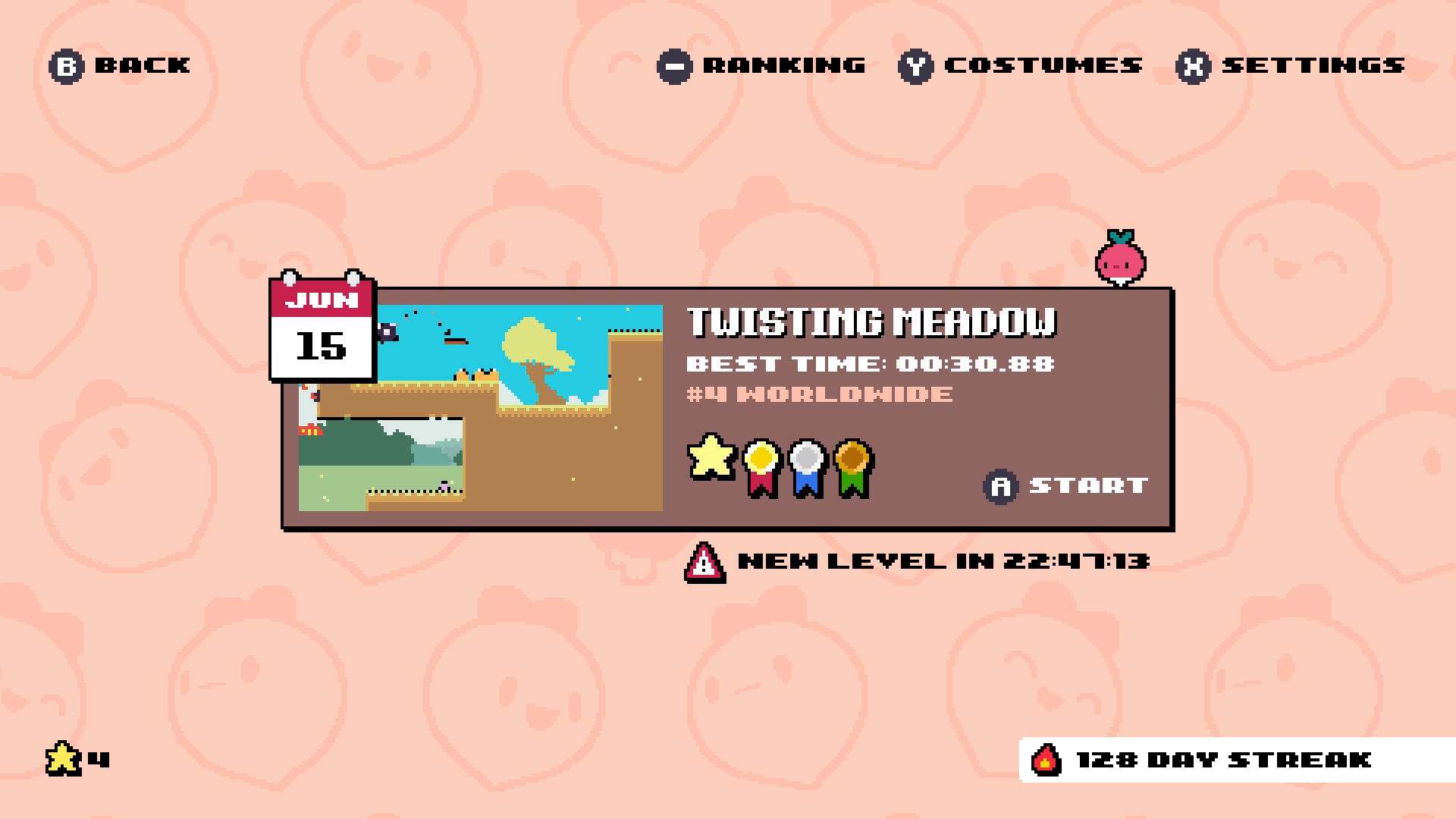 Sorti le 8 février 2023 sur l’eShop de la Nintendo Switch, ainsi que sur iOS, Android et PC (via Steam), le charmant Daily Dadish est la nouvelle création du développeur Thomas K. Young qui remet le couvert après Dadish 1, 2 et 3. Le concept est ici de proposer un niveau par jour pendant un an, chacun n’étant toutefois disponible que pendant la journée en question. À noter qu’il est également possible de s’adonner gratuitement au jeu sur navigateur par le biais de la plateforme Poki.