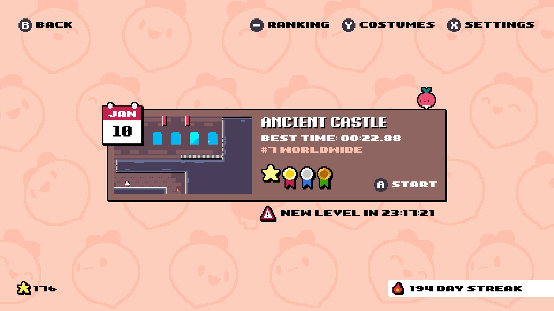Sorti le 8 février 2023 sur l’eShop de la Nintendo Switch, ainsi que sur iOS, Android et PC (via Steam), le charmant Daily Dadish est la nouvelle création du développeur Thomas K. Young qui remet le couvert après Dadish 1, 2 et 3. Le concept est ici de proposer un niveau par jour pendant un an, chacun n’étant toutefois disponible que pendant la journée en question. À noter qu’il est également possible de s’adonner gratuitement au jeu sur navigateur par le biais de la plateforme Poki.