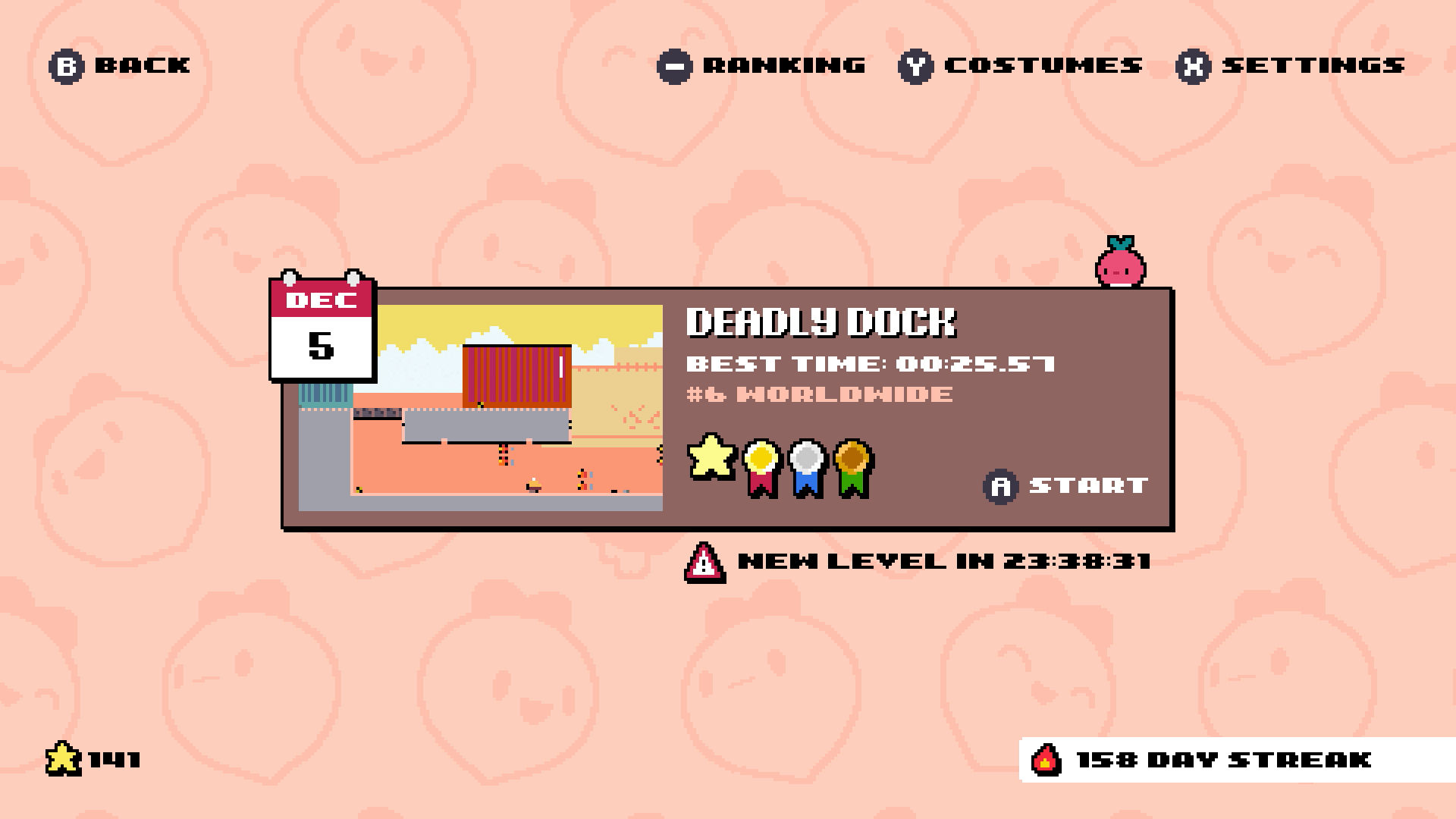 Sorti le 8 février 2023 sur l’eShop de la Nintendo Switch, ainsi que sur iOS, Android et PC (via Steam), le charmant Daily Dadish est la nouvelle création du développeur Thomas K. Young qui remet le couvert après Dadish 1, 2 et 3. Le concept est ici de proposer un niveau par jour pendant un an, chacun n’étant toutefois disponible que pendant la journée en question. À noter qu’il est également possible de s’adonner gratuitement au jeu sur navigateur par le biais de la plateforme Poki.