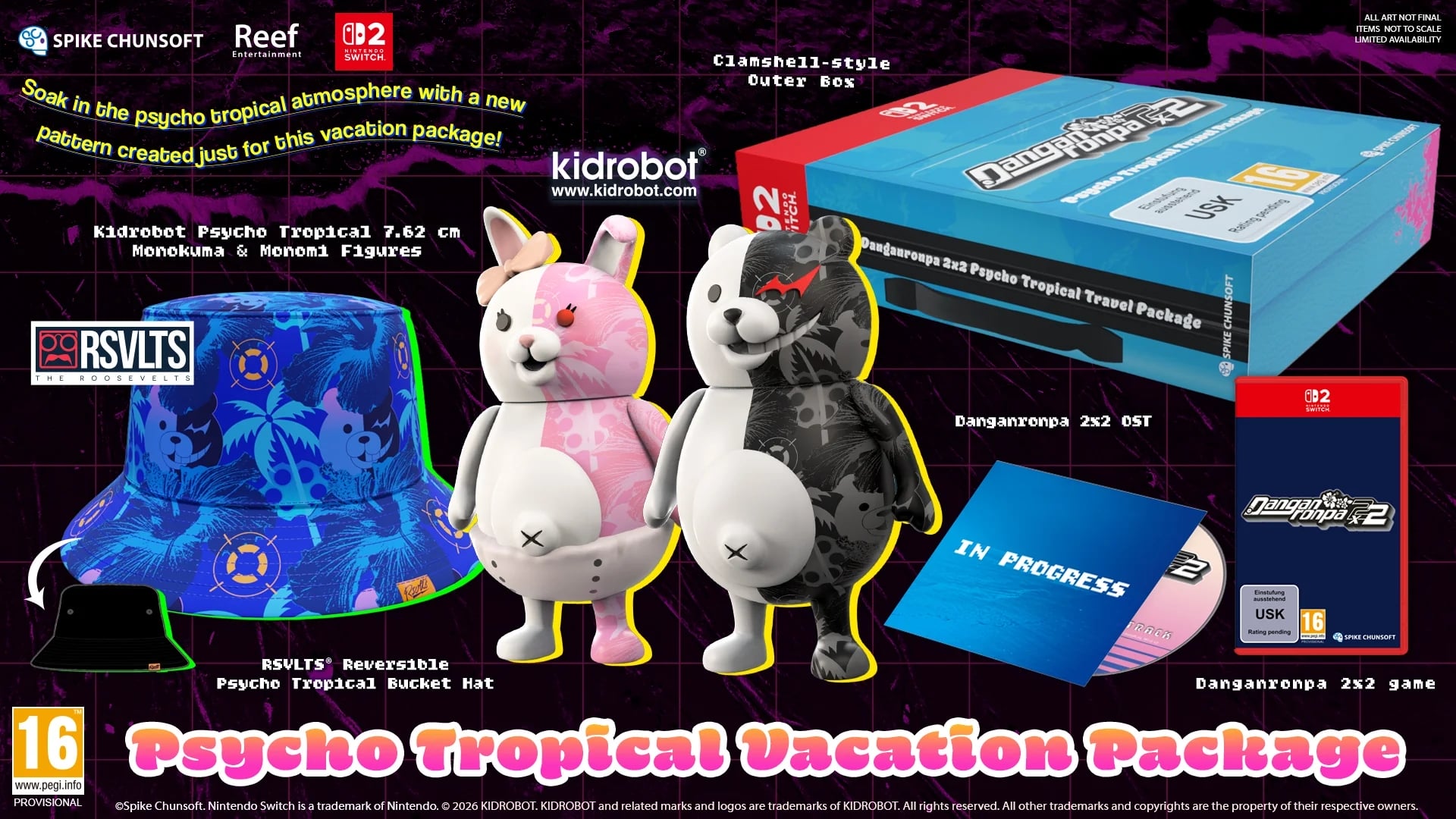 Spike Chunsoft n’a pas encore révélé la date de sortie précise de Danganronpa 2×2, mais a fini par annoncer des éditions physiques qui seront disponibles en Europe et en Amérique du Nord pour les versions Nintendo Switch 2, Nintendo Switch, PlayStation 5 et Steam. Les précommandes sont déjà disponibles pour l’édition limitée Psycho Tropical Vacation Package, qui peut être achetée uniquement sur les boutiques officielles de Spike Chunsoft au prix de 139,99 € en Europe et 139,99 $ aux États-Unis. Les précommandes pour l’édition standard sur Switch 2, Switch et PS5 commenceront progressivement en Europe et ont déjà débuté dans plusieurs boutiques en ligne américaines. On sait que c’est Reef Entertainment qui s’occupera de la sortie des éditions physiques en Europe. À noter que les éditions physiques pour la version Switch 2 comprendront bien une carte de jeu traditionnelle, et non pas une carte clé de jeu.