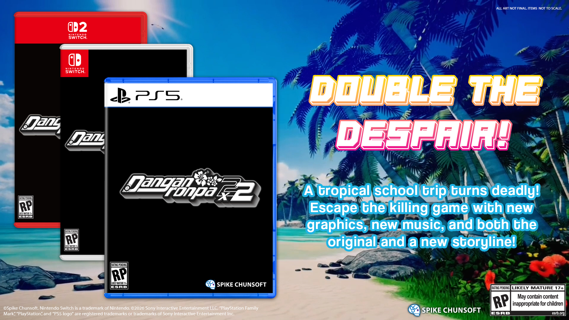 Dans le Nintendo Direct du 12 septembre 2025, Danganronpa 2×2 a été révélé pour la première fois sous sa version Nintendo Switch 2. Danganronpa 2 : Goodbye Despair revient donc plus de 10 ans après sa sortie initiale, le jeu ayant été publié à l’origine sur PlayStation Portable en 2012 au Japon avant d’être porté sur PlayStation Vita l’année suivante sur le même territoire puis en 2014 en Occident. Nintendo rappelle que l’histoire prend place au cours d’une excursion scolaire sur l’île de Jabberwock, où le protagoniste, Hajime Hinata, et ses camarades de classe se retrouvent piégés dans un jeu meurtrier. Après chaque incident mortel, un procès de classe a lieu. Dans ces phases de débat avec de l’action, le but est de trouver les contradictions et de contrer les adversaires pour révéler la vérité.