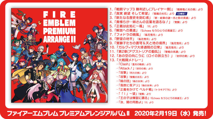 Le 19 février prochain, Intelligent Systems et Pony Canyon sortiront l’album Fire Emblem Premium Arrange II, en lien avec l’événement Fire Emblem Expo II au Zepp Namba d’Osaka au Japon. Comme ce fut le cas pour le premier événement Fire Emblem Expo qui avait eu lieu en 2018, il y aura un concert, avec une performance le 5 mai et deux autres le 6 mai où des invités seront présents (tous les détails en anglais à cette adresse). Plusieurs musiques arrangées de différents épisodes de la série, dont Echoes : Shadows of Valentia et Three Houses, ainsi que de toutes nouvelles chansons (basées sur des pistes existantes, mais avec des paroles pour la première fois), seront jouées.
