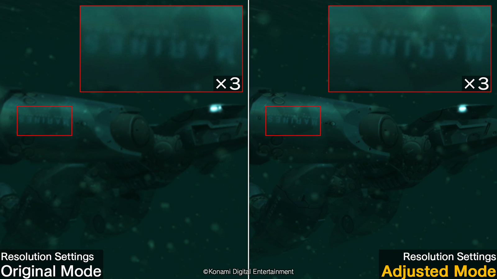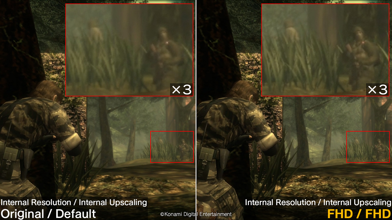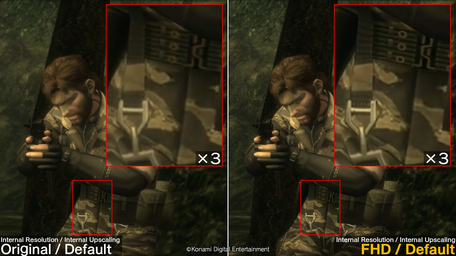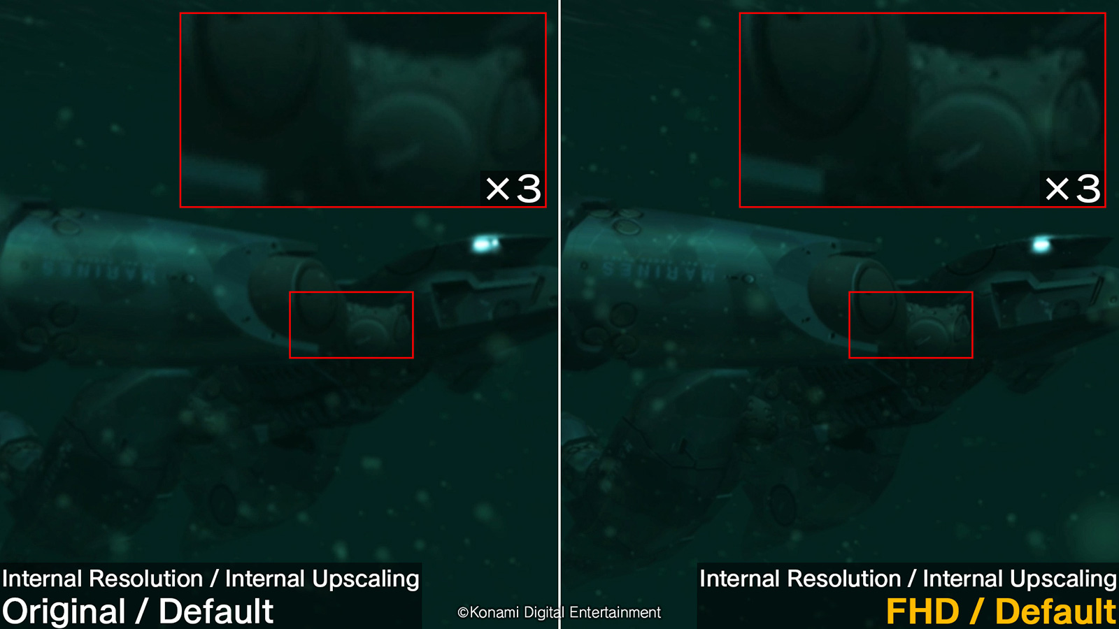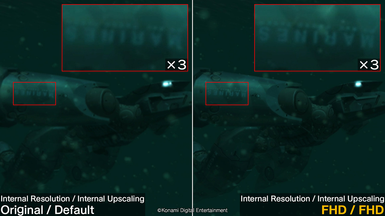 On trouve également le paramètre « suréchantillonnage interne », qui permet d’afficher le jeu de façon étirée. Il utilise une technologie de suréchantillonnage pour afficher le jeu dans une résolution plus élevée. De plus, modifier ce paramètre améliorera la netteté des visuels. Avec ce paramètre, le mode Défaut affiche le jeu à sa résolution d’origine, tandis que le mode FHD affiche le jeu en FHD en utilisant une méthode de mise à l’échelle différente de celle de la version d’origine de la Master Collection. Konami indique que si le téléviseur peut supporter une résolution supérieure à celle sélectionnée, le jeu sera alors affiché en utilisant la méthode de mise à l’échelle de la version originale de la Master Collection à la résolution la plus élevée possible.