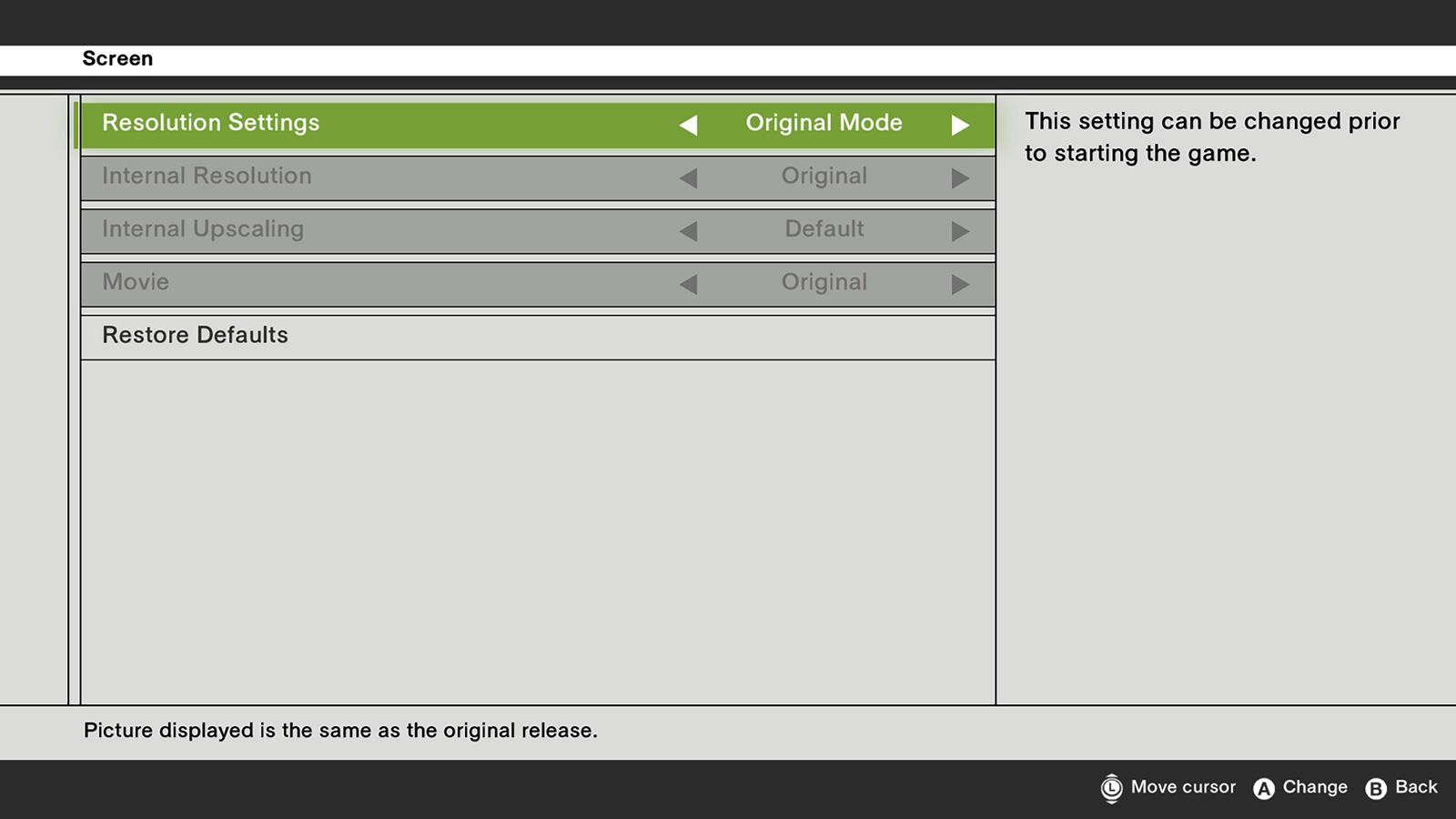 Il y a aussi une option « Résolution interne », qui permet désormais de choisir d’afficher le jeu en Full HD ou dans sa résolution d’origine. Le mode Original rétablit le jeu dans sa résolution d’origine, tandis que le mode FHD augmente la résolution interne du jeu et la passe en FHD lors de l’affichage. Ce mode FHD améliore simplement la netteté des visuels.