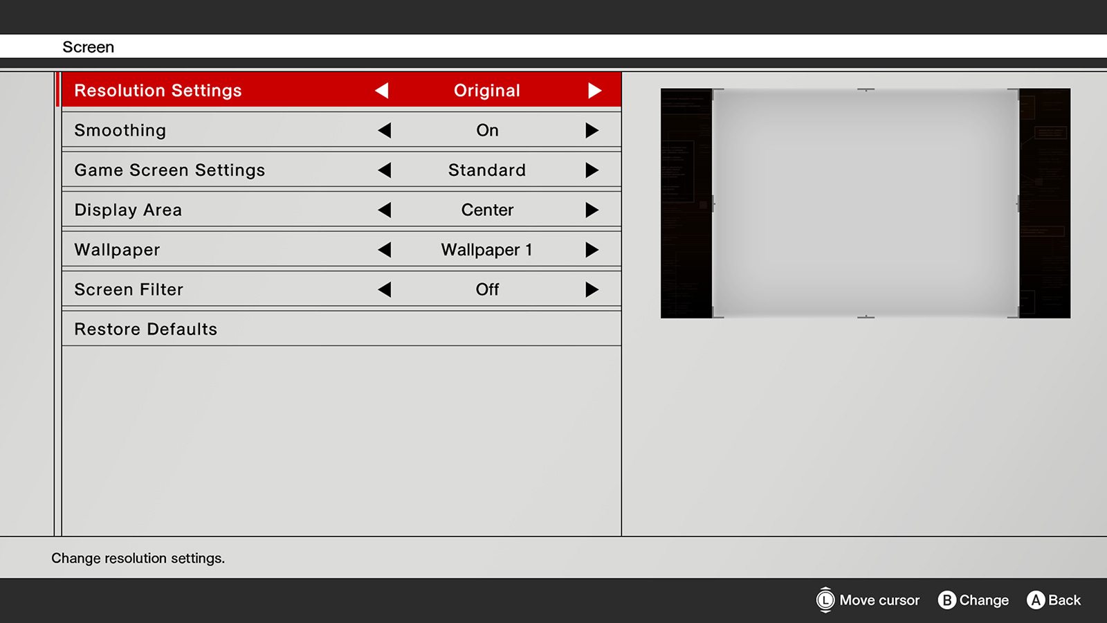La configuration Mode ajusté affiche le jeu dans la plus haute résolution supportée par l’écran. Les graphismes seront plus détaillés qu’en mode Original. En sélectionnant ce mode, les paramètres suivants seront appliqués :