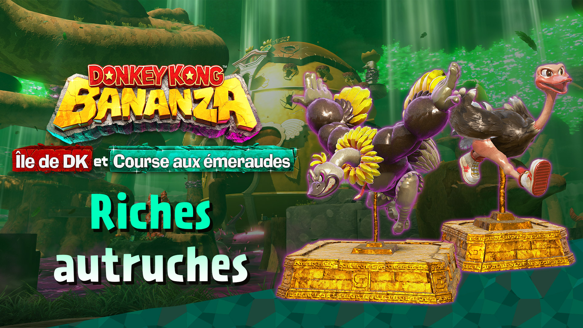 Le DLC ÃŽle de DK et Course aux émeraudes de Donkey Kong Bananza a désormais droit à son cinquième événement, nommé « Riches autruches ». Disponible jusqu’au 24 février 2026 à 08:59, il s’agira encore une fois d’une course aux émeraudes spéciales qui permettra d’obtenir des statues de la Bananza autruche de Donkey Kong Bananza et d’Expresso de la série Donkey Kong Country. Nintendo indique que contrairement aux courses aux émeraudes standard, les éléments habituellement aléatoires comme les compétences obtenues grâce aux rondelles de banandium seront prédéfinies. Comme cela a été révélé précédemment, il y aura des événements chaque mois. Chacun d’eux demandera de participer à un défi spécial Course aux émeraudes. À chaque fois qu’un événement temporaire sera organisé, des statues spéciales seront à gagner en jeu. Cependant, les événements concerneront uniquement le DLC. Pour en savoir plus à son sujet, vous pouvez consulter notre article sur ÃŽle de DK et Course aux émeraudes à cette adresse. Des astuces sont également disponibles ici.