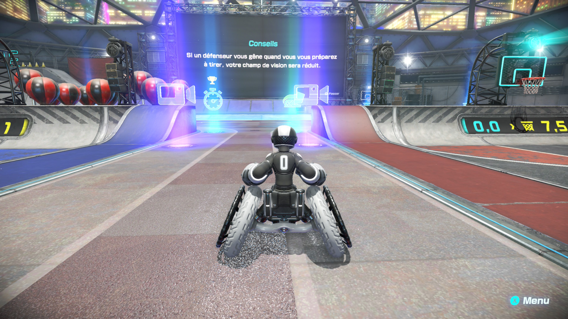 La chance de réussite des tirs est déterminée en fonction de la distance jusqu’à l’anneau (à quel point le joueur est proche de l’anneau) et de l’orientation du joueur par rapport à l’anneau (à quel point le joueur est face à l’anneau).