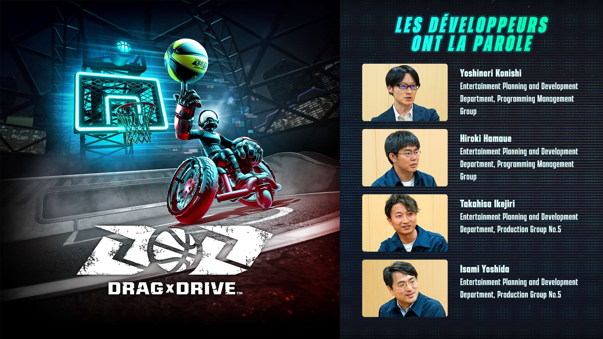 Lors de la sortie de Drag x Drive, grâce aux crédits , il a été remarqué que le jeu a été développé par une petite équipe. Sans compter les Special Thanks, la production et les équipes des localisations, 18 personnes sont créditées. On apprend par exemple que les musiques de Drag x Drive ont été composées par Sayako Doi . Elle a rejoint Nintendo en 2019 et a commencé à travailler sur la composition des musiques de Super Mario Maker 2 , pour ensuite Å“uvrer sur Animal Crossing : New Horizons , Metroid Dread , Cérébrale Académie : bataille de méninges , Splatoon 3 , Nintendo Switch Sports : Basketball et Super Mario Bros. Wonder . Un nom assez connu apparaît également tout à la fin : Hisashi Nogami . On lui attribue la création des séries Animal Crossing et Splatoon. Alors qu’il avait été réalisateur dans le domaine du design pour Animal Crossing sur Nintendo 64 et GameCube puis Animal Crossing : Wild Word sur DS , on le retrouve de nos jours en tant que producteur chez Nintendo, de Splatoon premier du nom, à Splatoon 3 , en passant par Animal Crossing : New Horizons. Concernant Drag x Drive, il était là aussi producteur.