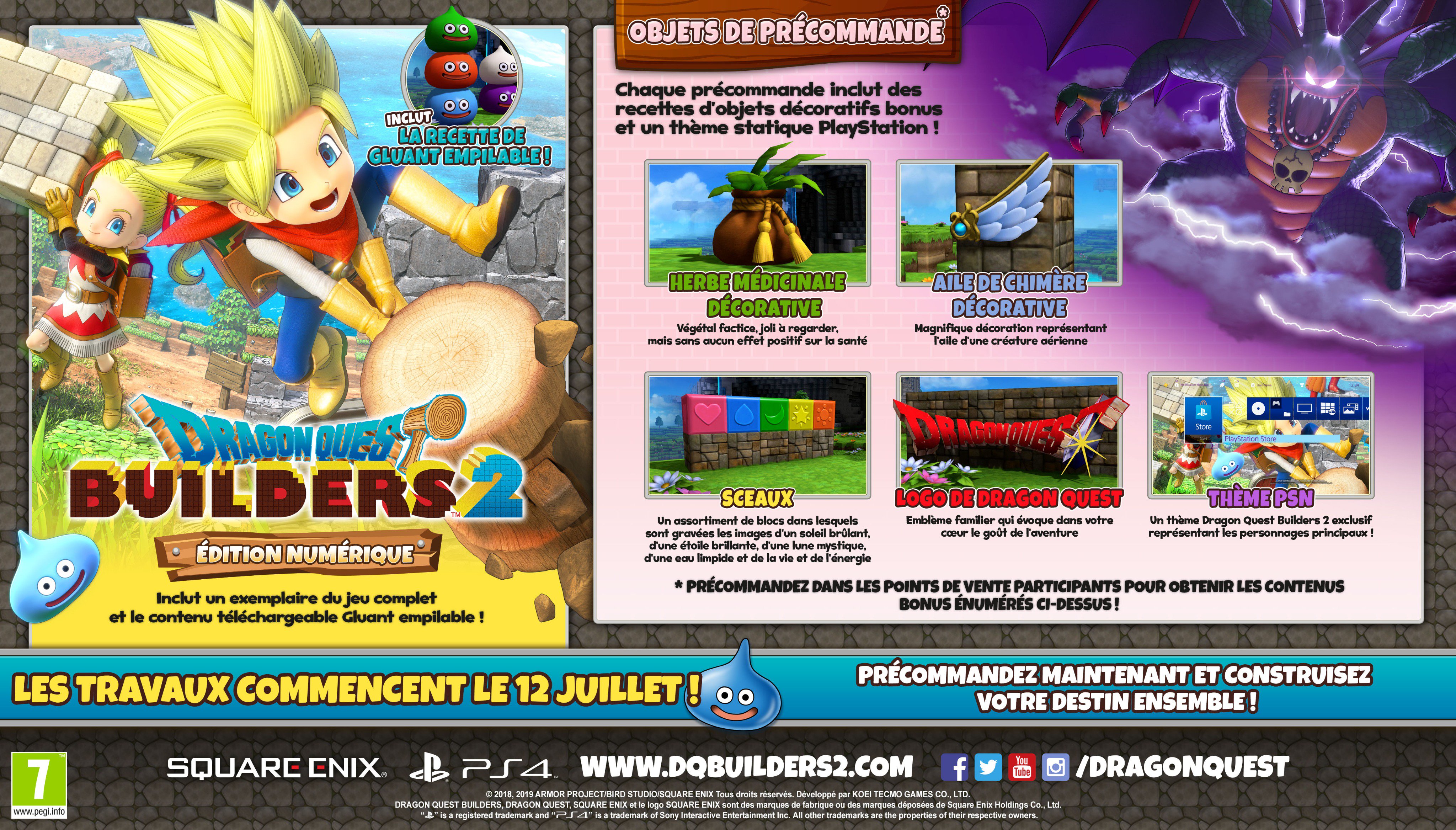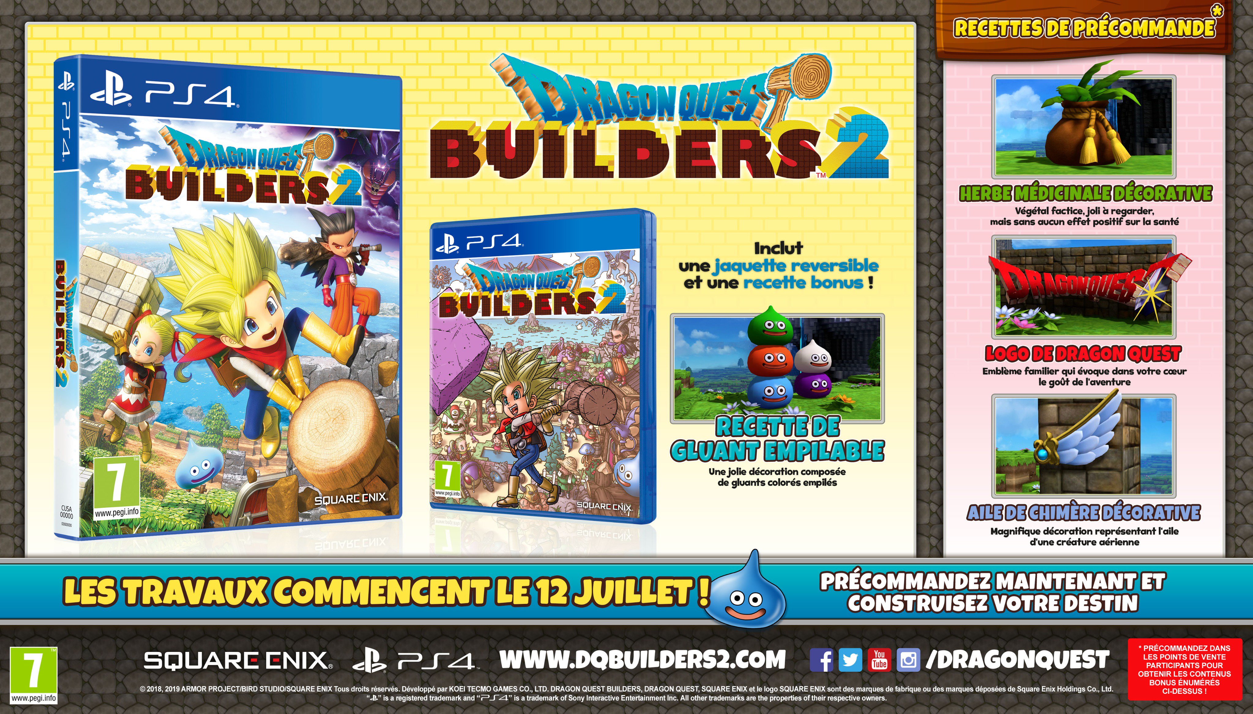 Dragon Quest Builders 2 arrive dans moins de deux mois en Europe et aux États-Unis, le 12 juillet précisément, Nintendo et Square Enix ont donc lancé les précommandes des versions Switch et PlayStation 4 en même temps, le jeu coûtant 59,99 € en dématérialisé. L’édition physique sur Switch et PS4 peut aussi être précommandée (le prix étant différent en fonction des boutiques, mais il se situe généralement entre 49,99 € et 59,99 €), et il y aura d’ailleurs une couverture réversible contenant l’illustration spéciale d’Akira Toriyama qui figure sur la jaquette japonaise (elle est bien confirmée pour la version PS4, mais nous attendons encore la confirmation pour la version Switch). Par ailleurs, Nintendo a confirmé que les personnes qui possèdent Dragon Quest Builders sur Switch pourront fabriquer la tenue du Bâtisseur Légendaire ainsi que le trône du Seigneur Dragon dans Dragon Quest Builders 2. Nous vous présentions ces bonus dans cet article.