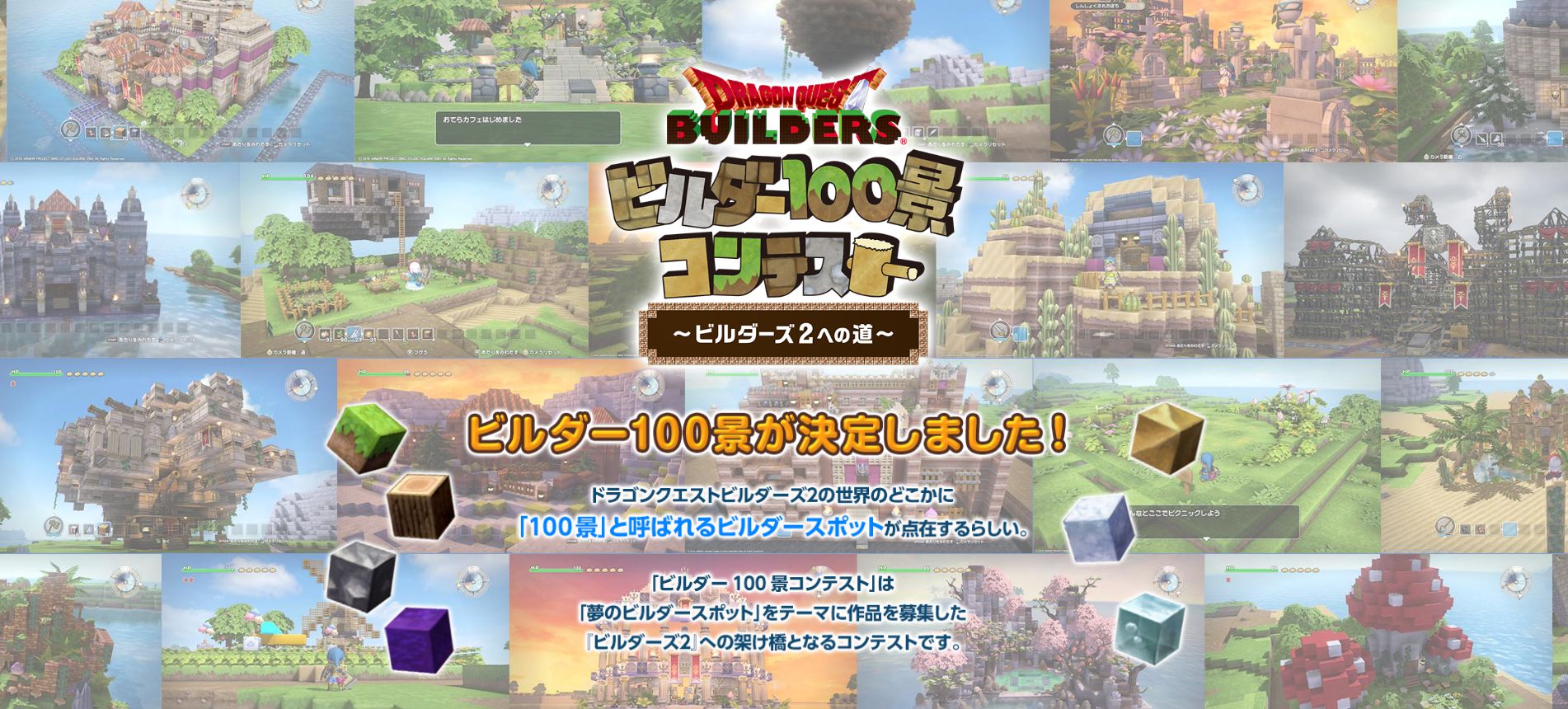 En février dernier, Square Enix a organisé le concours Builders 100 Landscapes Contest : The Road to Builders 2 qui demandait aux fans du Japon de concevoir leurs plus belles créations dans Dragon Quest Builders sur PlayStation 4, PS3, PS Vita ou Nintendo Switch. Aujourd’hui, les résultats ont enfin été annoncés et les 100 gagnants du concours ont été révélés. Square Enix en a également profité pour faire une annonce assez intéressante : les créations de ces 100 vainqueurs apparaîtront toutes dans Dragon Quest Builders 2. Pour le moment, nous ne savons pas comment elles apparaîtront exactement mais nul doute que plus d’informations seront dévoilées dans les prochains jours. Dans tous les cas, vous pouvez déjà voir à quoi ressemblent chaque construction sur le site officiel du jeu en cliquant sur les pseudos des gagnants.