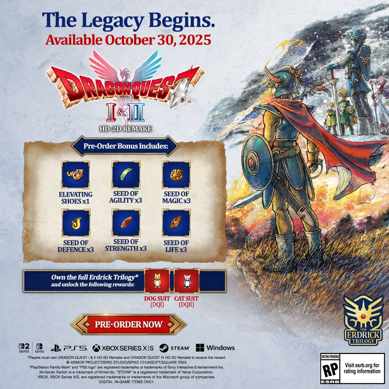 À l’occasion du Dragon Quest Day, le tout premier épisode de la série étant sorti sur Famicom le 27 mai 1986, Square Enix a annoncé que Dragon Quest I & II HD-2D Remake sera disponible précisément le 30 octobre 2025 sur Nintendo Switch 2, Nintendo Switch, PlayStation 5, Xbox Series et PC via Steam et Microsoft Store. La version Switch 2 a été annoncée pour la première fois ce 27 mai. Les précommandes sont désormais disponibles sur les boutiques officielles de Square Enix (ici pour la France) pour deux versions physiques différentes : une édition Standard à 59,99 € sur Switch et 69,99 € sur Switch 2, PS5 et Xbox Series X, et une édition Collector coûtant 149,99 € sur Switch et 159,99 € sur Switch 2, PS5 et Xbox Series X. Les éditions physiques pour la version Xbox Series X ne sortiront pas au Japon (à noter que le contenu des éditions vendues au Japon est identique à celles proposées en Occident).