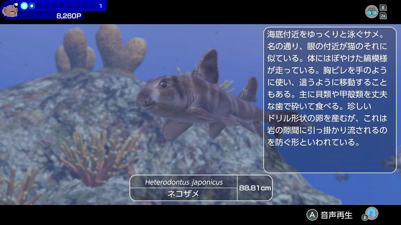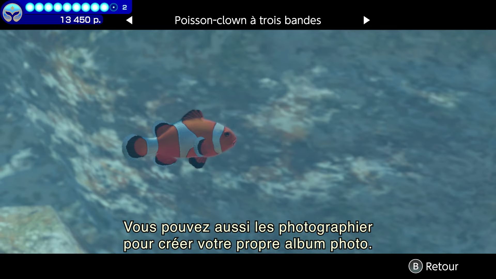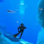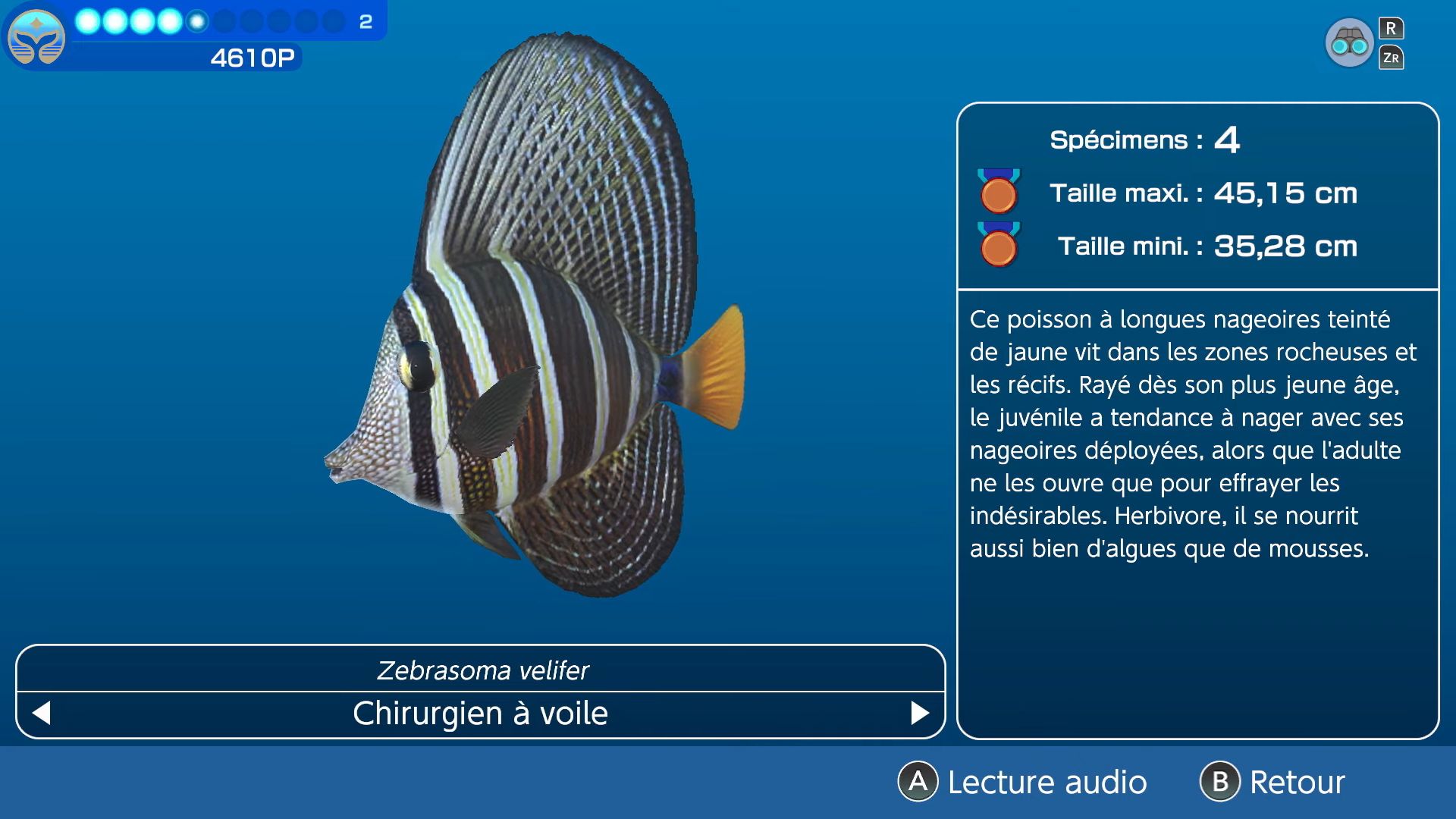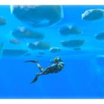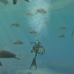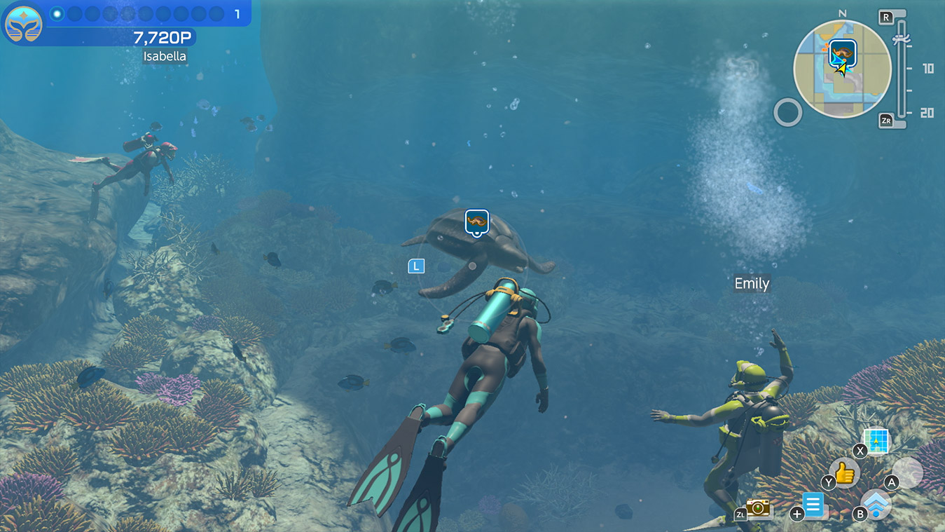 Dans un article publié sur le blog officiel japonais de Nintendo, on en apprend un peu plus sur le jeu et les activités proposées. En plongeant dans la mer Voilée, on pourra donc observer de nombreuses créatures marines, et si une espèce en particulier nous intéresse, on pourra essayer de nager avec elle. Nager avec les dauphins sera donc possible, par exemple, ou bien avec un banc de poissons, une raie Manta, un homard et plus encore. Par contre, au début du jeu, il y aura seulement un nombre limité d’espèces avec lesquelles on pourra nager. Il faudra augmenter notre rang, ce qui augmentera ensuite le coût de natation permettant donc de nager avec une plus grande variété de créatures marines. Le jeu embarque également une encyclopédie incluant des informations sur chaque espèce rencontrée, une description et d’autres détails (la taille maximale ou minimale par exemple). Chaque créature observée au cours du jeu sera ajoutée automatiquement à l’encyclopédie et on pourra consulter les informations à tout moment grâce à une assistante de recherche. Et si l’on parvient à trouver toutes les espèces et compléter ainsi l’encyclopédie, on pourra peut-même devenir professeur en biologie marine. Bien sûr, il sera également possible de prendre des photos des paysages et de la vie marine, de prendre des selfies de notre personnage (avec des créatures ou d’autres joueurs à côté) ou de photographier un spécimen spécifique. Toutes les photos seront sauvegardées automatiquement sur la Switch.