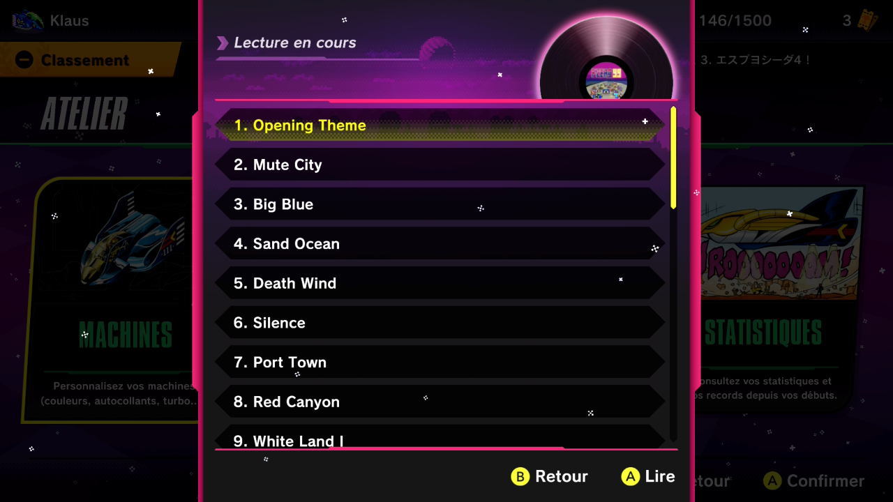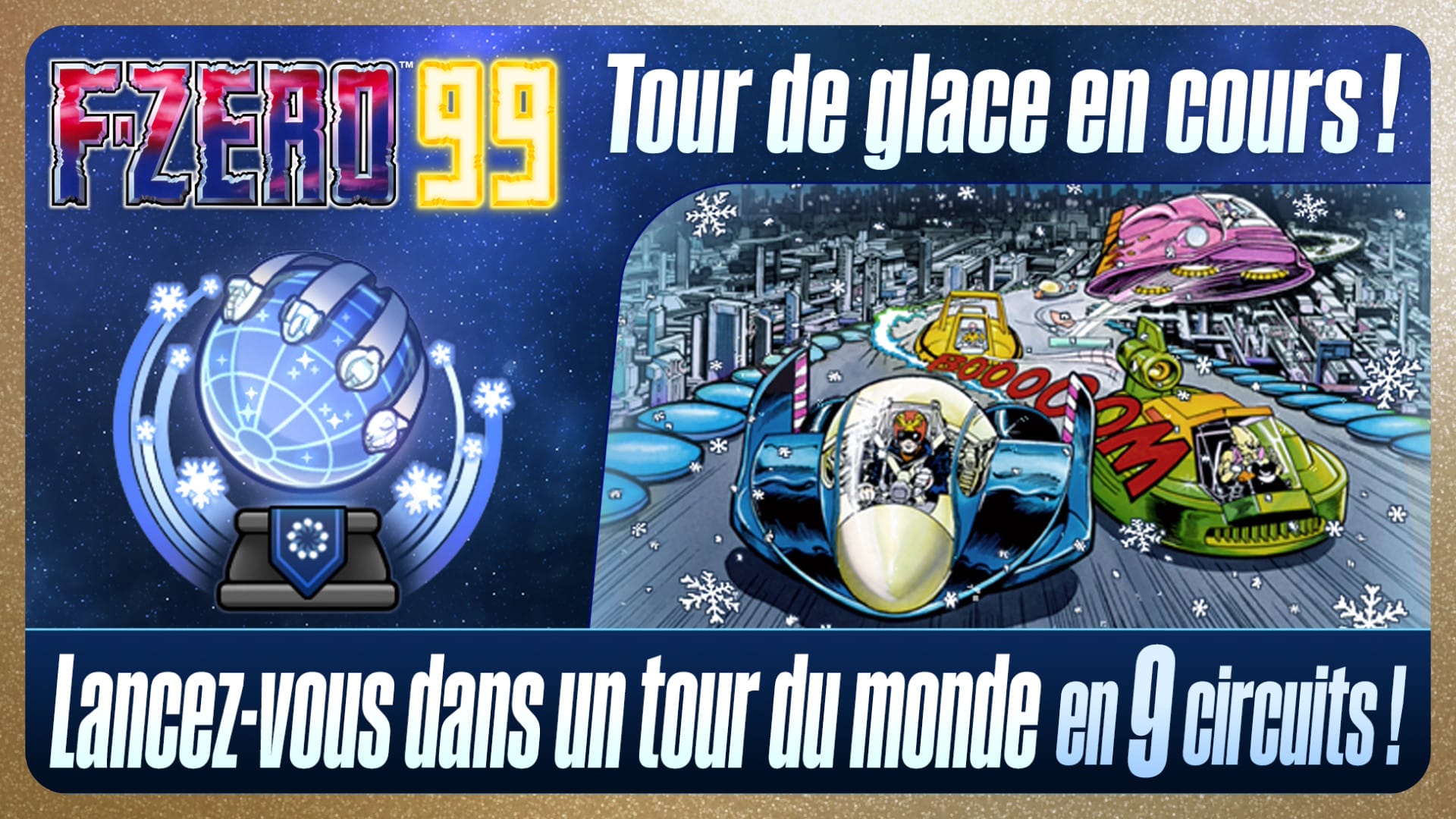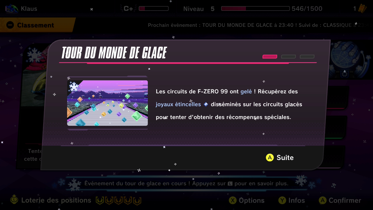 Nintendo a sorti ce 9 décembre 2025 une nouvelle mise à jour pour F-ZERO 99, qui passe le jeu à la version 1.7.0. Le jeu profite désormais d’un habillage spécial au cours des événements Tour de glace et Tour du monde de glace, qui ont lieu jusqu’au 19 janvier 2026. Le tour du monde revient avec neuf circuits à travers la galaxie. Dans cet événement à durée limitée, il faut participer à des courses en trois tours et marquer des points. Un classement hebdomadaire spécial a été ajouté à cet événement et les 999 meilleurs pilotes recevront un badge spécial. Le menu est désormais enneigé et tous les circuits apparaissent en tant que circuits glacés. Dans ces derniers, on peut récupérer des joyaux étincelles disséminés un peu partout afin de tenter d’obtenir des récompenses spéciales. En démarrant F-ZERO 99 après avoir appliqué la mise à jour, on nous indique qu’il est désormais possible de jouer à la loterie des positions plus d’une fois par jour en utilisant des jetons de la chance. On peut obtenir un jeton quotidiennement (même si l’on ne joue pas) et en conserver jusqu’à six à la fois. Gagner des niveaux nous rapporte aussi des jetons de la chance. La mise à jour a aussi ajouté trois nouveaux circuits secrets, qui apparaissent de temps en temps dans le mode F-ZERO 99. De plus, les pilotes de niveau S20 ou supérieur du monde entier sont maintenant regroupés dans le classement d’élite. Les pilotes de niveau S50 obtiennent la position d’élite (avec un symbole de faucon) et sont classés en fonction de leurs points d’élite. Autre nouveauté de taille : le Juke-box, que l’on peut trouver dans l’atelier et qui permet donc d’écouter les musiques du jeu. Pour rappel, F-ZERO 99 crédite trois personnes à l’audio : JamesPhillipsen (Audio Lead), Eric Pansulla (Audio) et Ina Almacen (Audio).