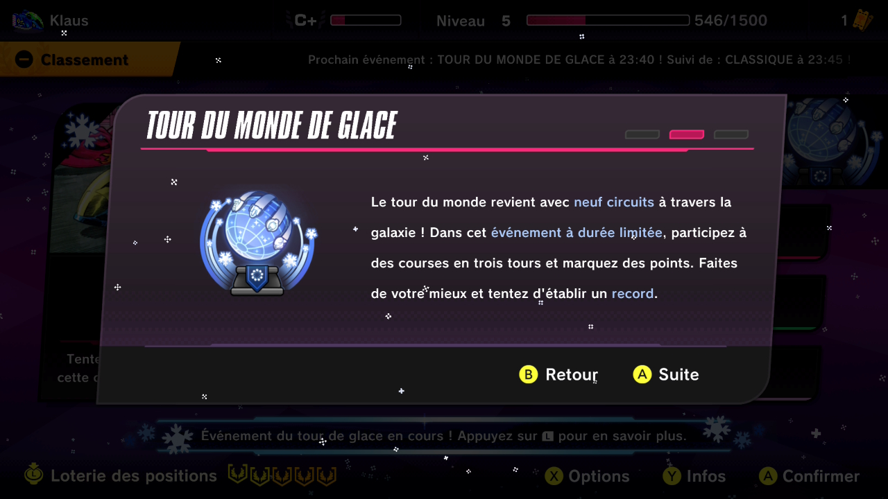L’événement Tour de glace se déroulera cette année. Tous les circuits dans le jeu seront enneigés et apparaîtront en tant que circuits glacés. En récupérant les joyaux étincelles qui apparaissent sur les circuits glacés, les joueurs peuvent obtenir des récompenses offertes uniquement pendant cet événement.