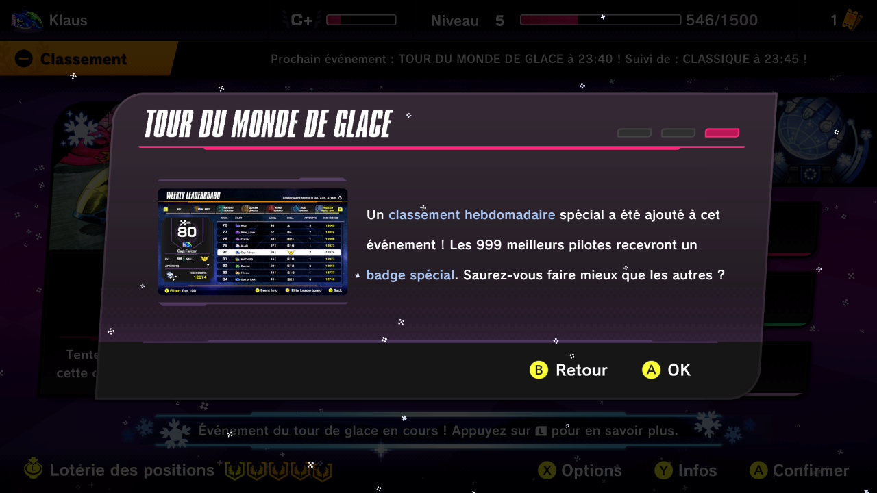 Un onglet Tour du monde de glace affichant les classements basés sur les records a été ajouté au classement hebdomadaire. Ce classement sera réinitialisé chaque dimanche à 16 h HNP (00:00 TUC).