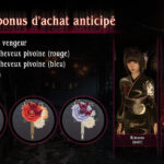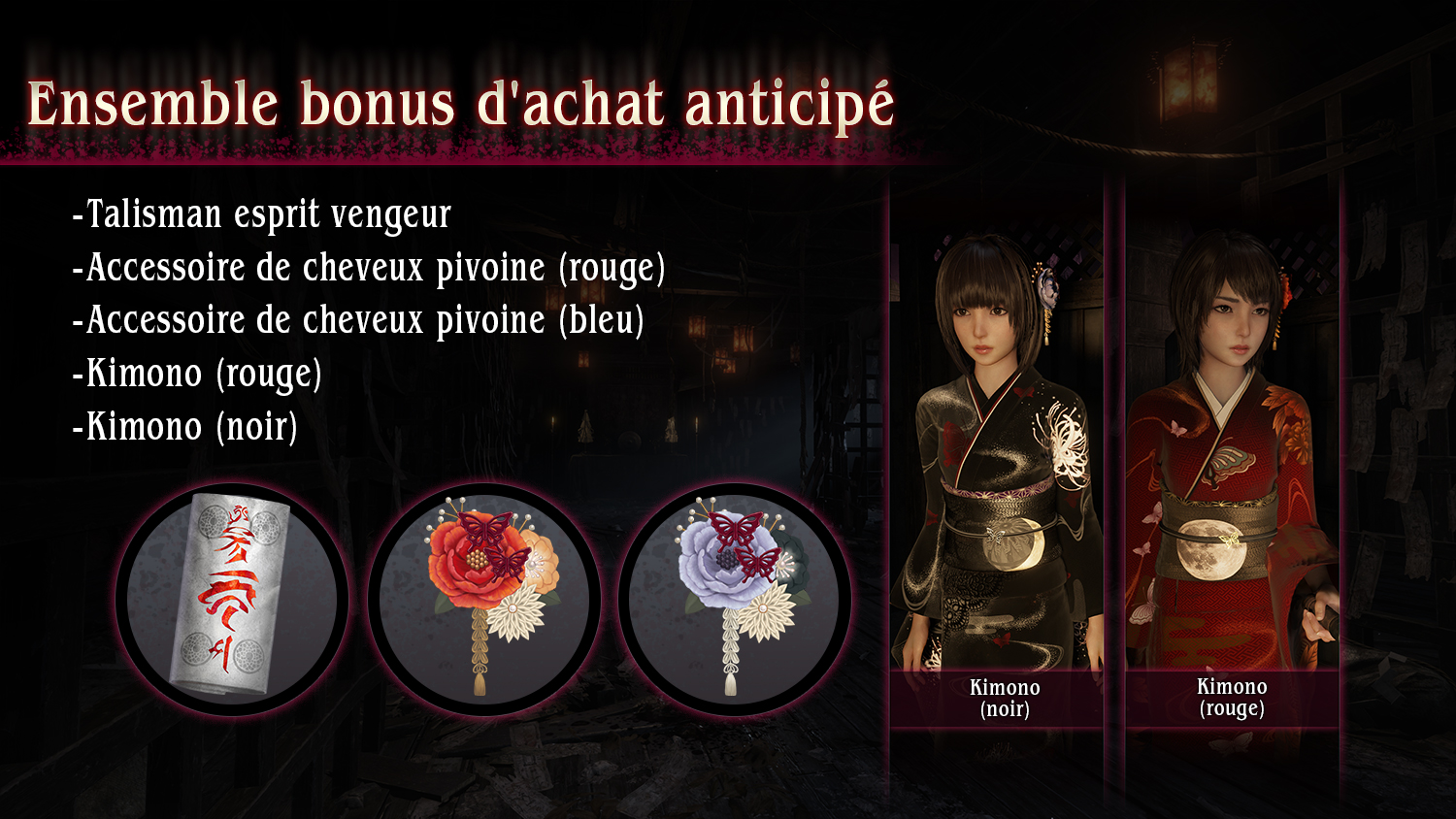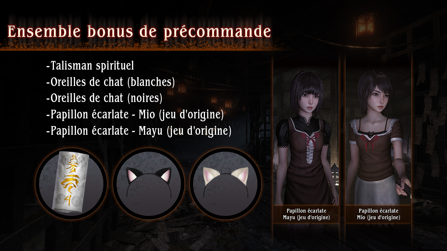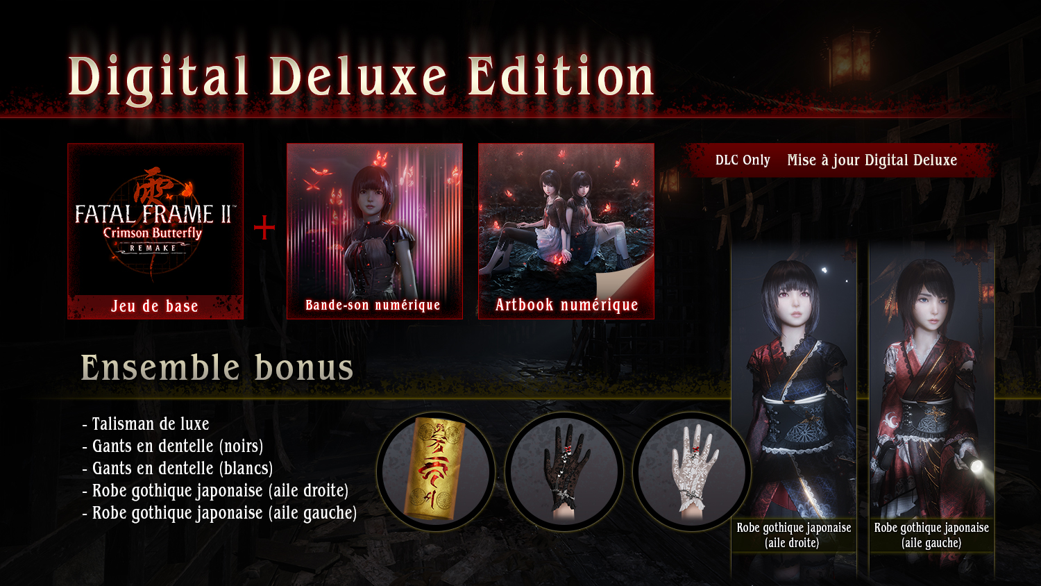 En achetant Fatal Frame II : Crimson Butterfly Remake avant le 25 mars 2026, un DLC est offert, permettant d’obtenir un talisman esprit vengeur, deux accessoires de cheveux pivoine (rouge et bleu) et des kimonos (rouge pour Mio et noir pour Mayu). En se procurant la version dématérialisée, ce DLC est automatiquement inclus. Cependant, en ce qui concerne l’édition physique, il faut se procurer le DLC séparément sur les boutiques en ligne. Pour la version Switch 2, il suffit donc de se rendre sur l’eShop ou les sites officiels de Nintendo (ici pour l’Europe) et de télécharger l’« Ensemble bonus du premier acheteur Fatal Frame II : Crimson Butterfly Remake ». Les tenues et accessoires peuvent être équipés aux points de sauvegarde. À noter que certains bonus pourraient être proposés à l’achat ou offerts gratuitement en tant que contenu supplémentaire à une date ultérieure. Les personnes qui ont précommandé le jeu au format numérique peuvent aussi recevoir un talisman spirituel, des oreilles de chat (blanches et noires) et les tenues « papillon écarlate » pour Mio et Mayu qui reproduisent leur apparence du jeu d’origine. Divers produits dérivés sont également disponibles sur la boutique officielle japonaise de Koei Tecmo.