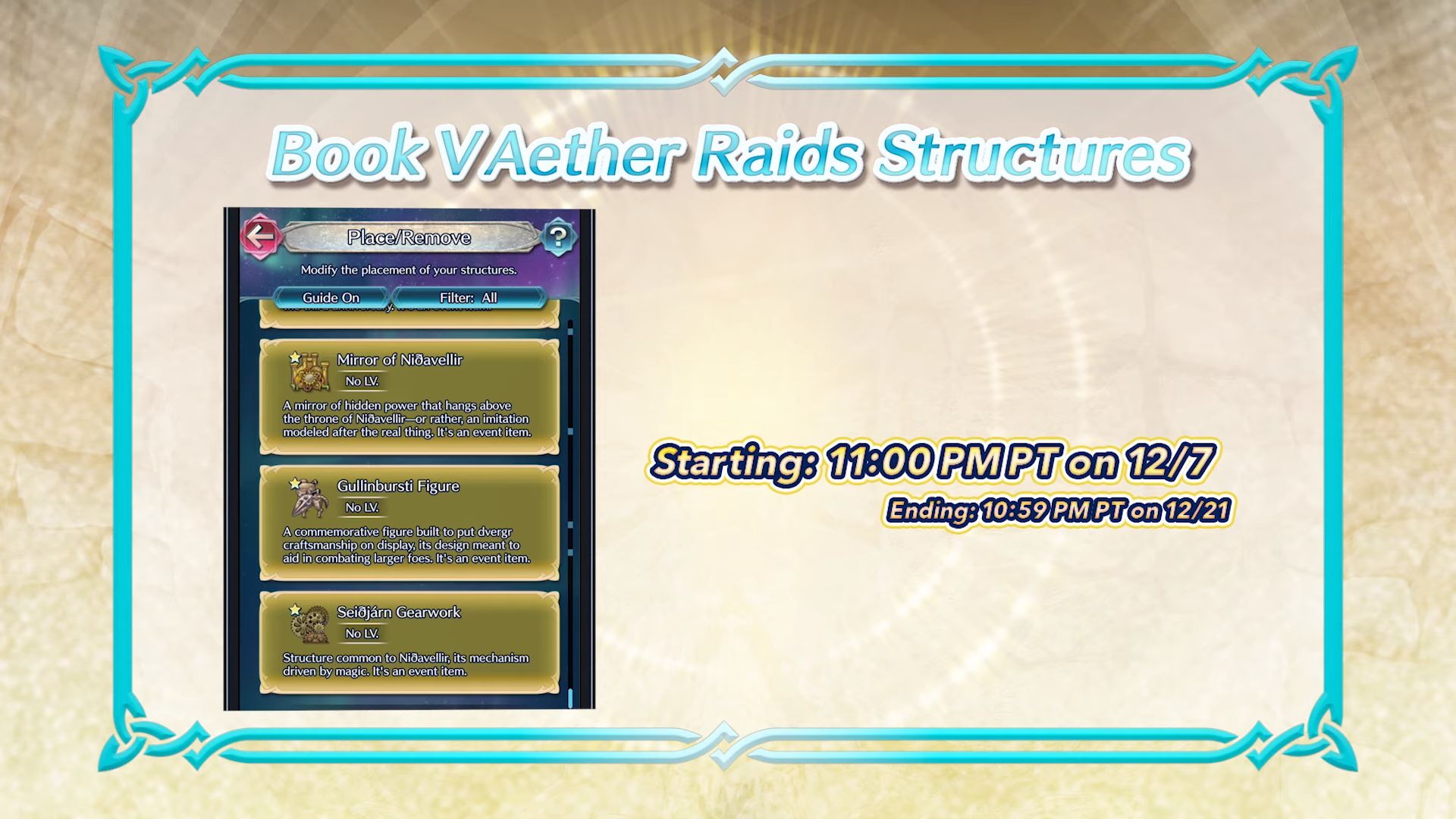 Le royaume de Niðavellir est un monde où la magie et la science ont fusionné. Le peuple de Niðavellir peut participer à des combats à l’aide d’armures mécaniques de haute technologie, appelée seiðjárn. Les armures se nomment Gullinbursti. D’autres personnages apparaissent dans la cinématique du livre V et sur l’illustration principale, mais il faudra attendre les autres chapitres qui arriveront dans les mois à venir pour les découvrir. Pour le moment, seuls deux chapitres sont disponibles. Terminer le premier en normal permet d’obtenir une version 5 étoiles de Reginn gratuitement. Elle est classée en tant qu’héroïne mythique de type astra. À noter que le design des nouveaux personnages du livre V a été réalisé par l’artiste Yusuke Kozaki, qui travaille sur la série depuis Awakening.