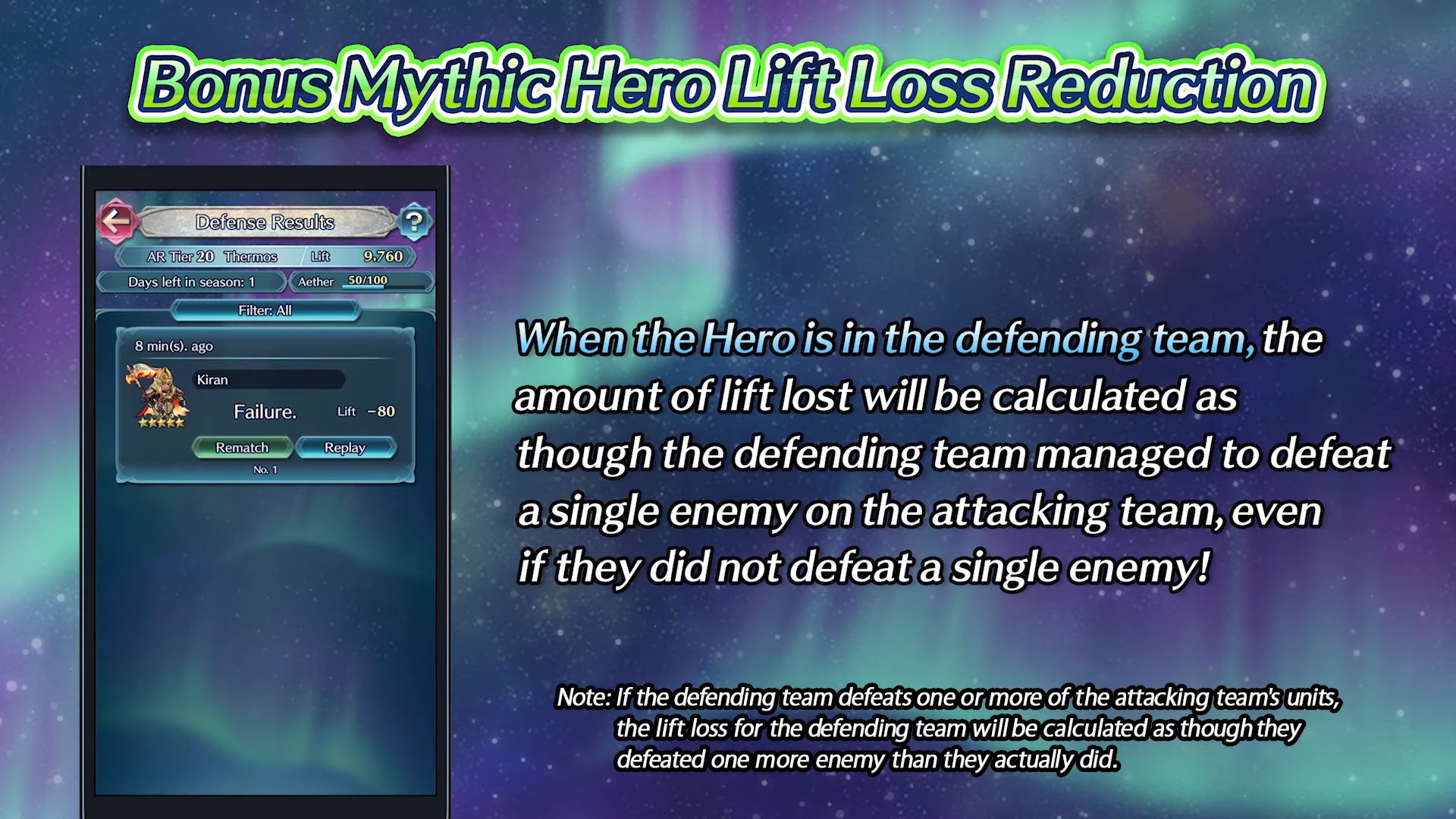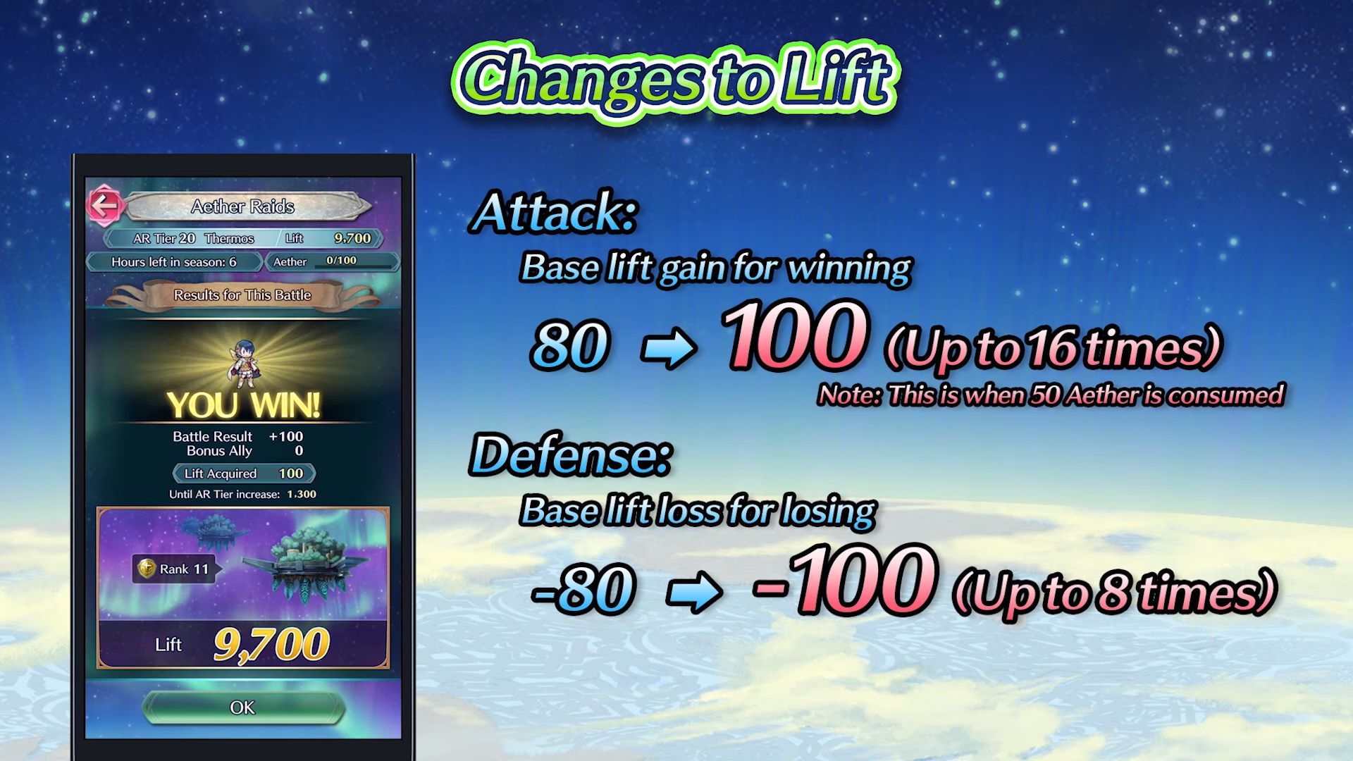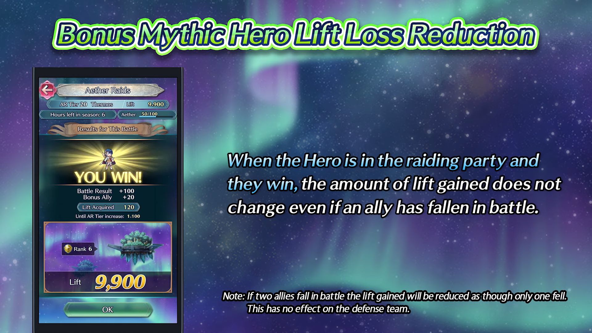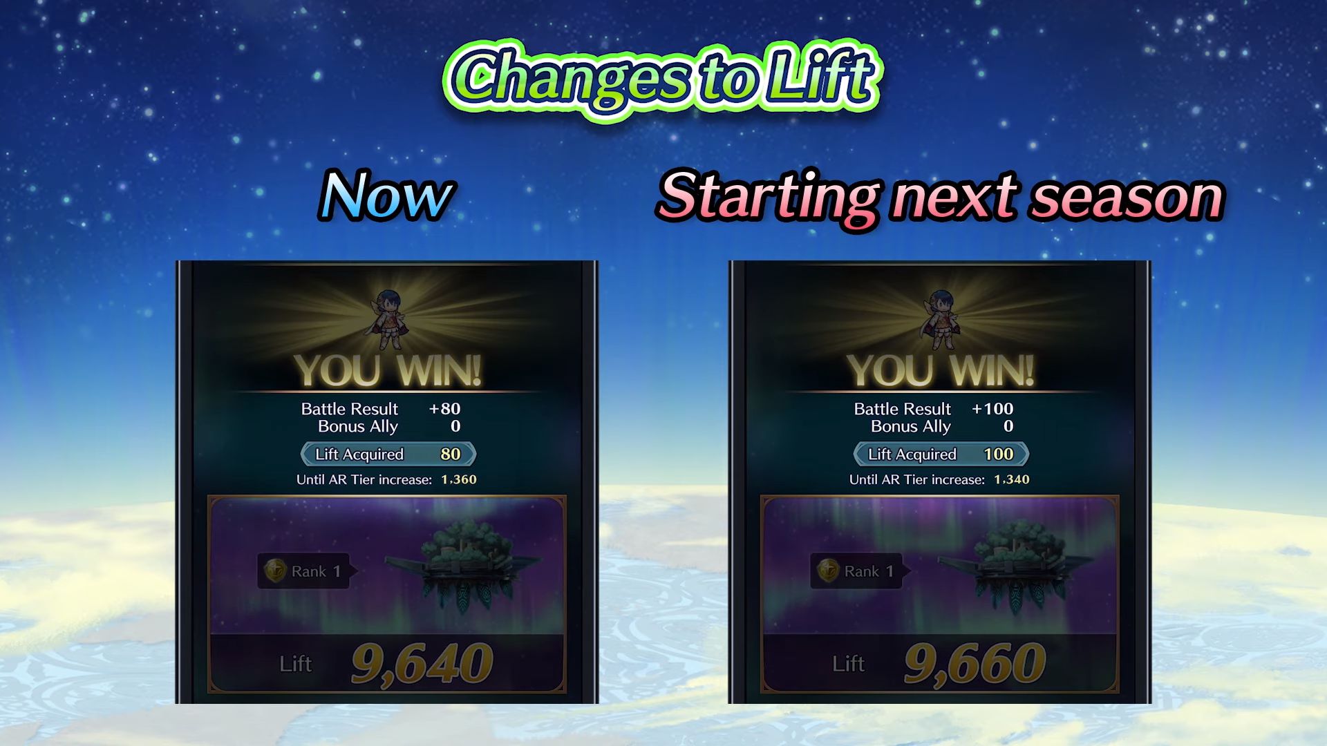 Plusieurs nouveautés ont été apportées au jeu, à commencer par des changements pour le mode Raid céleste. Certaines règles ont été modifiées et un effet mythique a été ajouté. La valeur de base du gain d’altitude reçu quand l’équipe d’attaque remporte la victoire est passé de 80 à 100. Cependant, il en est de même pour la perte d’altitude de base en cas d’échec de la défense. On peut attaquer jusqu’à 16 fois, mais on ne peut attaquer que jusqu’à 8 fois. Le rang 28 a été également ajouté, et à partir de la nouvelle saison du mode RC, les règles des héros de l’Appel aux armes changent. Chaque saison, les listes de l’Appel aux armes incluront un héros mythique pour les équipes d’attaque et de défense. En ajoutant un héros mythique à l’équipe, un effet spécial s’activera. En gagnant, même si l’un des alliés est vaincu, l’altitude augmentera comme si de rien n’était, et en cas d’échec de la défense, on perdra 20 points d’altitude de moins que prévu.