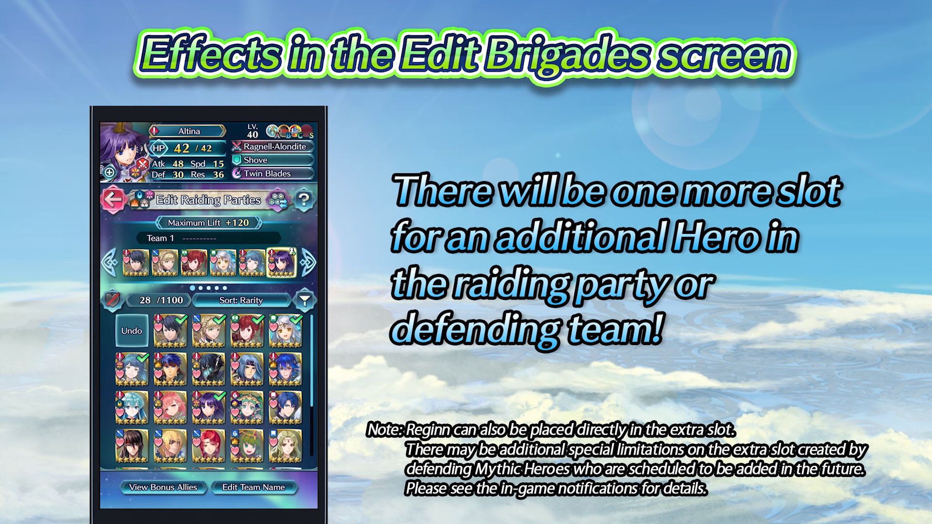 Le nouvel effet mythique permet à des héros comme Reginn d’obtenir un emplacement en plus pour les unités pendant la saison correspondante après avoir ajouté un héros mythique à l’équipe. Toutefois, il sera possible d’utiliser cet emplacement uniquement pour un héros légendaire ou mythique de la saison ou un héros ayant reçu la bénédiction correspondant à la saison. Le héros supplémentaire ajouté n’influencera pas la valeur de l’altitude.