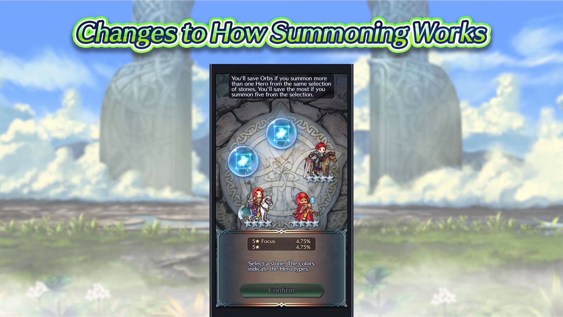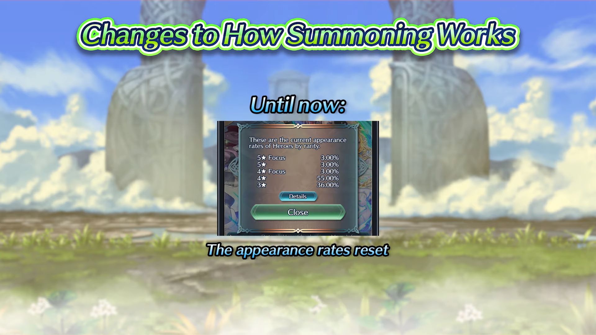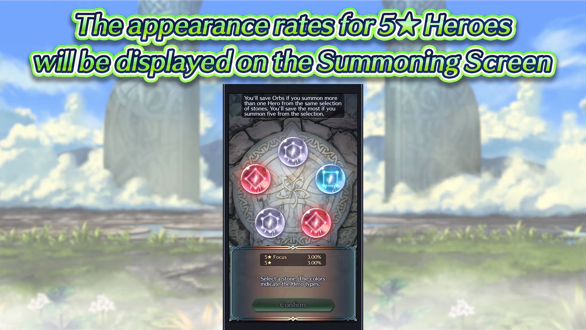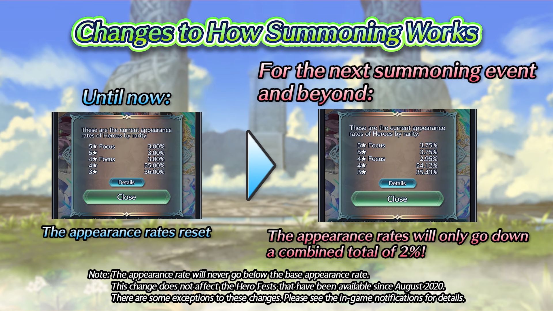 Des changements ont été aussi apportés à l’écran d’invocation et à son fonctionnement. On peut désormais voir le taux d’apparition des héros 5 étoiles sur l’écran d’invocation et consulter ainsi les taux d’apparition n’importe quand avant toute invocation. Le fonctionnement des invocation a aussi changé, puisqu’après avoir obtenu un héros 5 étoiles dans focus qui ne fait pas partie de ce dernier, le taux d’apparition ne sera pas réinitialisé et restera supérieur à la normale. Il diminuera seulement de 2 % maximum. Cependant, si un héros 5 étoiles du focus est invoqué, le taux d’apparition est toujours réinitialisé.