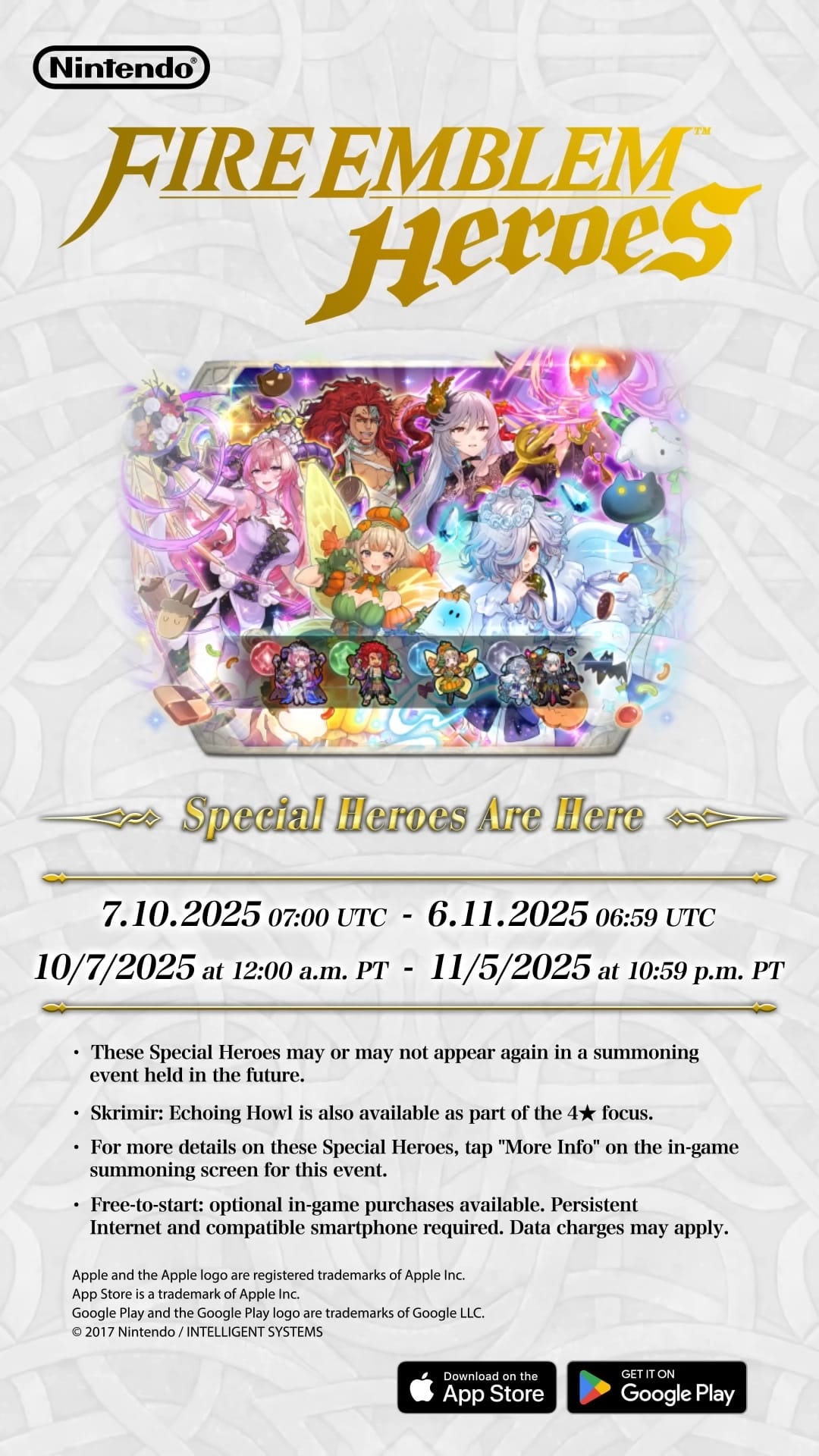 D’autres événements spéciaux verront le jour dans les prochains mois. Comme pour les focus Festival du printemps, vive les mariées, l’été ylissien, l’été nohrien, spectacle vivant, Sinistre moisson, festival de l’hiver, bonne année !, L’amour toujours, Lapins printaniers, C’est le bouquet, Voilà l’été, Un été artistique, Fête en Hoshido, Le don de la terre, Cadeaux de l’hiver, Nouvel an du feu et de la glace, La source des héros, Les fidèles de Greil, Lapins royaux, Pique-nique idéal, Joie nuptiale, Retour de l’été, Réveil estival, Soirée splendide, Récolte monstre, Glorieux cadeaux, Esprit renouvelé, Jolis cadeaux, fête en famille, La genèse, Mariés aimés, Été éphémère, Souvenirs marins, fierté pirate, rêve infini, Moisson de dragon, Moment présent, miracle du festival, Nouvel An : héros spéciaux ω, Rituels du désert, Amour d’un roi, Lapins entêtés, Réunion d’enfance, Grâce nuptiale, lueur d’été, rêve d’un jour d’été, Mers périlleuses, héritiers des douze, Abondance partagée, entraînement ninja, Rêve hivernal, Tel un mécanisme, Royaumes perdus, Ici à mes côtés, Lapine chercheuse, Amitié improbable, fleurs nuptiales, Vacances d’été, soumis à la marée, Chasse au trésor, Feu aux poudres, Divine moisson, ninjas et wyvernes, mission festive, Nouvel An divin, Sage de Khadein ?, un cadeau spécial, printemps éternel, peu importe le lieu, rêves nuptiaux, désir estival, été initiatique, Prendre le thé, offrandes du vent, marché d’automne, un avenir commun, leçons festives, Voici le Nouvel An, bouclier de Nabata, pour toujours, sieste idéale, vision double, futures mariées, un été animé, l’amour de la mer, timide à l’épreuve, invitation glaciale, guide du festival, ninjas en famille, soif de générosité, Joyeuses fêtes !, guerriers de sable, chercher et trouver, anciens partis pris, moment de joie, piété en été, un nouveau moi, douce dégustation et tournoi en famille, il se peut que ces héros spéciaux apparaissent à nouveau dans d’autres événements d’invocation (les événements d’invocation de héros légendaires ou mythiques par exemple) avec un rang différent et leur taux d’apparition pourrait être plus élevé.
