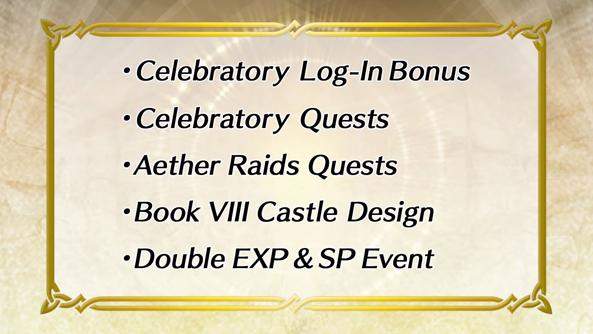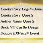 Des événements seront aussi organisés pour fêter la sortie du livre VIII. On pourra bénéficier de bonus de connexion spéciaux pendant 10 jours, ou encore participer à des quêtes dont plusieurs pour le mode Raid céleste permettant d’obtenir des pierres d’éther et des structures liées au livre VIII. Un nouveau style de château sera également disponible gratuitement.