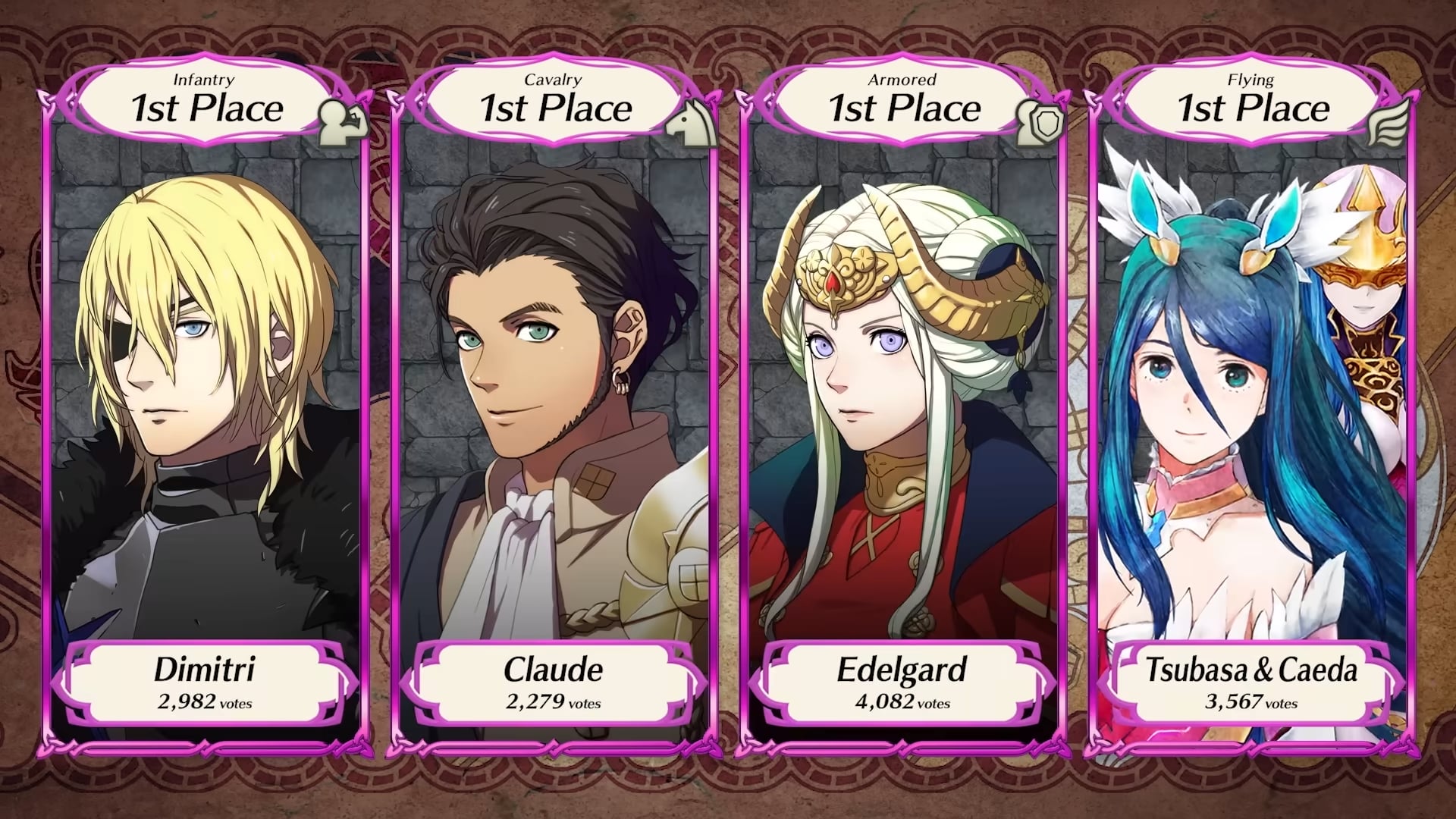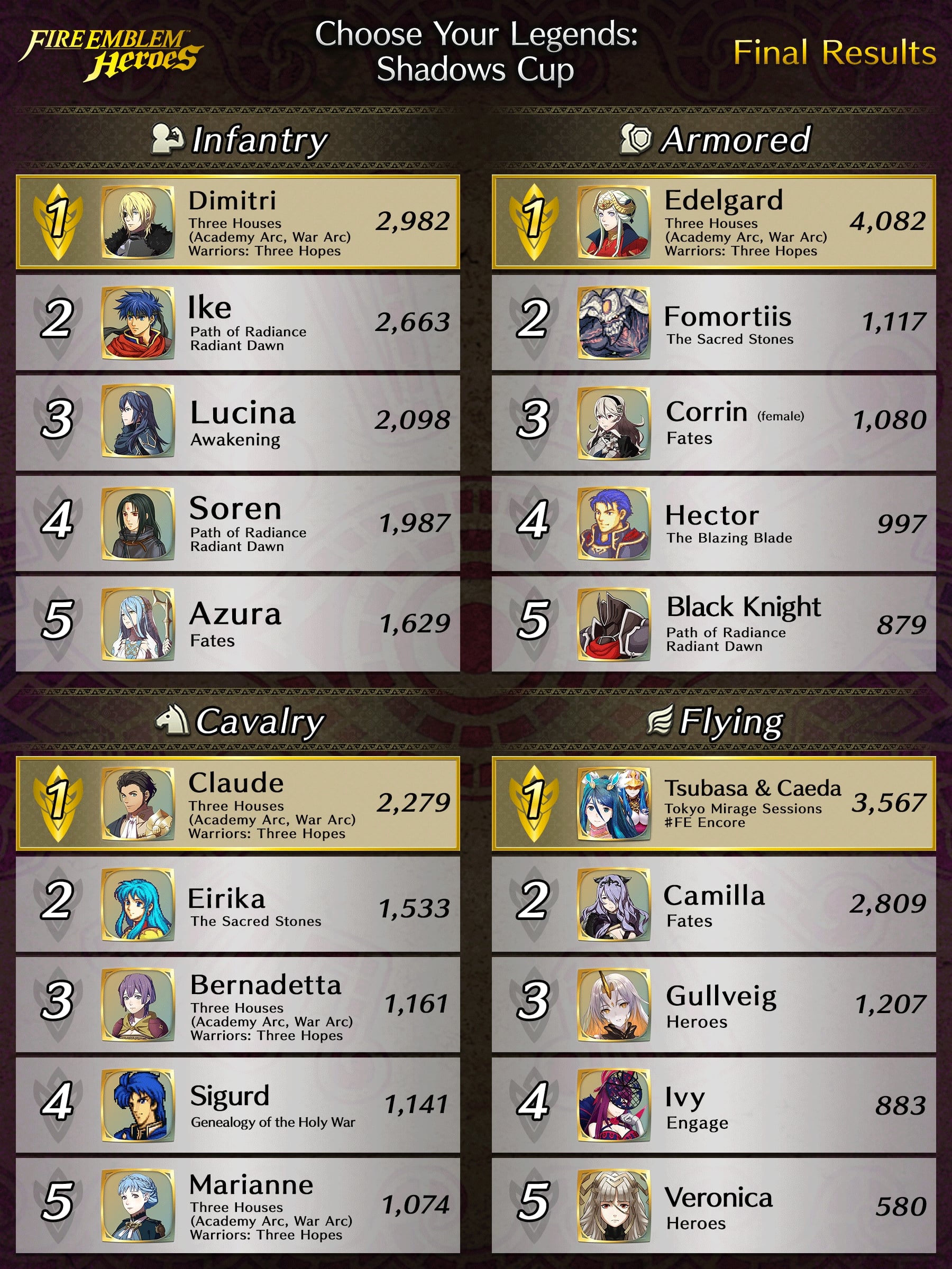 Le nouvel épisode de la chaîne Feh a tout d’abord révélé les personnages ayant reçu le plus de vote au cours de l’événement « Choisissez vos héros : Coupe Shadows ». Il s’agit donc d’Edelgard (armure) de Three Houses avec 4 082 votes, Tsubasa & Shiida (vol) de Tokyo Mirage Sessions #FE avec 3 567 votes, Dimitri (infanterie) de Three Houses avec 2 982 votes et Claude (cavalerie) de Three Houses avec 2 279 votes. Pour rappel, tous les personnages étaient séparés en quatre catégories, correspondant aux quatre types d’unités que l’on trouve dans Fire Emblem Shadows : infanterie, cavalerie, vol et armure. Le personnage en tête de chaque catégorie, qui aura donc récolté le plus de votes, apparaîtra dans Fire Emblem Heroes sous la forme de sa version Shadows dans le futur. Tout d’abord, ce sont Edelgard et Dimitri qui apparaîtront pendant ou après l’automne sous forme de versions de Fire Emblem Shadows dans le jeu. Tsubasa & Shiida et Claude apparaîtront ultérieurement. Les résultats complets de l’événement « Choisissez vos héros : Coupe Shadows » seront accessibles prochainement via ce lien.