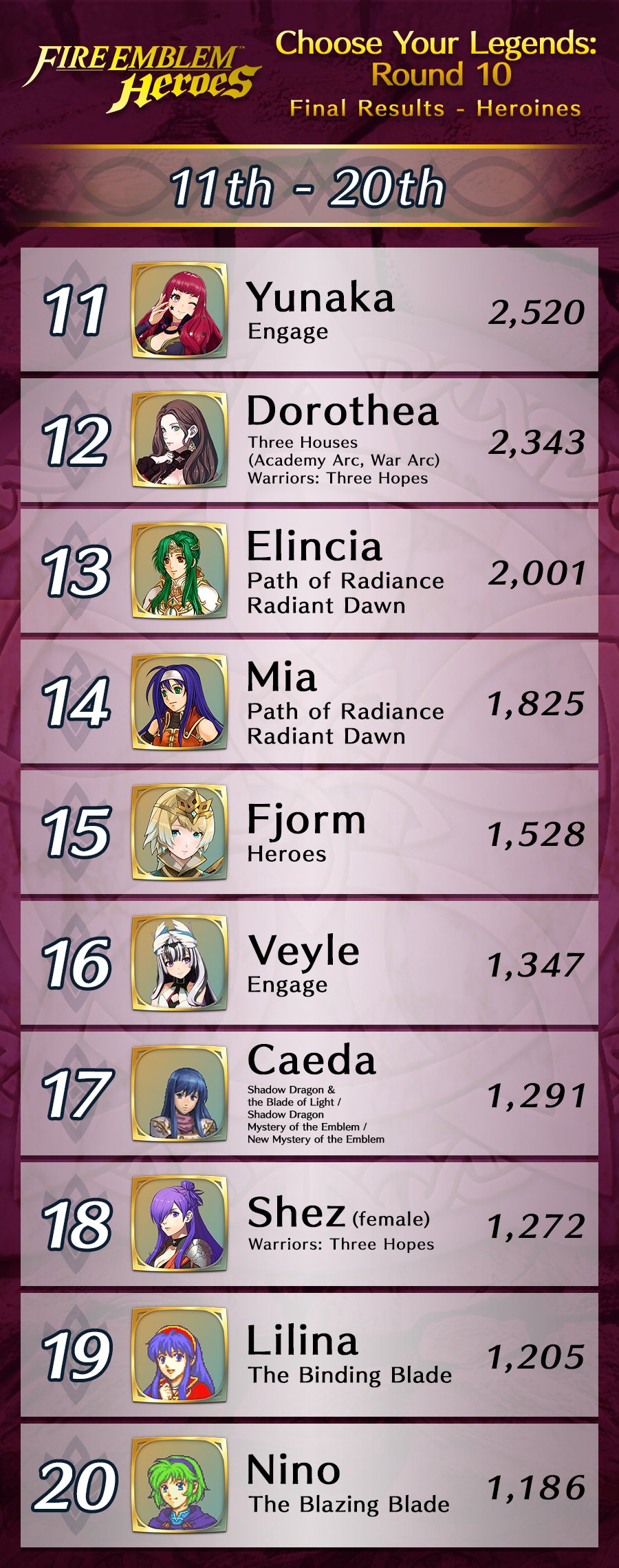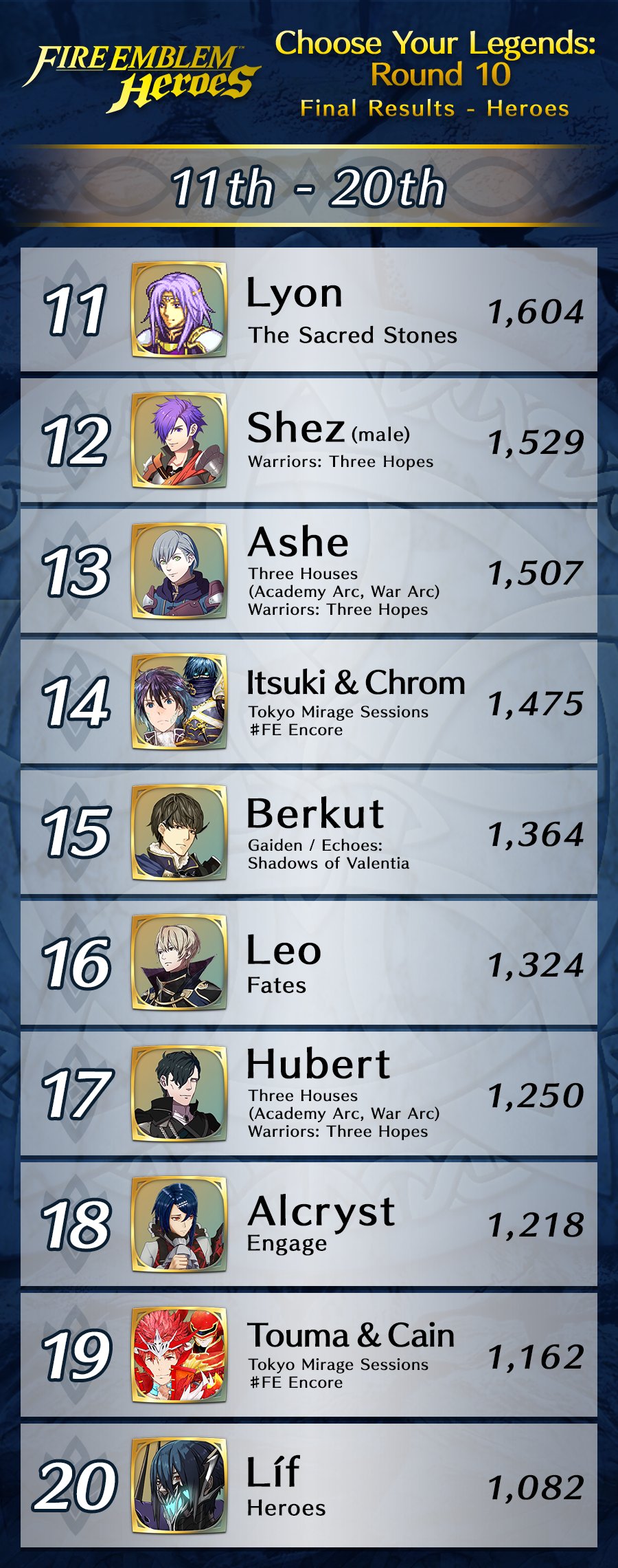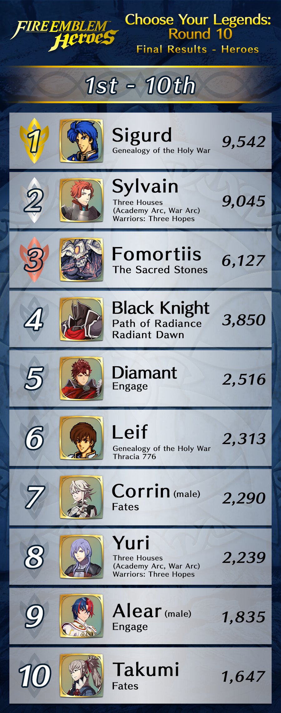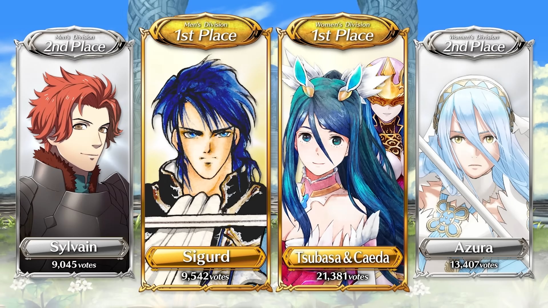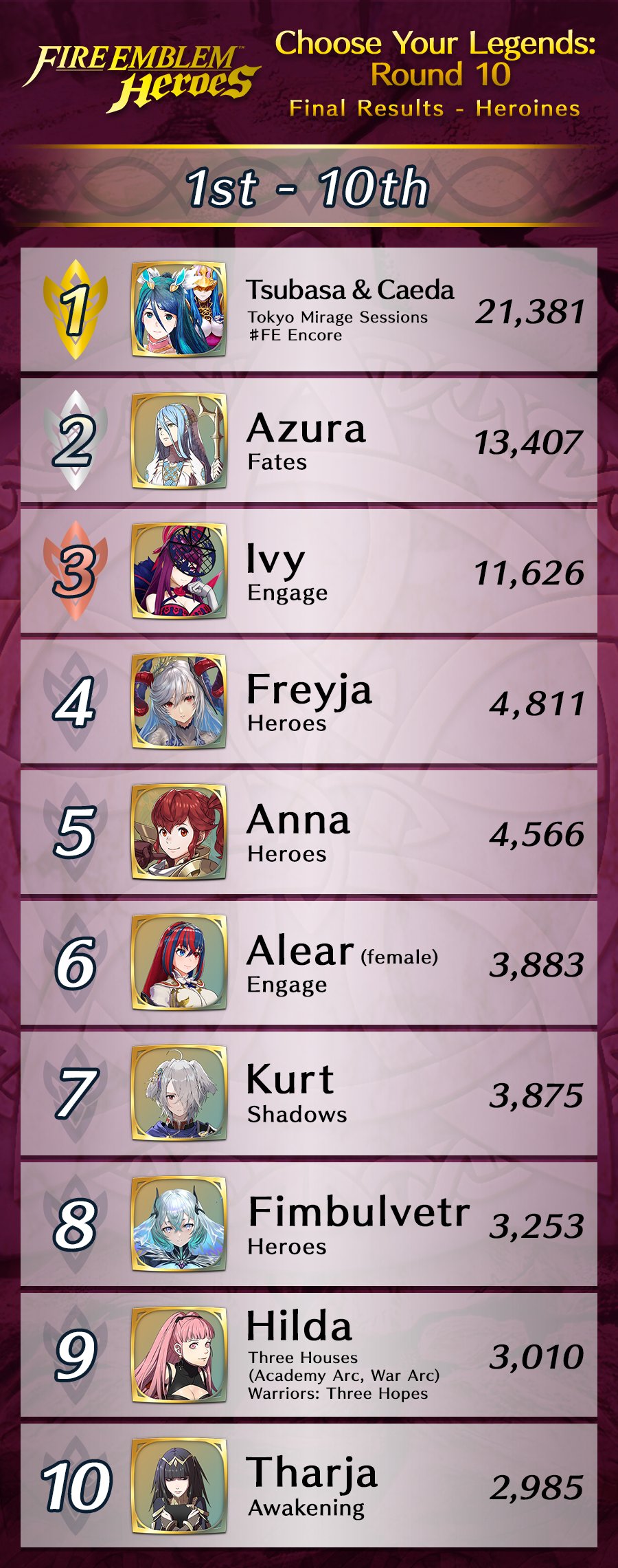 L’événement « Choisissez vos héros n° 10 » s’est terminé le 30 janvier dernier. Les personnages ayant reçu le plus de votes sont donc Tsubasa & Shiida (21 381 votes) de Tokyo Mirage Sessions #FE, Azura (13 407 votes) de Fates, Sigurd (9 542 votes) de Genealogy of the Holy War et Sylvain (9 045 votes) de Three Houses. Ces quatre héros auront droit à une version spéciale, dans un nouveau focus qui sera disponible cet été (certainement en août). Les résultats complets de l’événement « Choisissez vos héros n° 10 » seront accessibles prochainement via ce lien. Vous pouvez découvrir les héros de la précédente édition dans notre article ici.