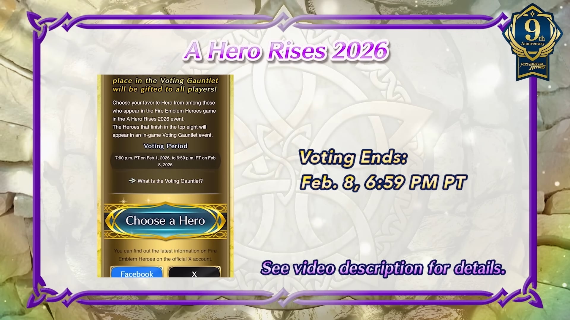 Juste avant le 9e anniversaire de Fire Emblem Heroes, Nintendo et Intelligent Systems ont organisé deux événements « Choisissez vos héros ». L’un d’eux était sur le thème de Fire Emblem Shadows, tandis que l’autre était la dixième édition de l’événement qui a lieu chaque année depuis la sortie du jeu datant du 2 février 2017. Les résultats de ces deux événements ont été annoncés par le biais d’un nouvel épisode de la chaîne Feh ainsi que sur les comptes Twitter et Facebook officiels de Fire Emblem Heroes. De plus, des célébrations pour le 9e anniversaire ont été présentées et un focus spécial avec des personnages de Fire Emblem Engage a été révélé. La vidéo détaille également des changements effectués dans le cadre d’une nouvelle mise à jour qui devrait arriver dans la matinée du 4 février 2026 et montre plusieurs illustrations réalisées par des artistes ayant travaillé ces derniers mois sur Fire Emblem Heroes dans le cadre du 9e anniversaire. Voici la vidéo complète de l’épisode de la chaîne Feh en anglais (sous-titrée en français) et japonais ainsi qu’un récapitulatif de toutes les annonces :