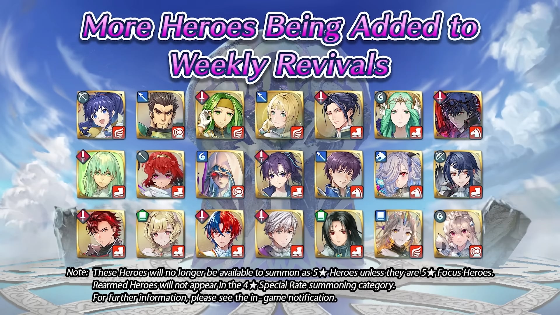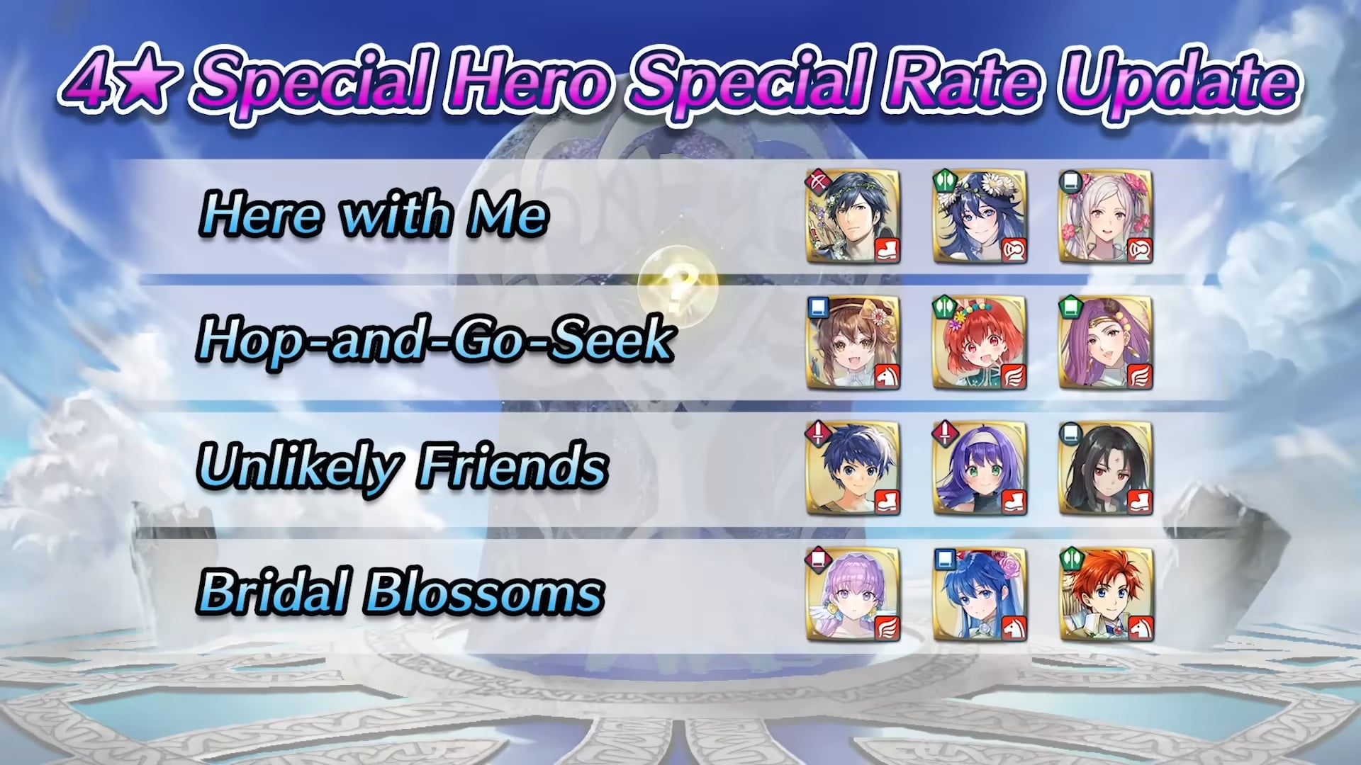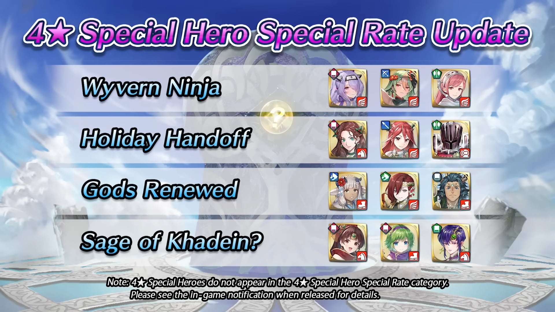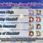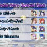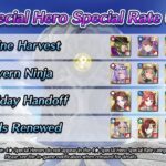 D’autres événements spéciaux verront le jour dans les prochains mois. Comme pour les focus Festival du printemps, vive les mariées, l’été ylissien, l’été nohrien, spectacle vivant, Sinistre moisson, festival de l’hiver, bonne année !, L’amour toujours, Lapins printaniers, C’est le bouquet, Voilà l’été, Un été artistique, Fête en Hoshido, Le don de la terre, Cadeaux de l’hiver, Nouvel an du feu et de la glace, La source des héros, Les fidèles de Greil, Lapins royaux, Pique-nique idéal, Joie nuptiale, Retour de l’été, Réveil estival, Soirée splendide, Récolte monstre, Glorieux cadeaux, Esprit renouvelé, Jolis cadeaux, fête en famille, La genèse, Mariés aimés, Été éphémère, Souvenirs marins, fierté pirate, rêve infini, Moisson de dragon, Moment présent, miracle du festival, Nouvel An : héros spéciaux ω, Rituels du désert, Amour d’un roi, Lapins entêtés, Réunion d’enfance, Grâce nuptiale, lueur d’été, rêve d’un jour d’été, Mers périlleuses, héritiers des douze, Abondance partagée, entraînement ninja, Rêve hivernal, Tel un mécanisme, Royaumes perdus, Ici à mes côtés, Lapine chercheuse, Amitié improbable, fleurs nuptiales, Vacances d’été, soumis à la marée, Chasse au trésor, Feu aux poudres, Divine moisson, ninjas et wyvernes, mission festive, Nouvel An divin, Sage de Khadein ?, un cadeau spécial, printemps éternel, peu importe le lieu, rêves nuptiaux, désir estival, été initiatique, Prendre le thé, offrandes du vent, marché d’automne, un avenir commun, leçons festives, Voici le Nouvel An, bouclier de Nabata, pour toujours, sieste idéale, vision double, futures mariées, un été animé, l’amour de la mer, timide à l’épreuve, invitation glaciale, guide du festival, ninjas en famille, soif de générosité, Joyeuses fêtes !, guerriers de sable, chercher et trouver, anciens partis pris, moment de joie, piété en été, un nouveau moi, douce dégustation, tournoi en famille, futur altéré, ninjas temporels, cadeaux à volonté, Nouvel An mortel et timidité guérie, il se peut que ces héros spéciaux apparaissent à nouveau dans d’autres événements d’invocation (les événements d’invocation de héros légendaires ou mythiques par exemple) avec un rang différent et leur taux d’apparition pourrait être plus élevé.