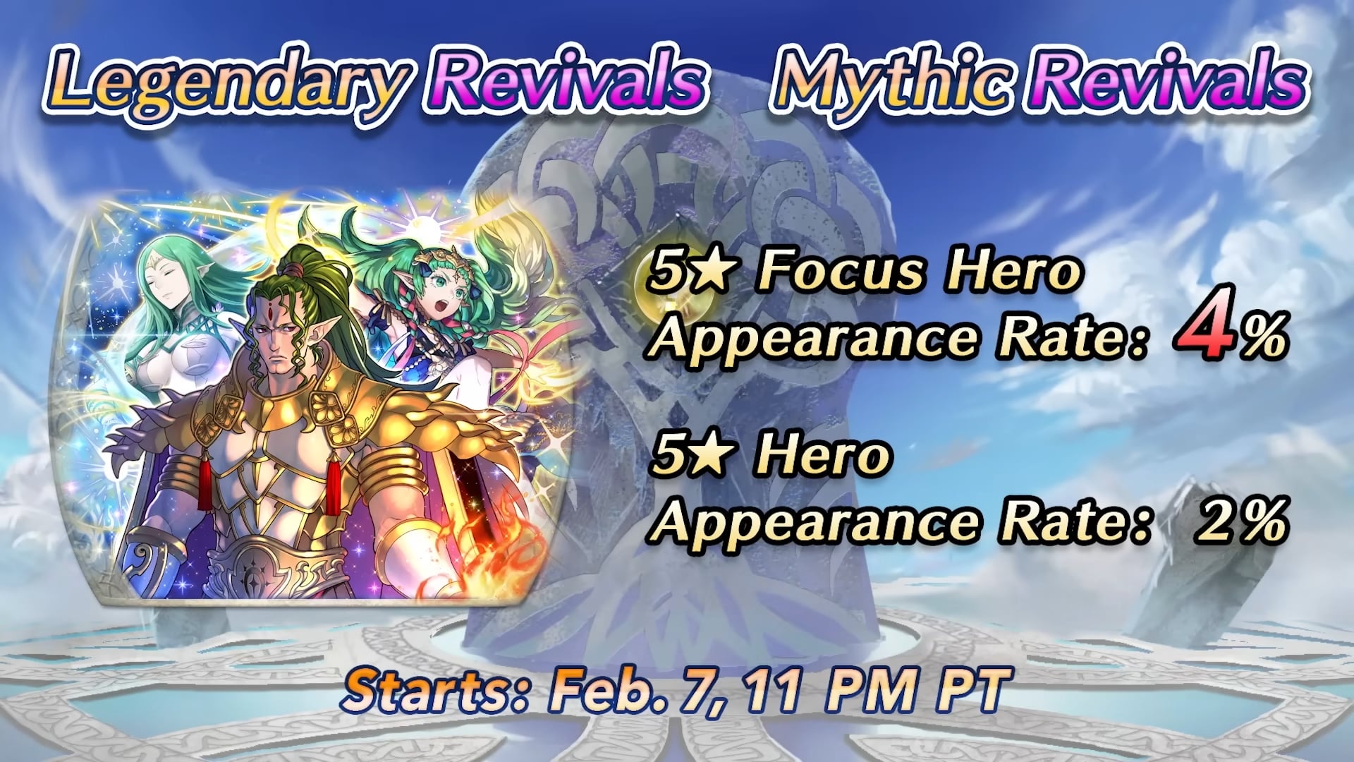 De plus, un focus regroupant les héros occupant les 8 premières places du tournoi aura également lieu fin février. Le taux d’apparition initial des héros du focus sera de 6 % ! (Celui des héros 5★ normaux sera de 0 %.) Nous espérons que vous avez hâte de recruter encore plus de héros en tant qu’alliés !