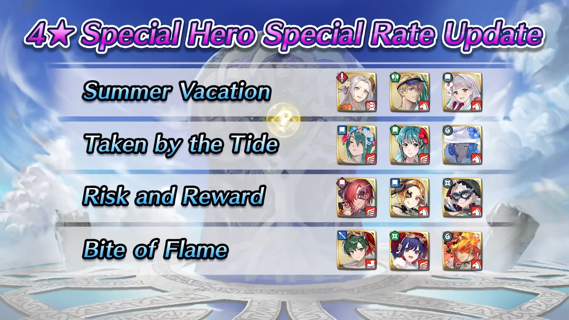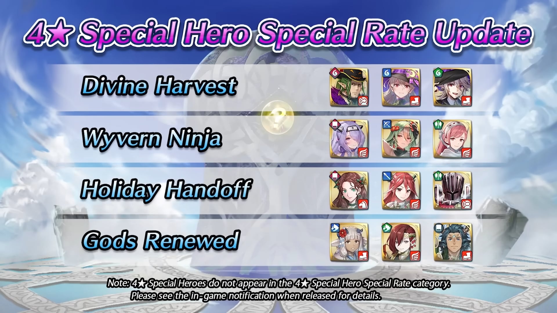 Une modification pour le fonctionnement des invocations a également été annoncée. 39 héros spéciaux apparus entre les versions 6.2 et 7.1 seront ajoutés à la catégorie Taux héros spéciaux 4★. Ce taux sera aussi actif dans les événements d’invocation dans lesquels ces héros sont initialement apparus. Leur taux d’apparition sera doublé et atteindra ainsi 6 %.